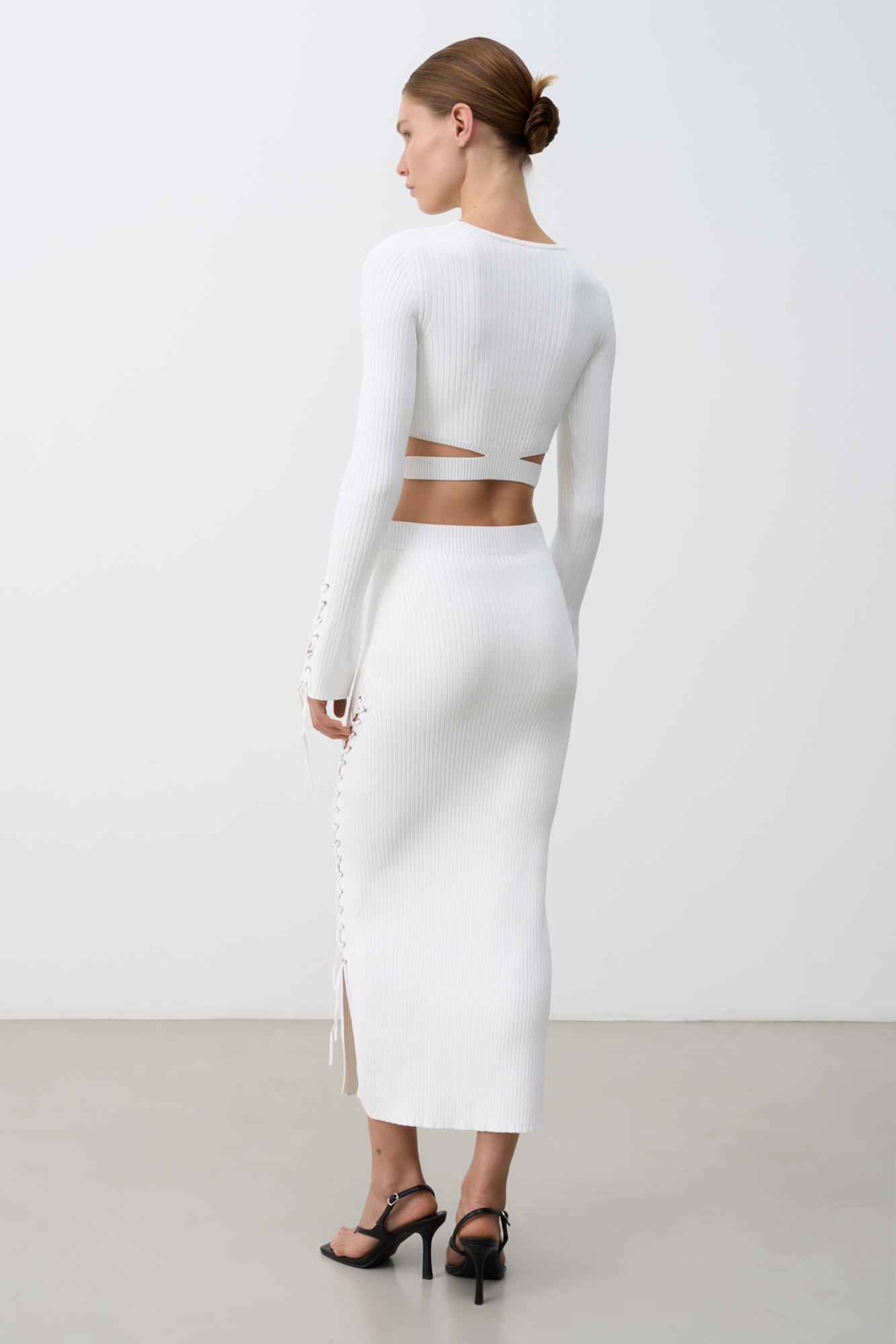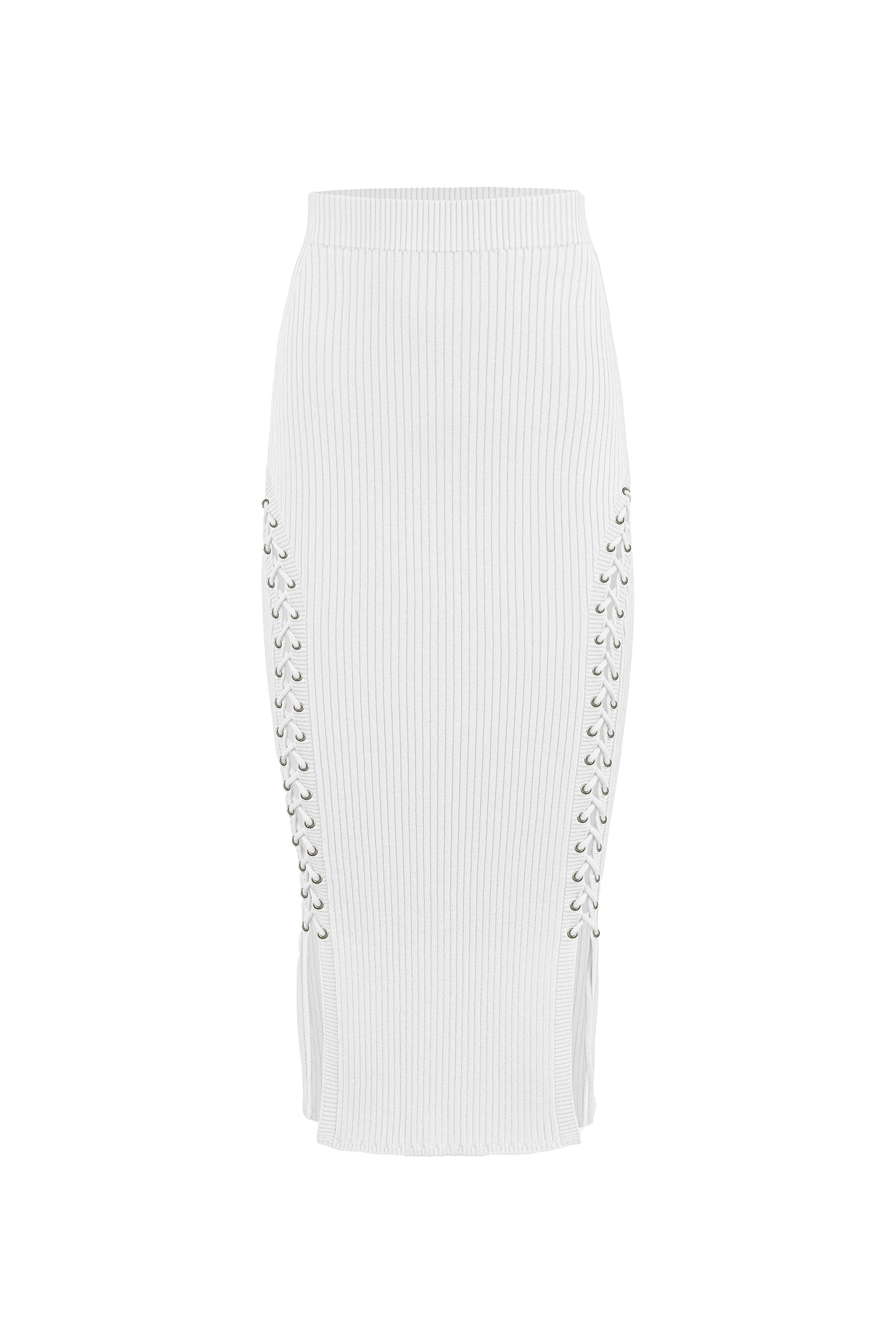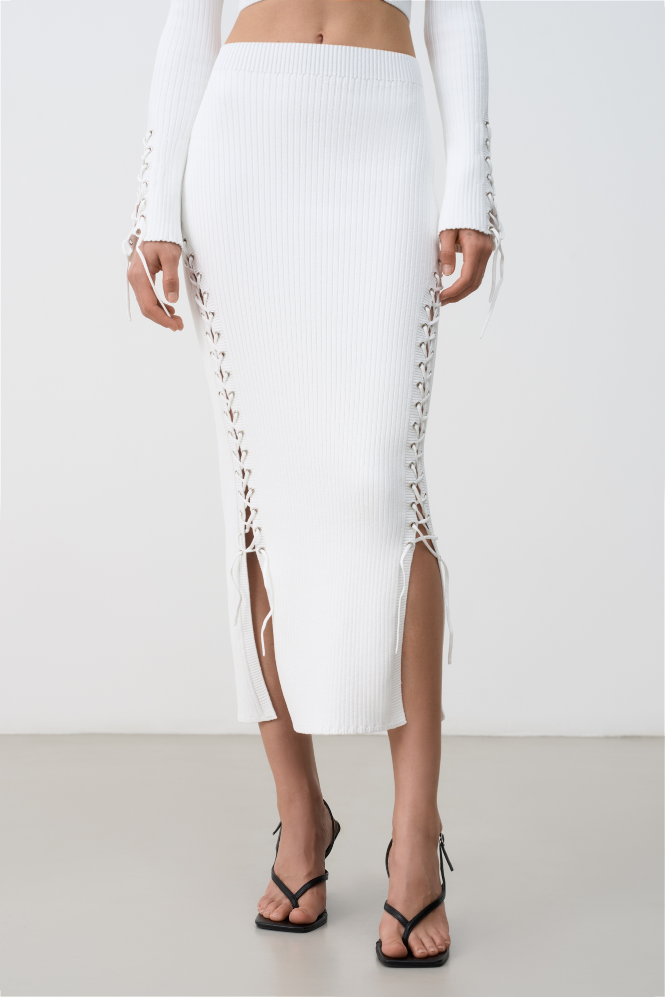 Трикотажная юбка длины миди из вискозы. Модель приталенного силуэта с эластичным поясом. Симметричная шнуровка по бокам. Дополнить образ можно топом в таком же стиле.