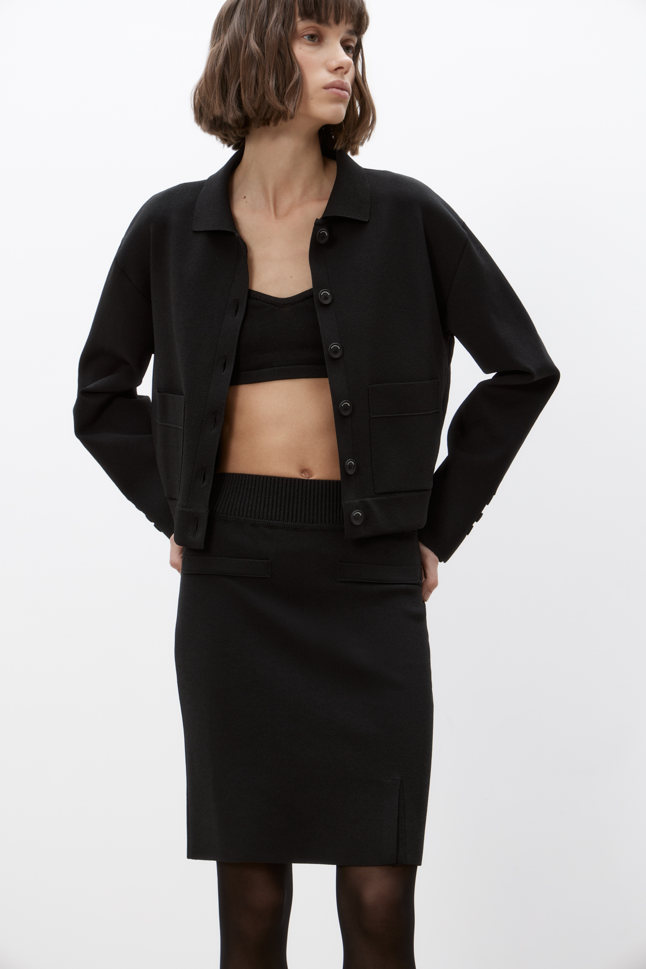 Классическая трикотажная юбка длины мини из вискозы с добавлением эластана. Модель приталенного силуэта с эластичным поясом на резинке и карманами. Изделие декорировано небольшим разрезом спереди.