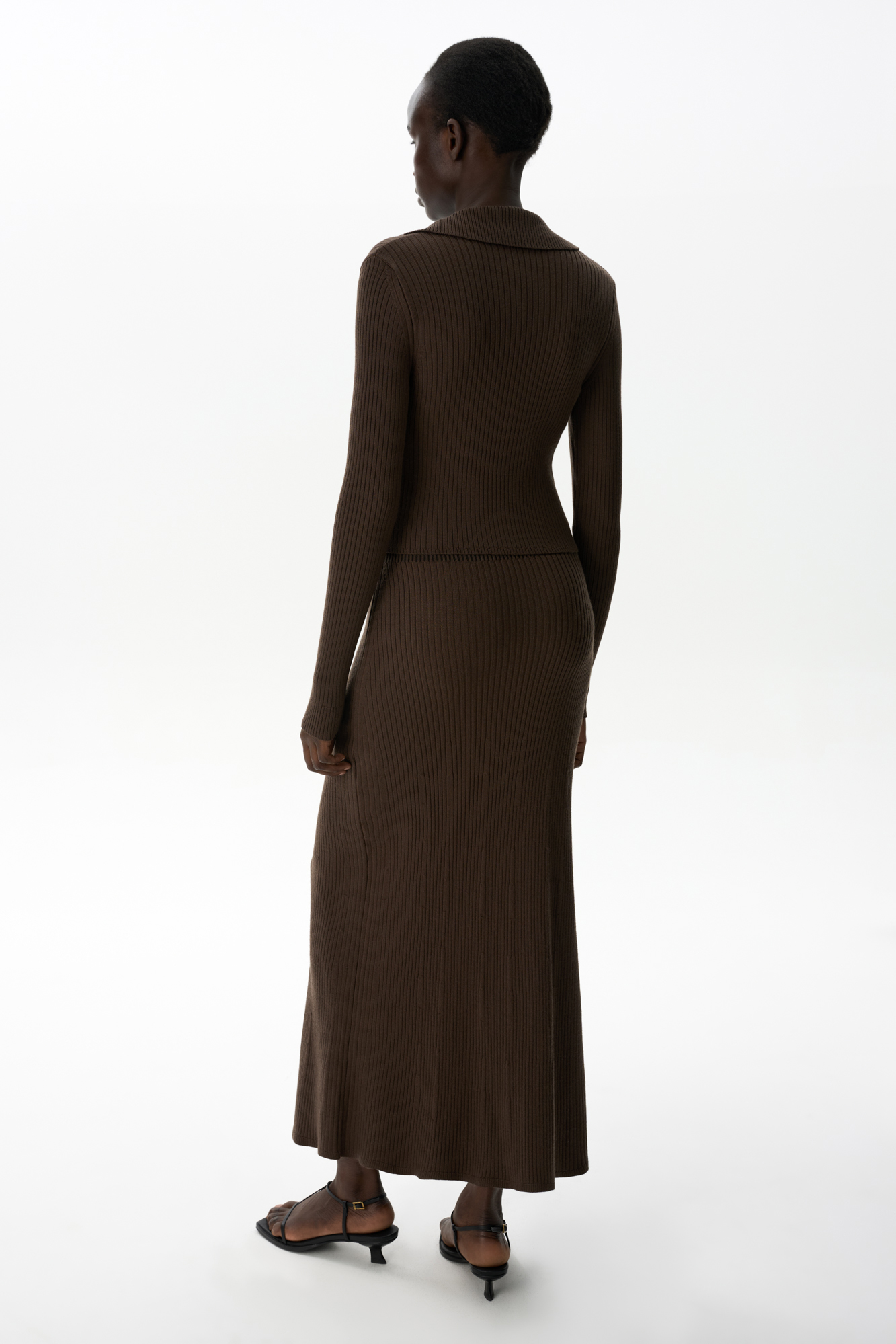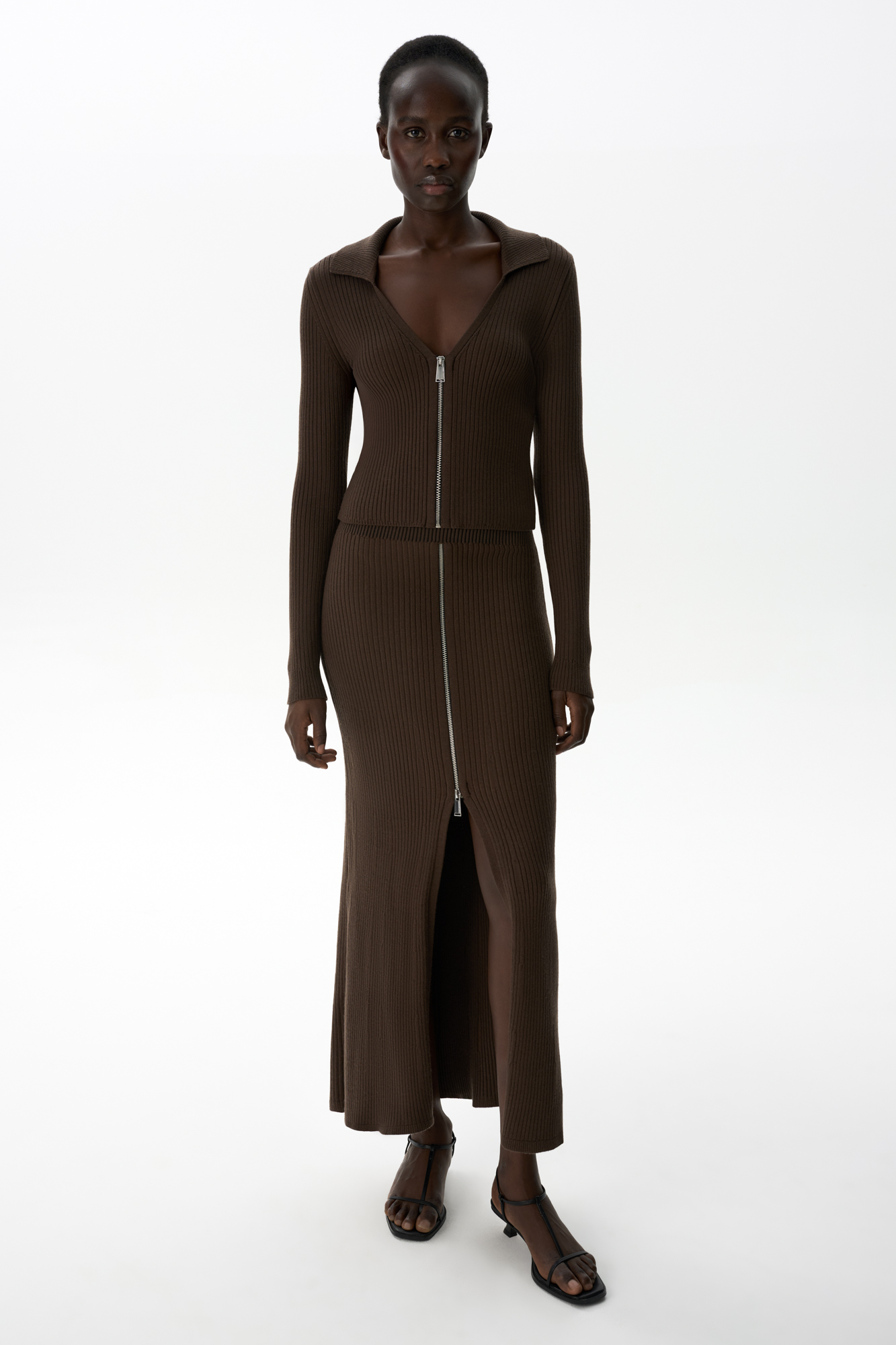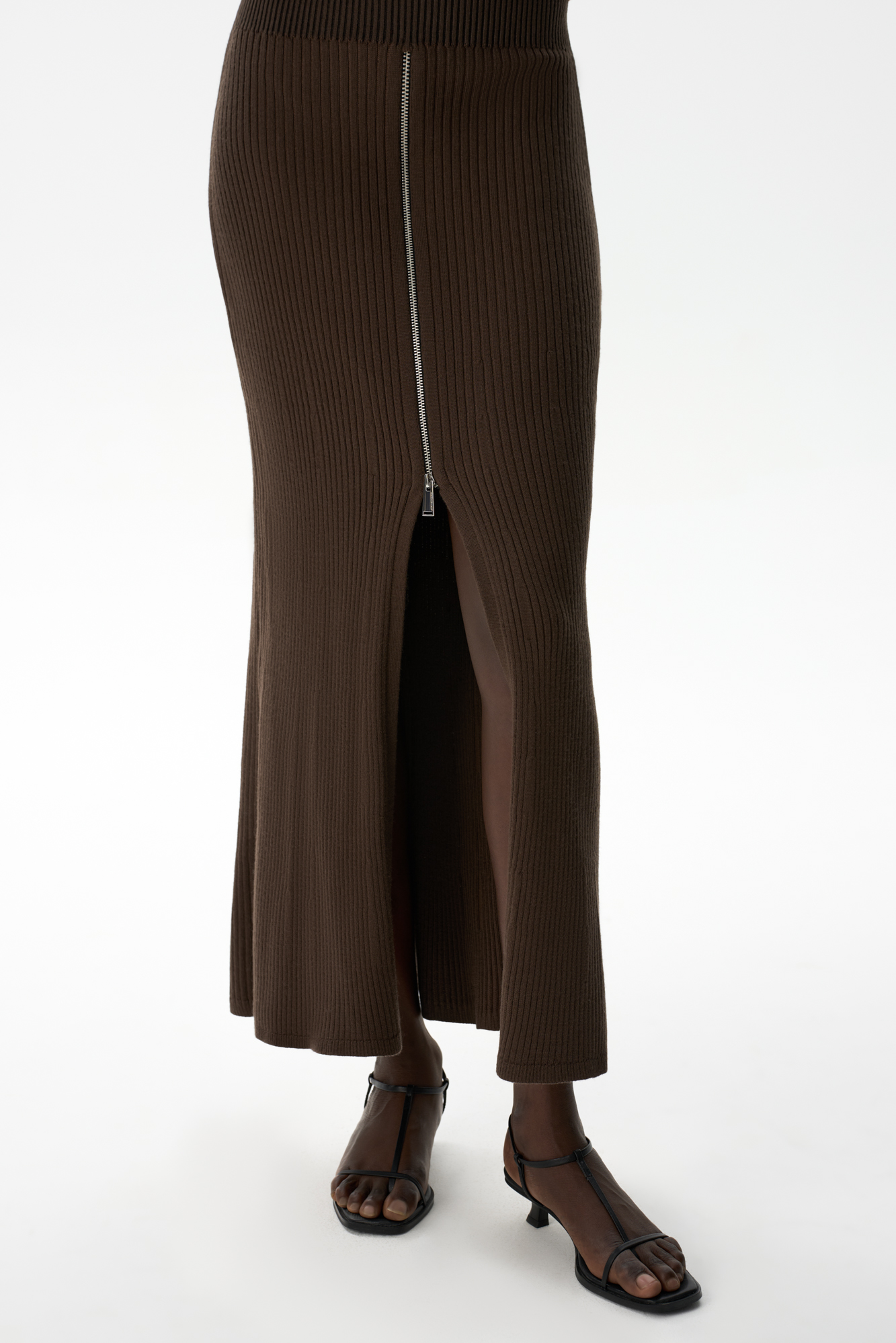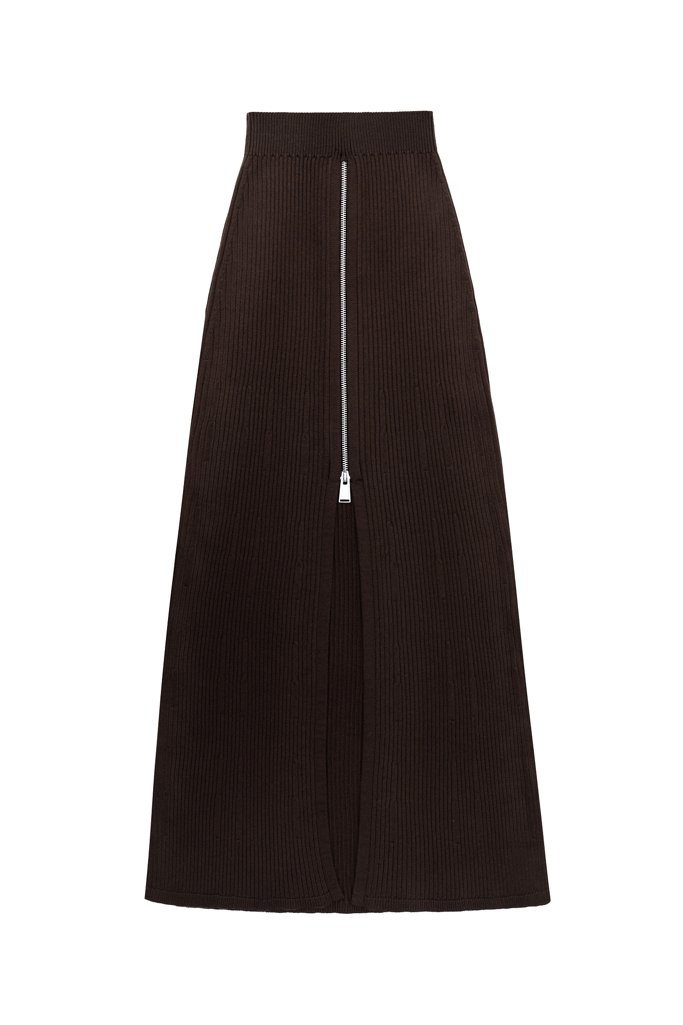 Трикотажная юбка длины миди с разрезом спереди. Модель трапецивидной формы с эластичным поясом в рубчик и застежкой на молнию.