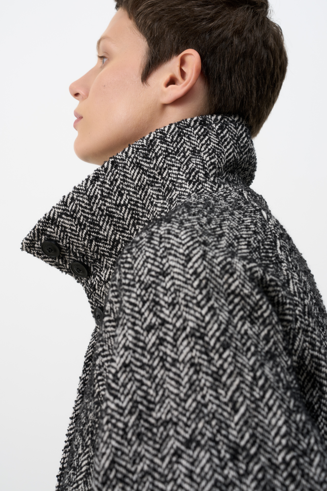 Шерстяной бомбер oversize с воротником-стойкой. Подплечники и боковые карманы . Длинные рукава с манжетами на резинке. Застежка на пуговицы. На подкладке.