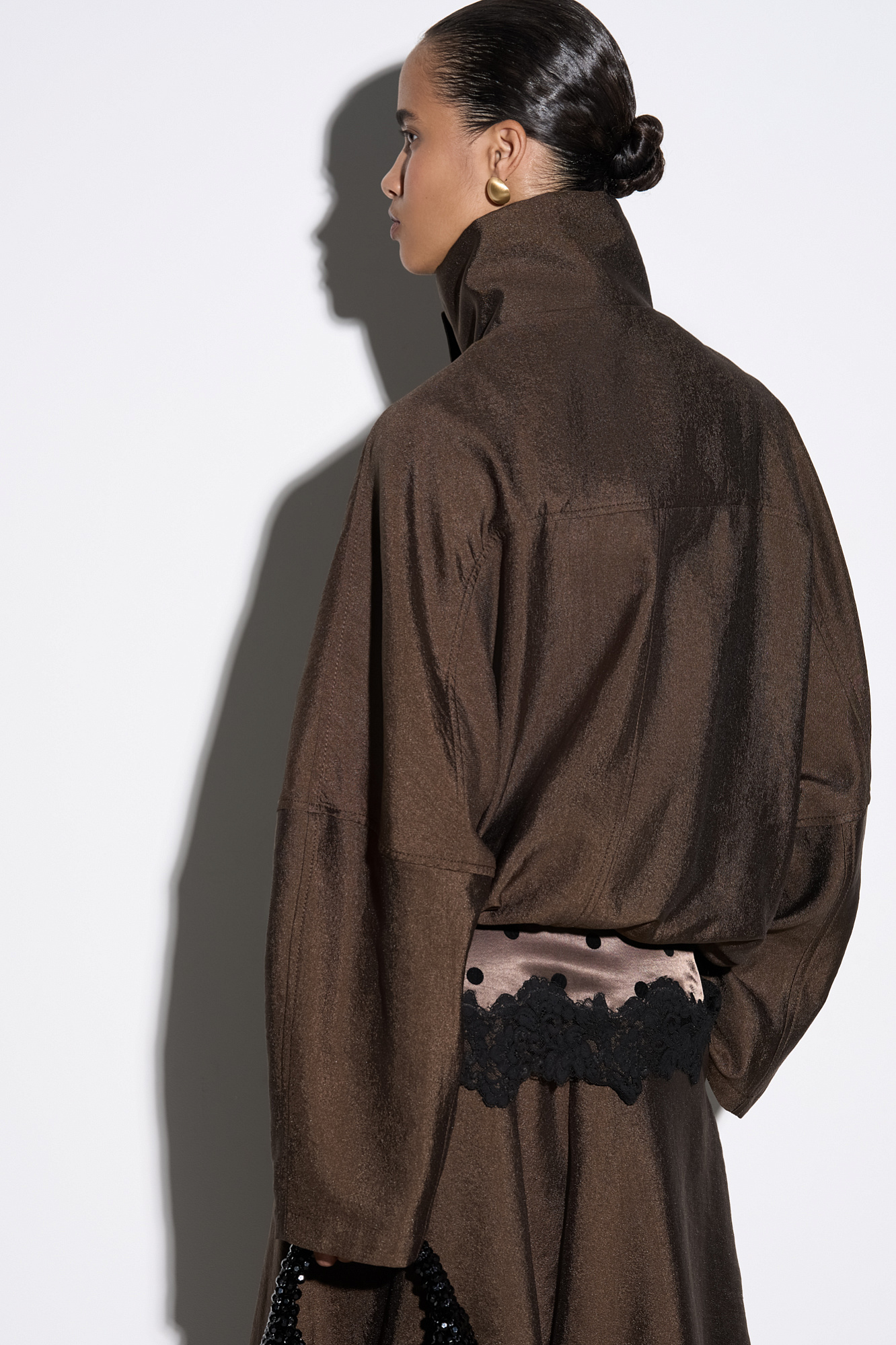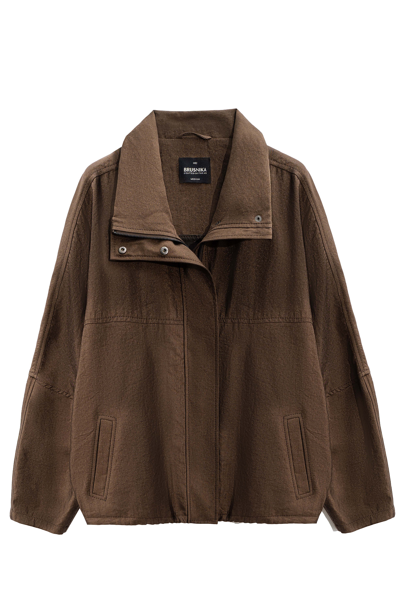 Бомбер из вискозы с воротником-стойкой. Модель свободного силуэта со спущенной линией плеча и боковыми карманами. Низ изделия выполнен на резинке. Застежка на молнию под планкой с кнопками.