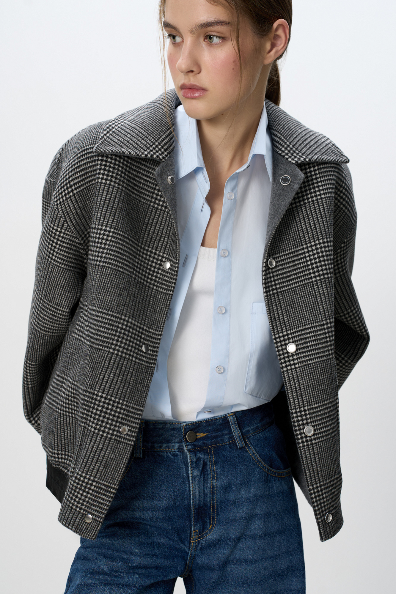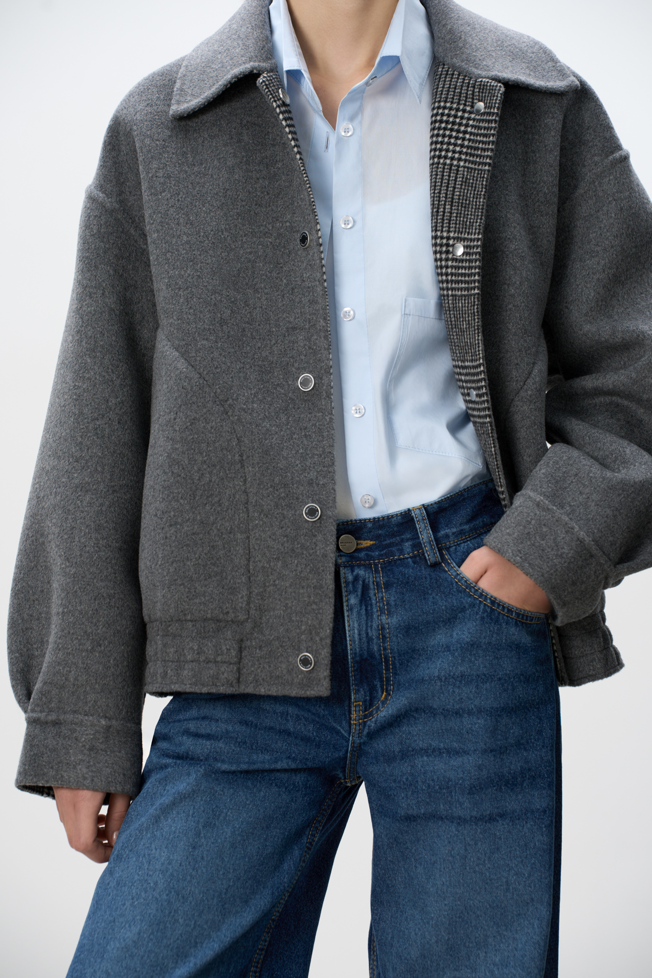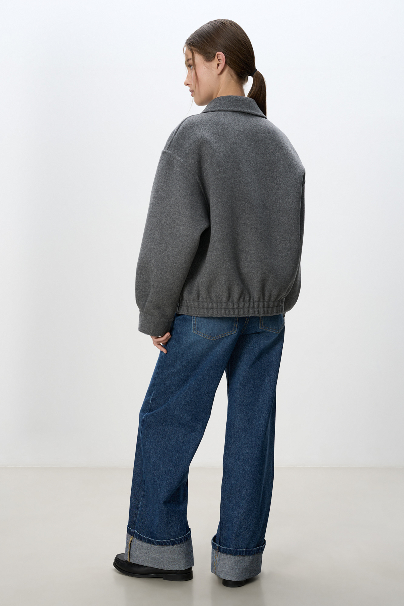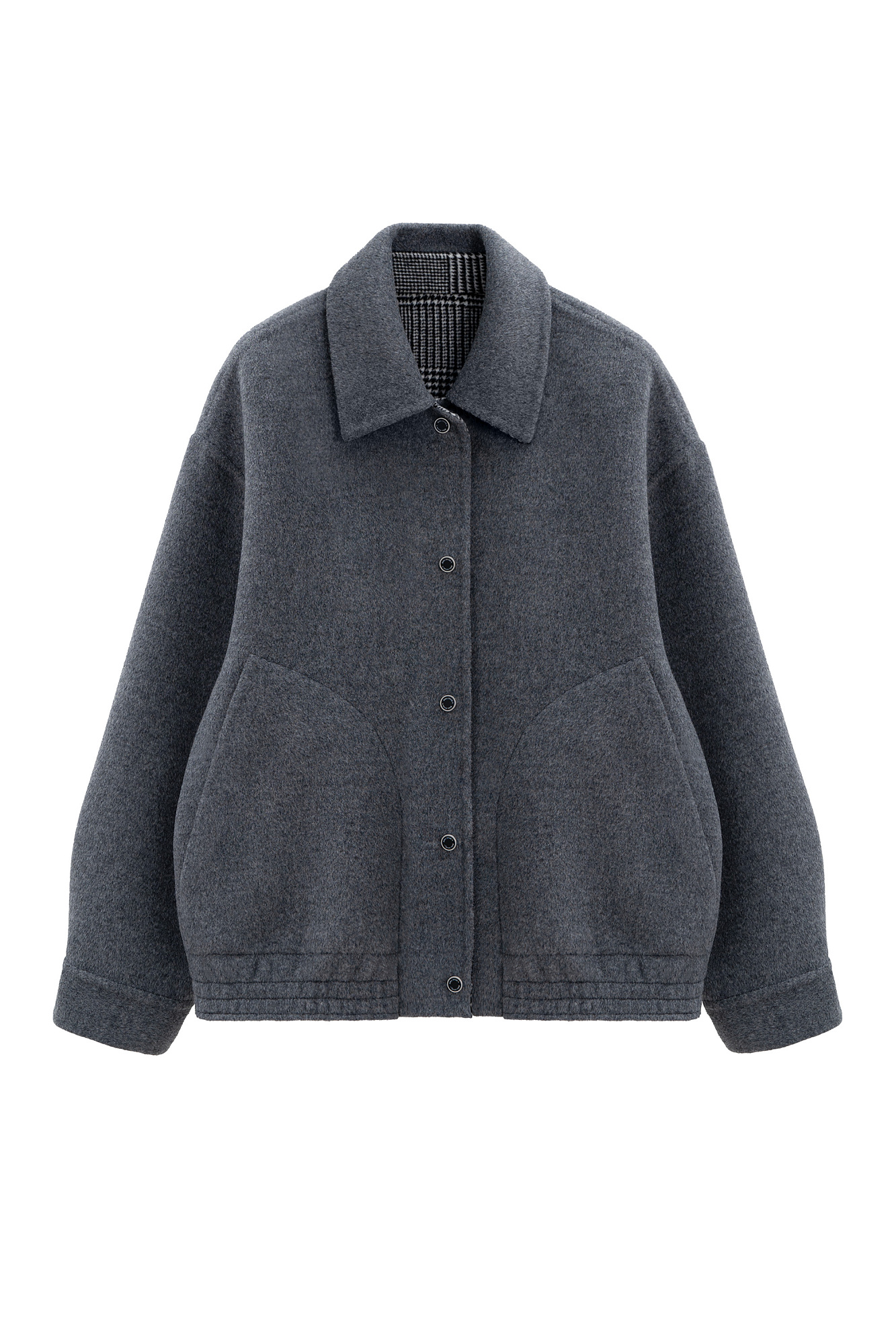 Двусторонний бомбер из 100% шерсти. Модель прямого свободного силуэта со спущенной линией плеч, отложным воротником и двумя накладными карманами. Застежка на магнитные кнопки.
