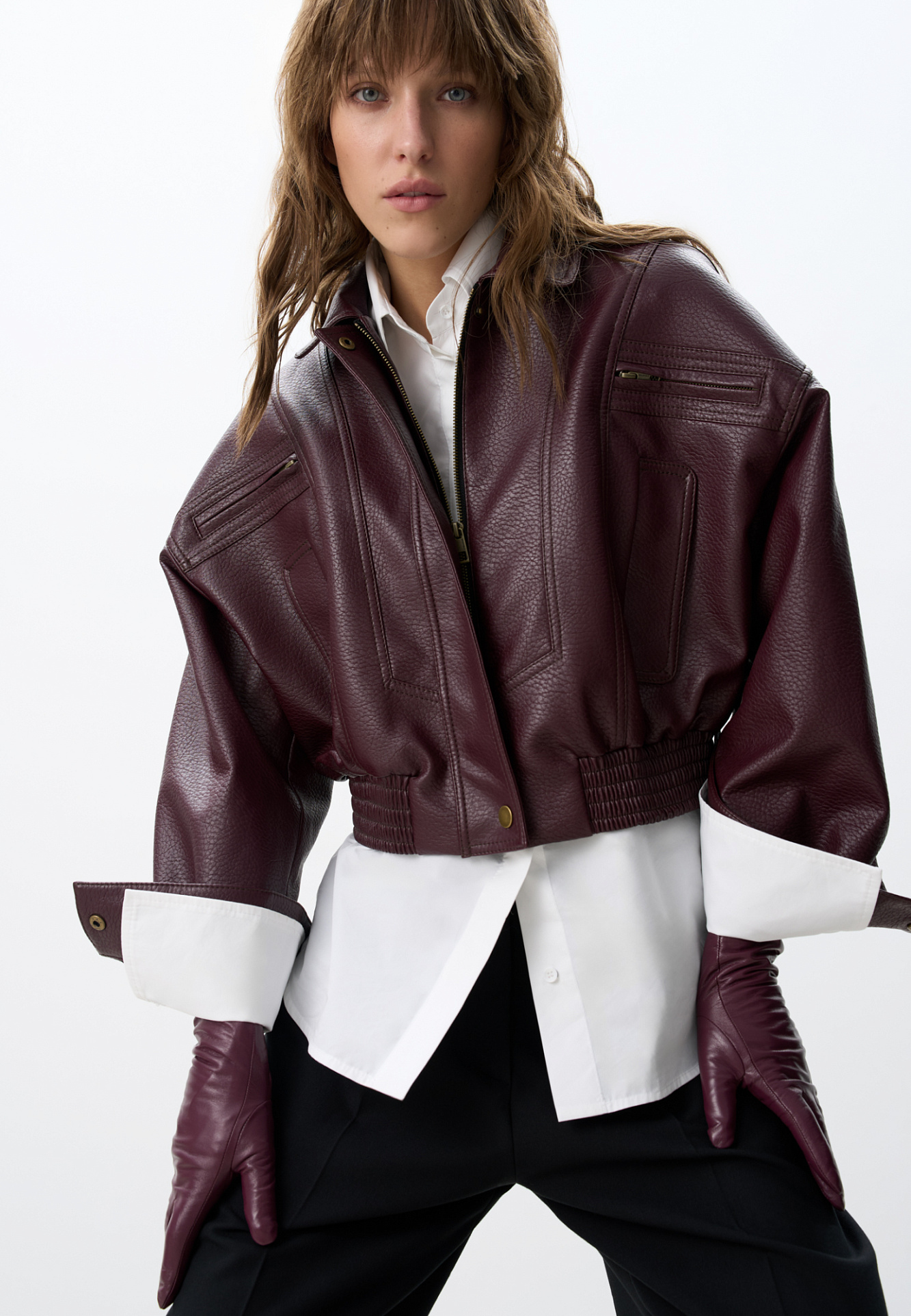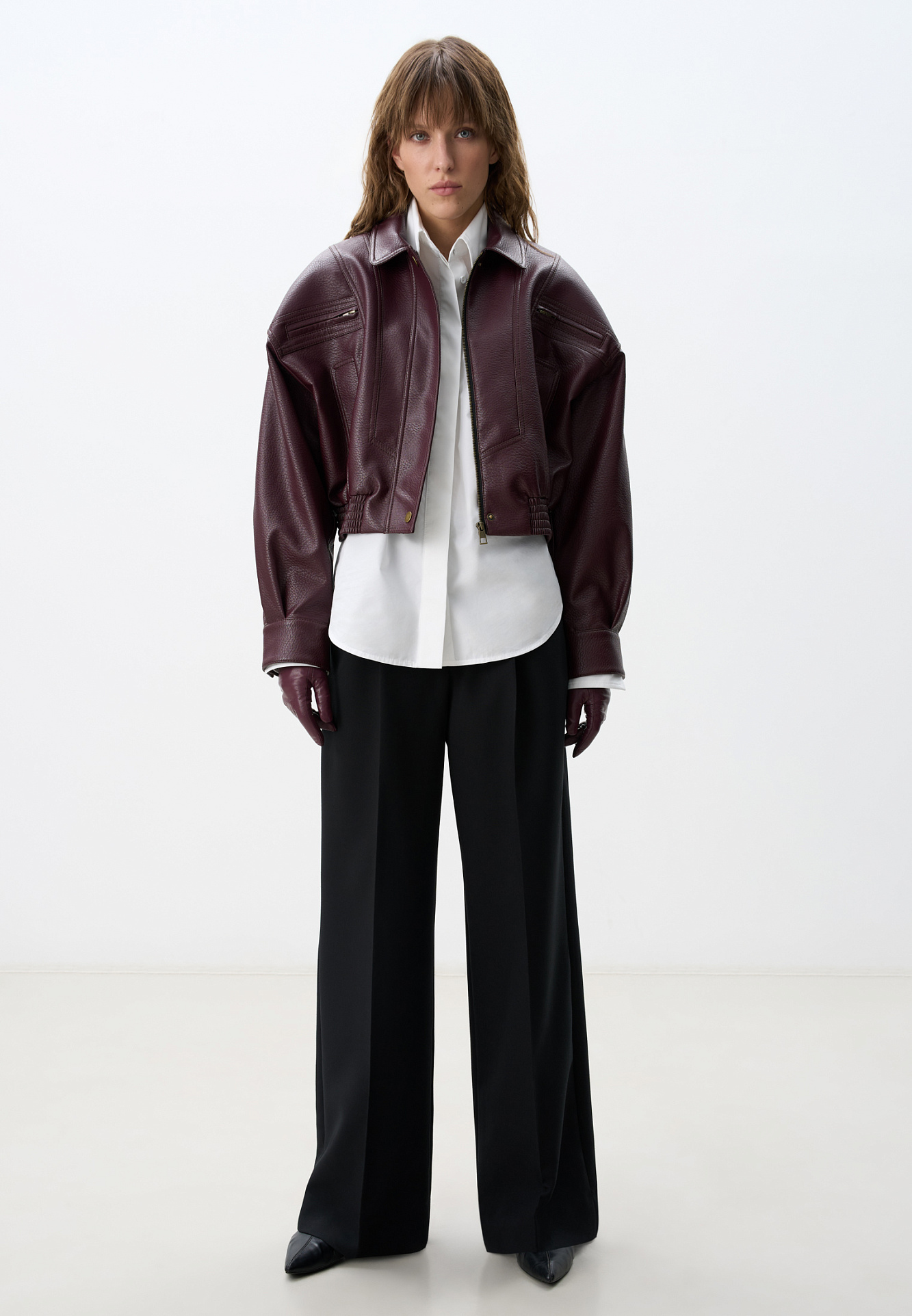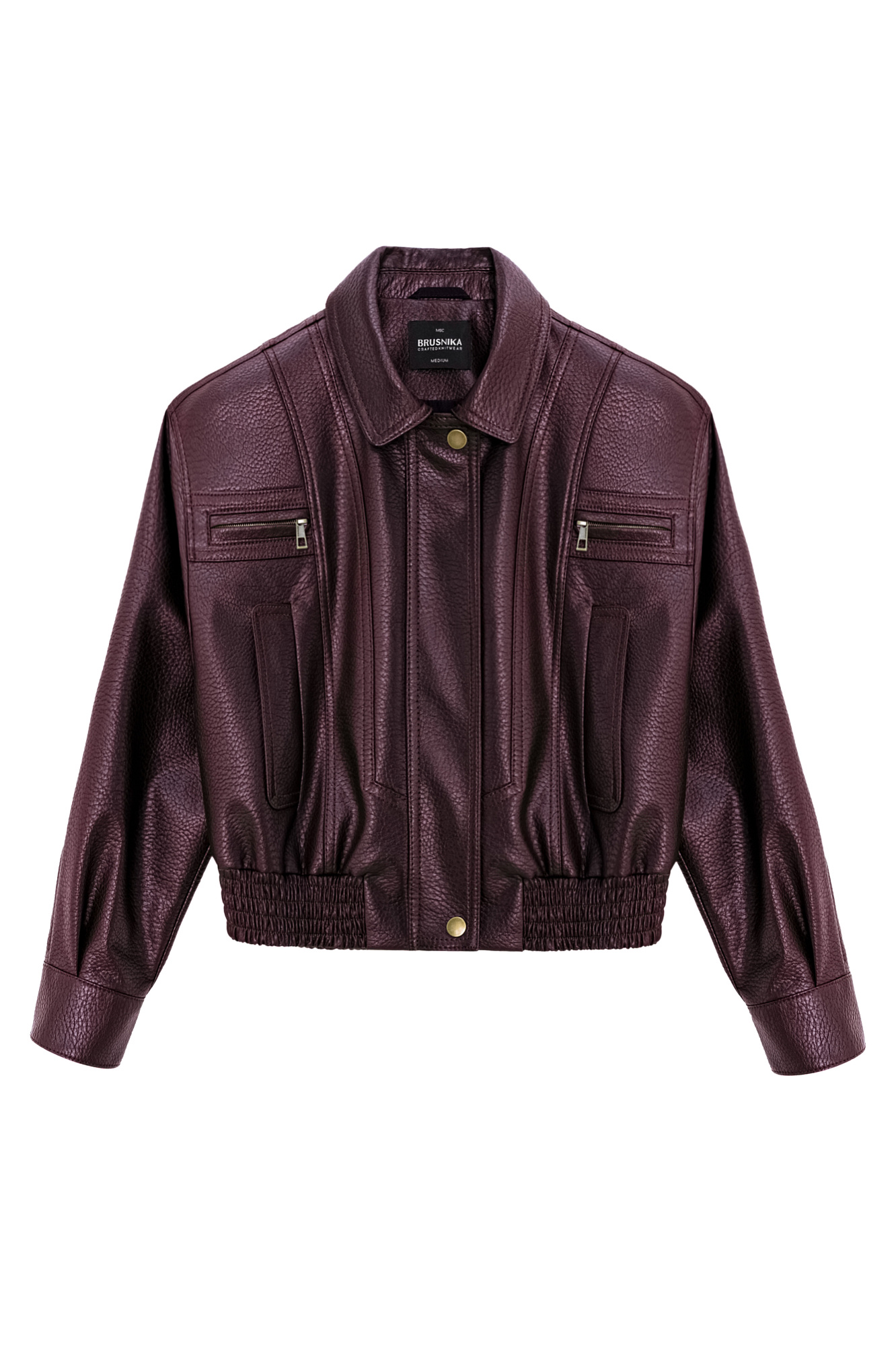 Укороченный бомбер из экокожи.Модель свободного силуэта с длинными рукавами, с воротником и двумя нагрудными карманами. Застежка на молнию. Изделие на подкладке.