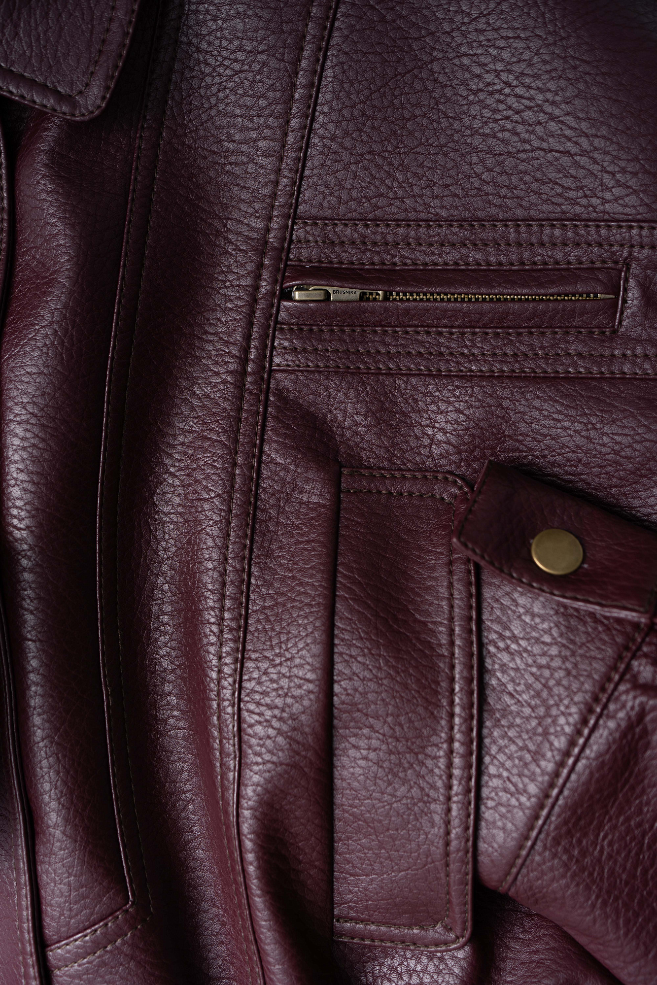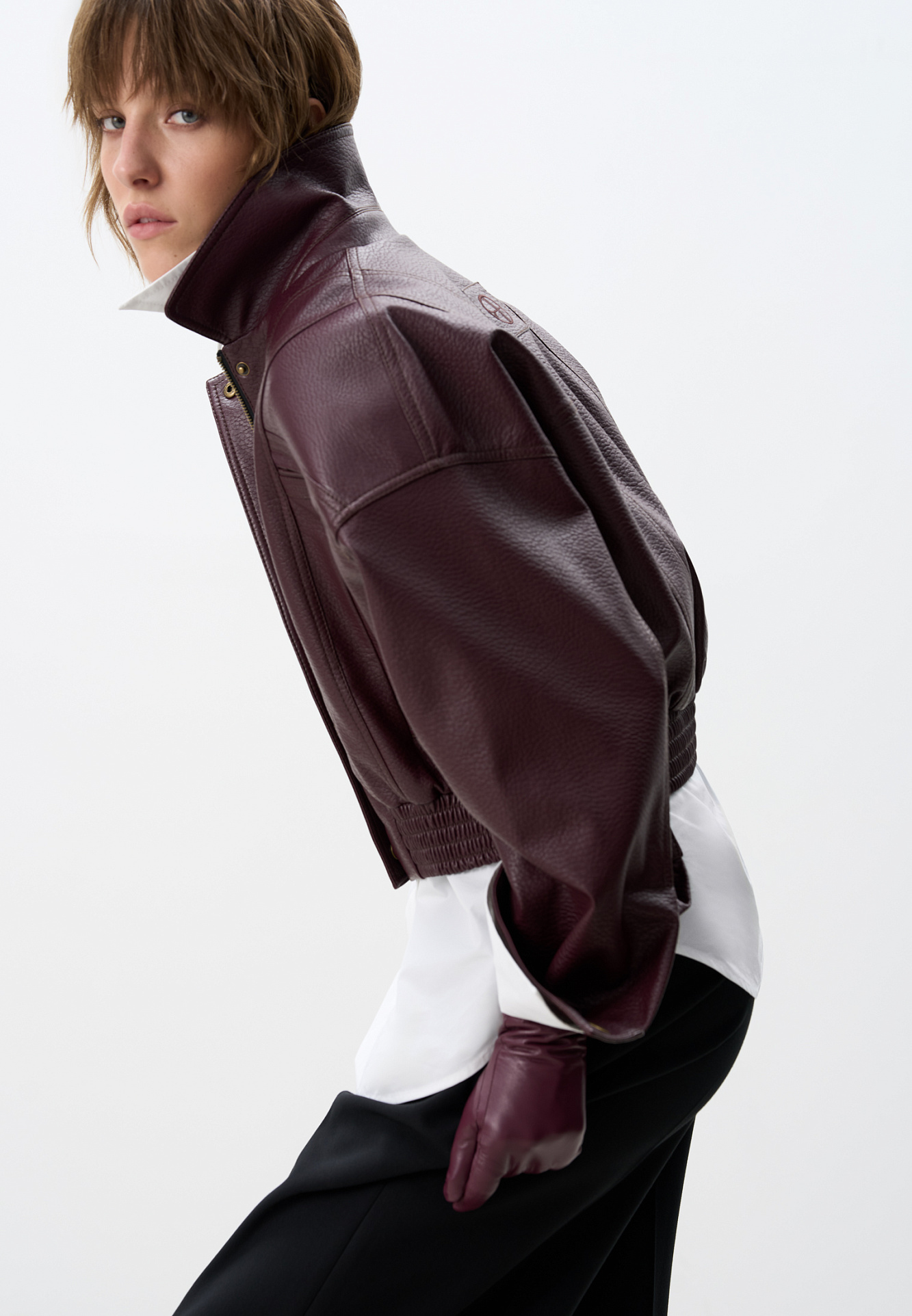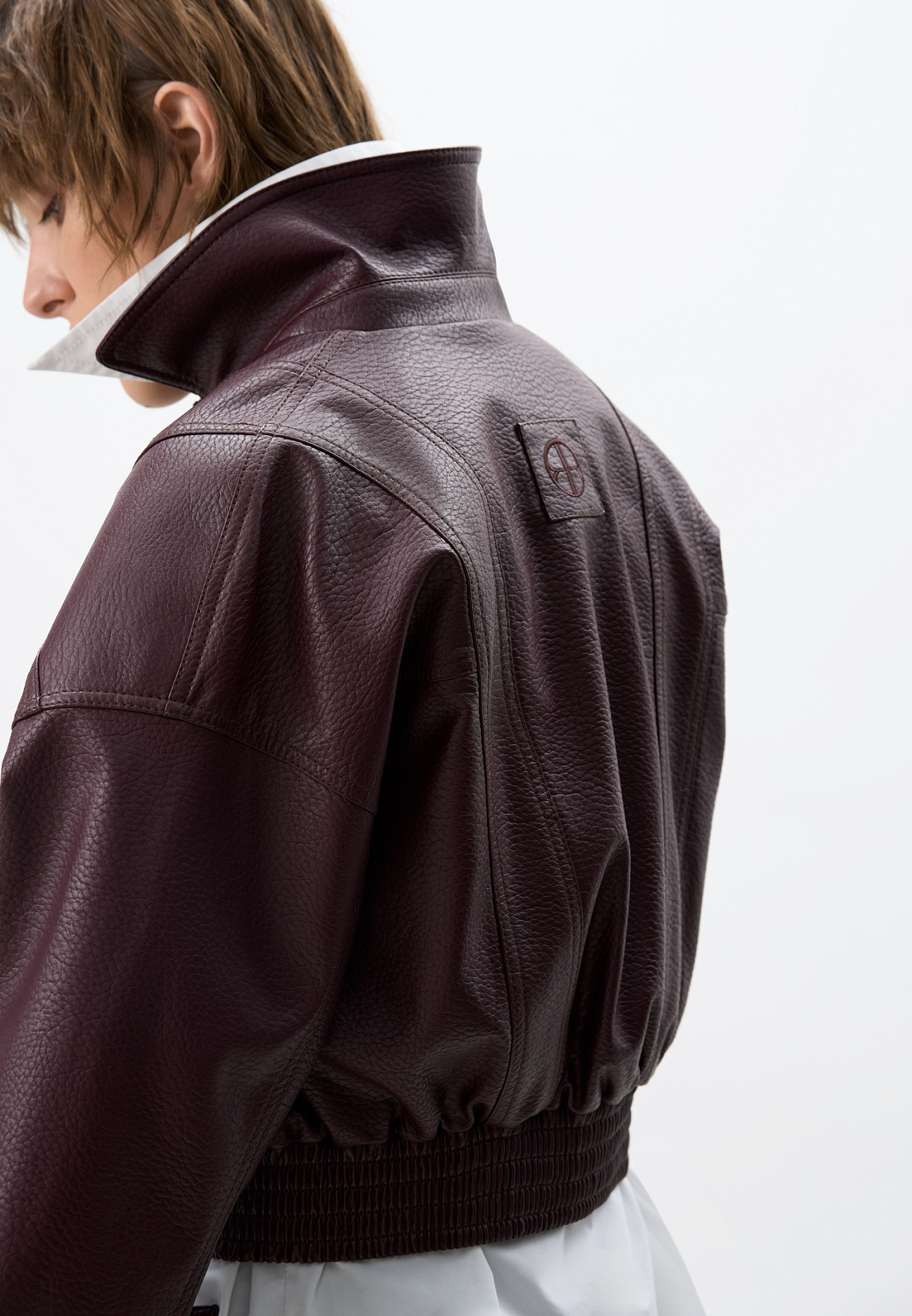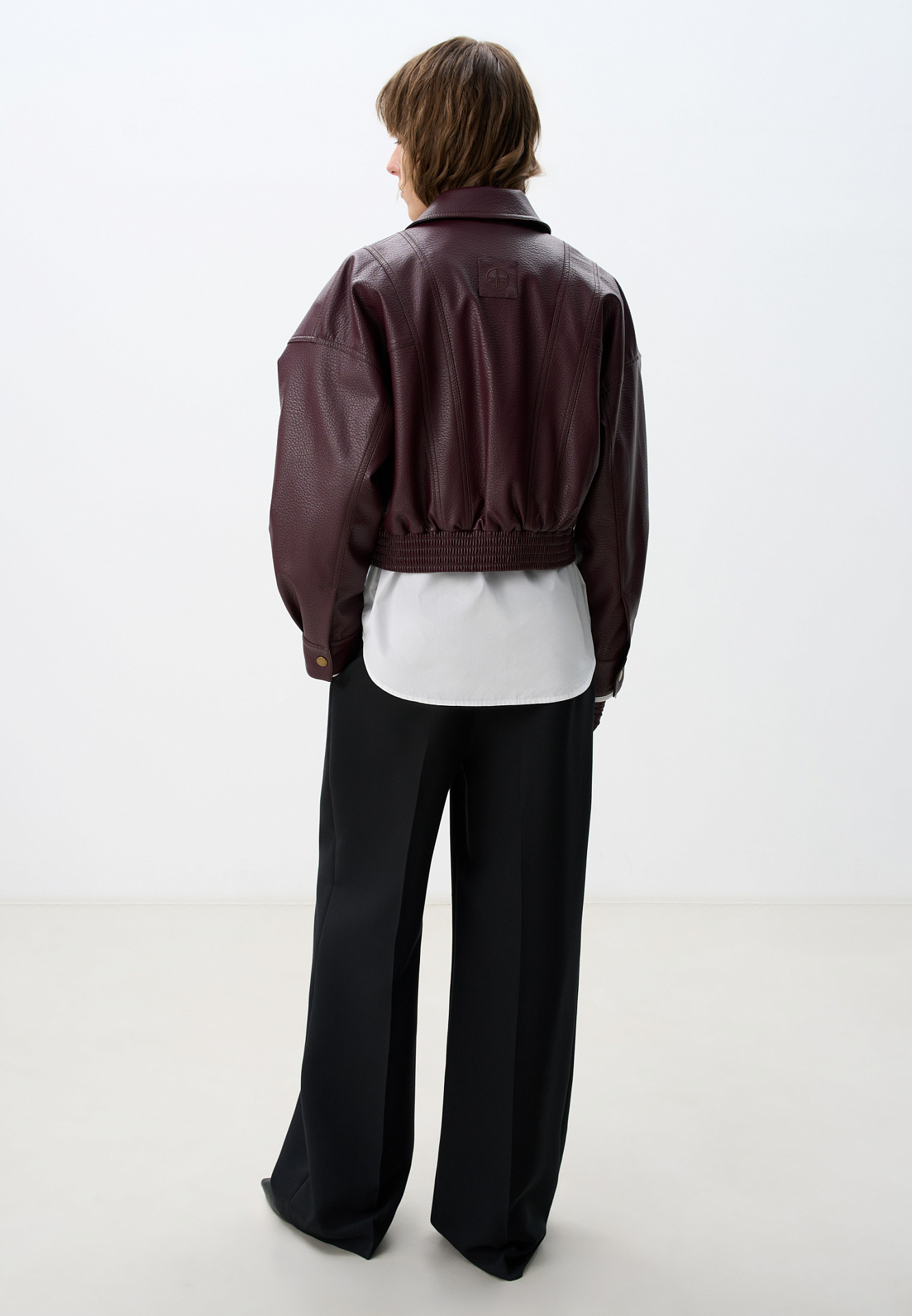 Укороченный бомбер из экокожи.Модель свободного силуэта с длинными рукавами, с воротником и двумя нагрудными карманами. Застежка на молнию. Изделие на подкладке.