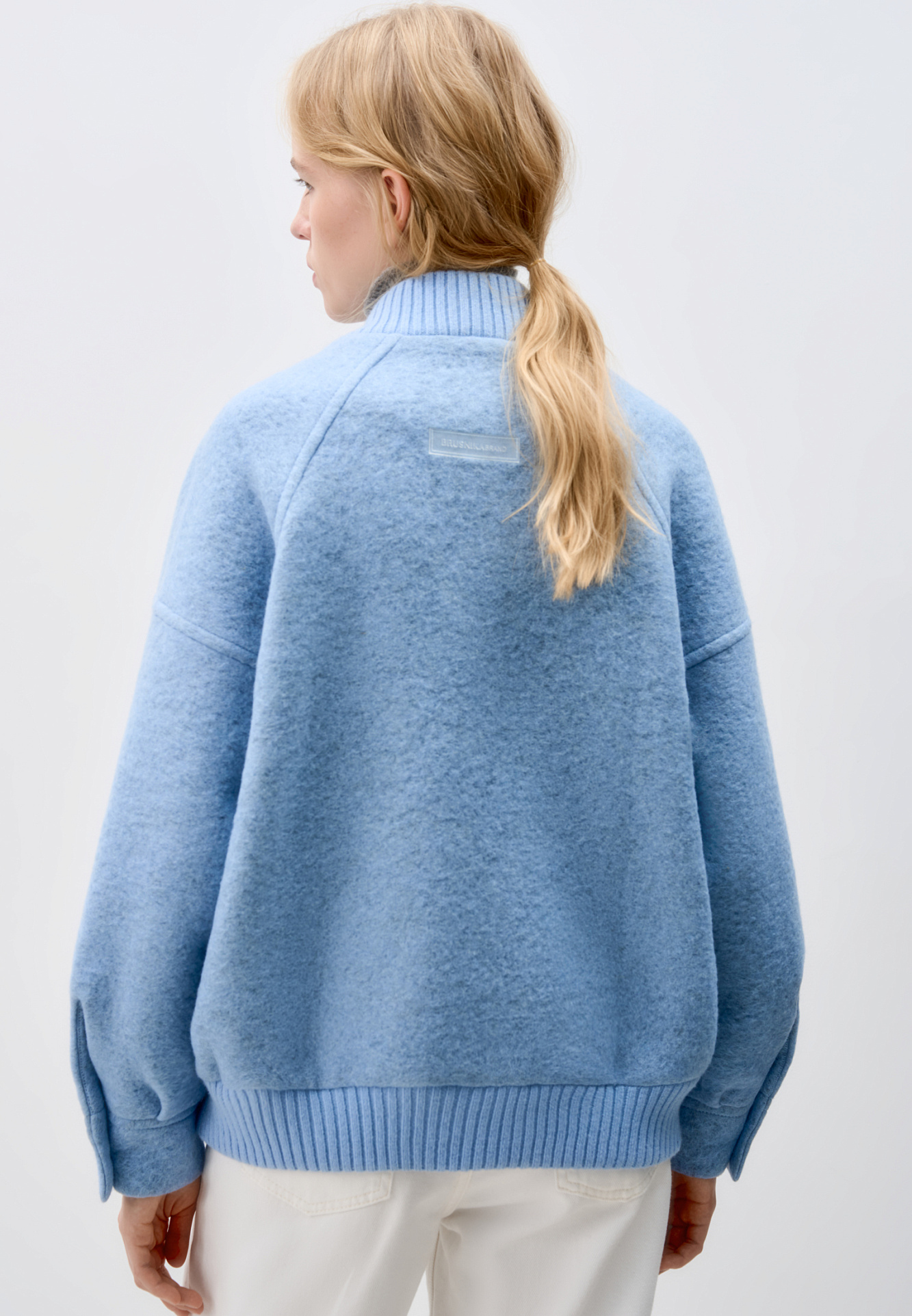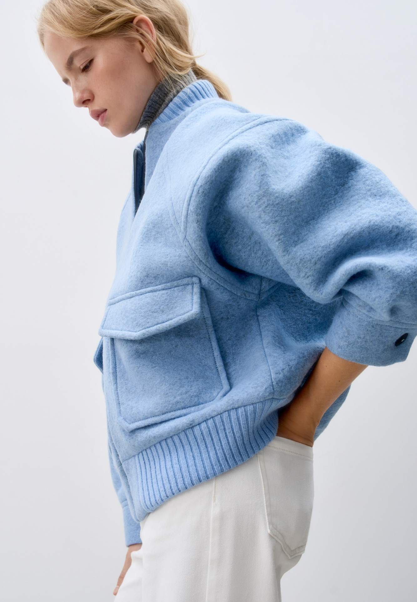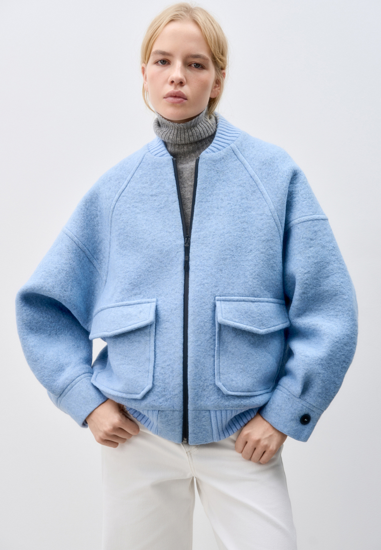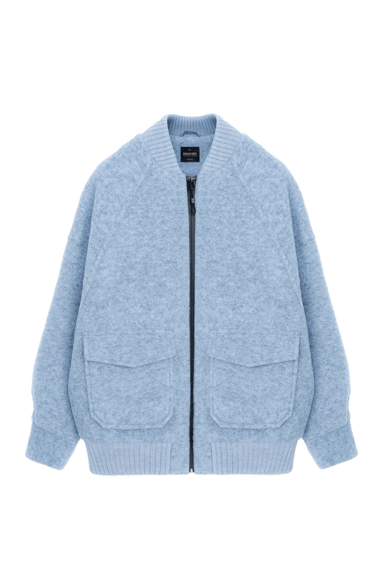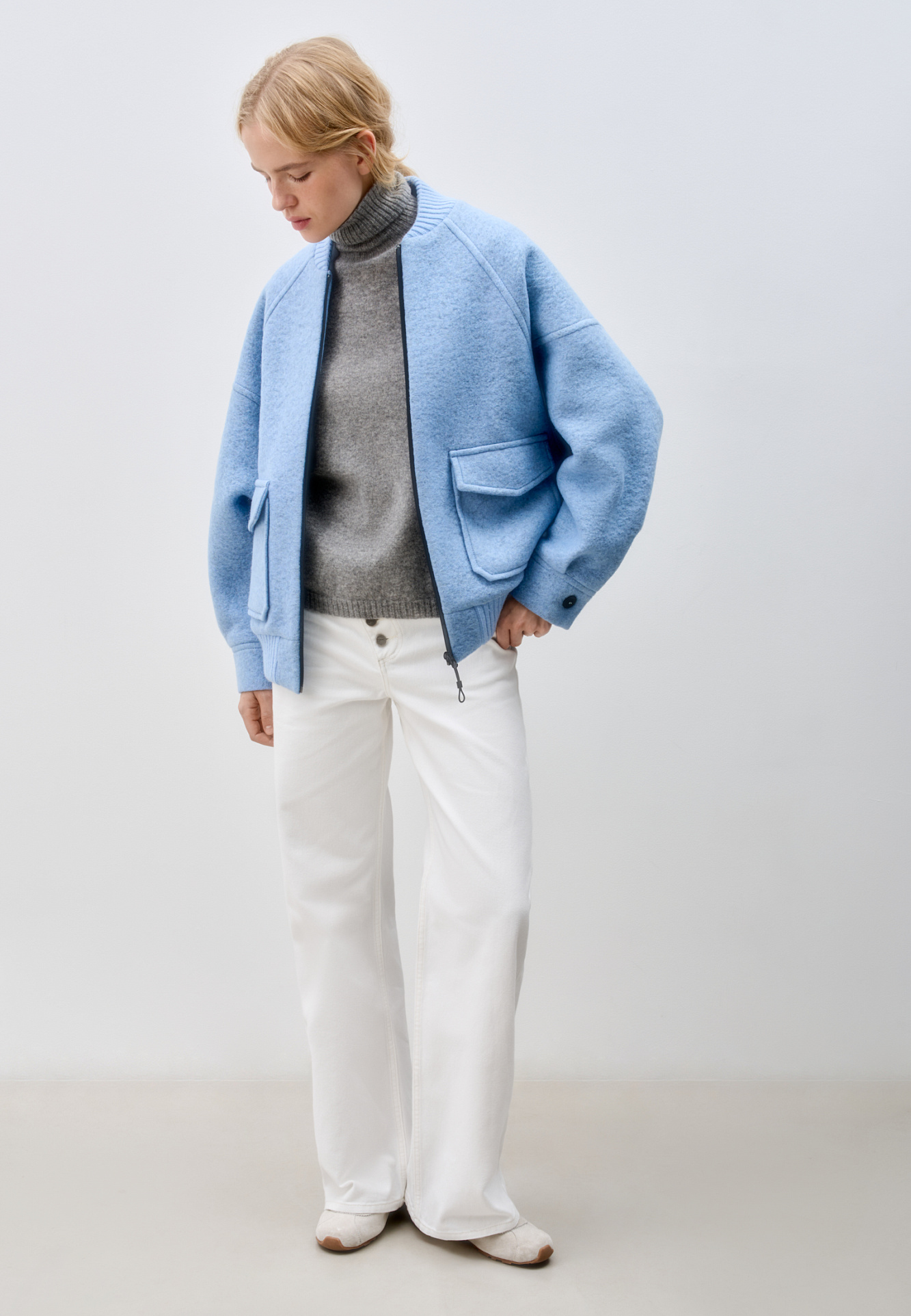 Свободный бомбер из валяной шерсти. Горловина и низ на резинке, манжеты застегиваются на пуговицы. Два передних кармана на клапанах. Застежка на молнию.