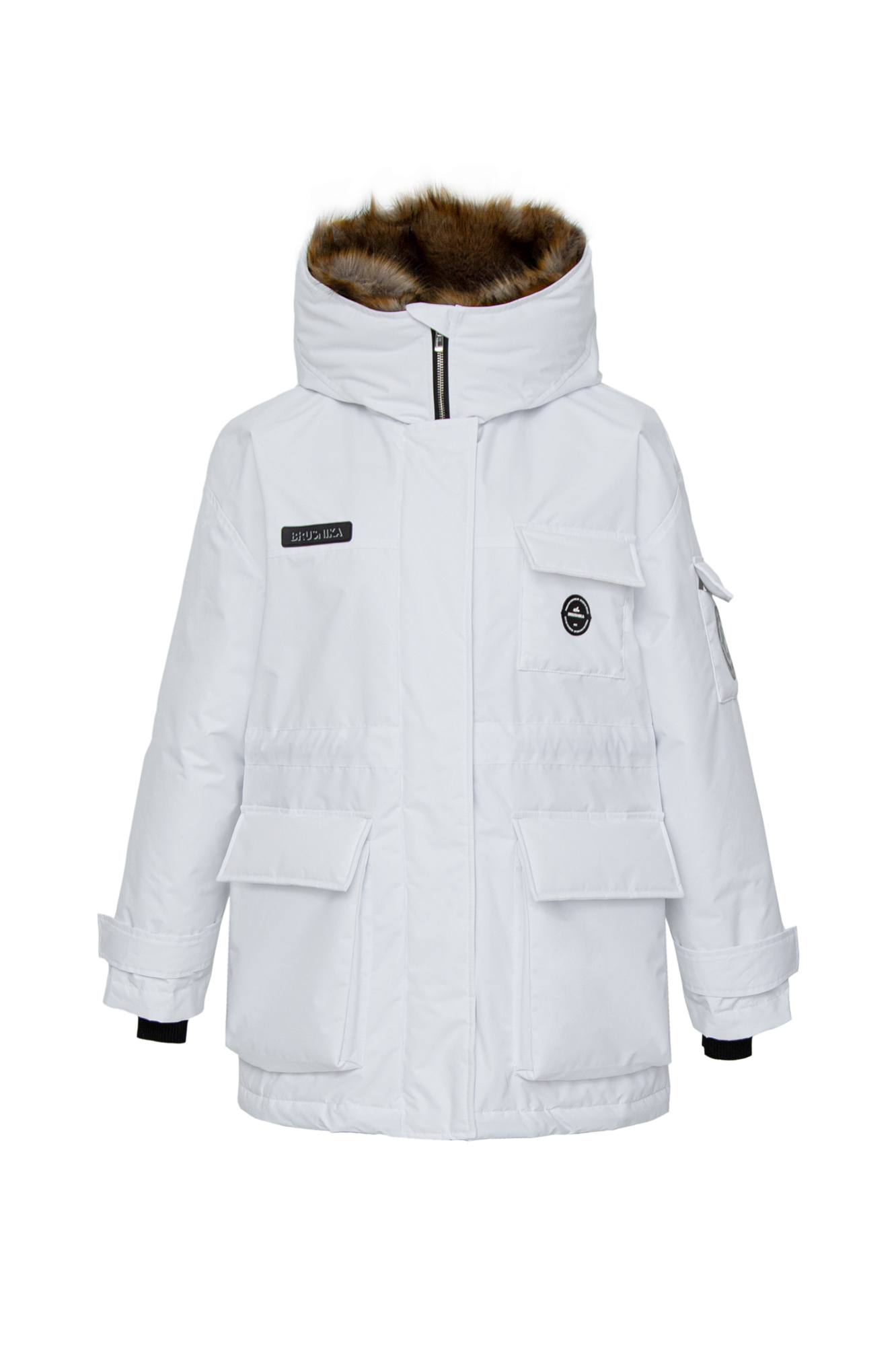 Куртка на молнии с меховым капюшоном, наполнитель пух-перо, внутренняя кулиска на талии, регулируемая кулиска по низу изделия, накладные карманы спереди, с фиксаторами на манжетах. Высокий показатель водонепроницаемости, выдержит слабый дождь и мокрый снег.