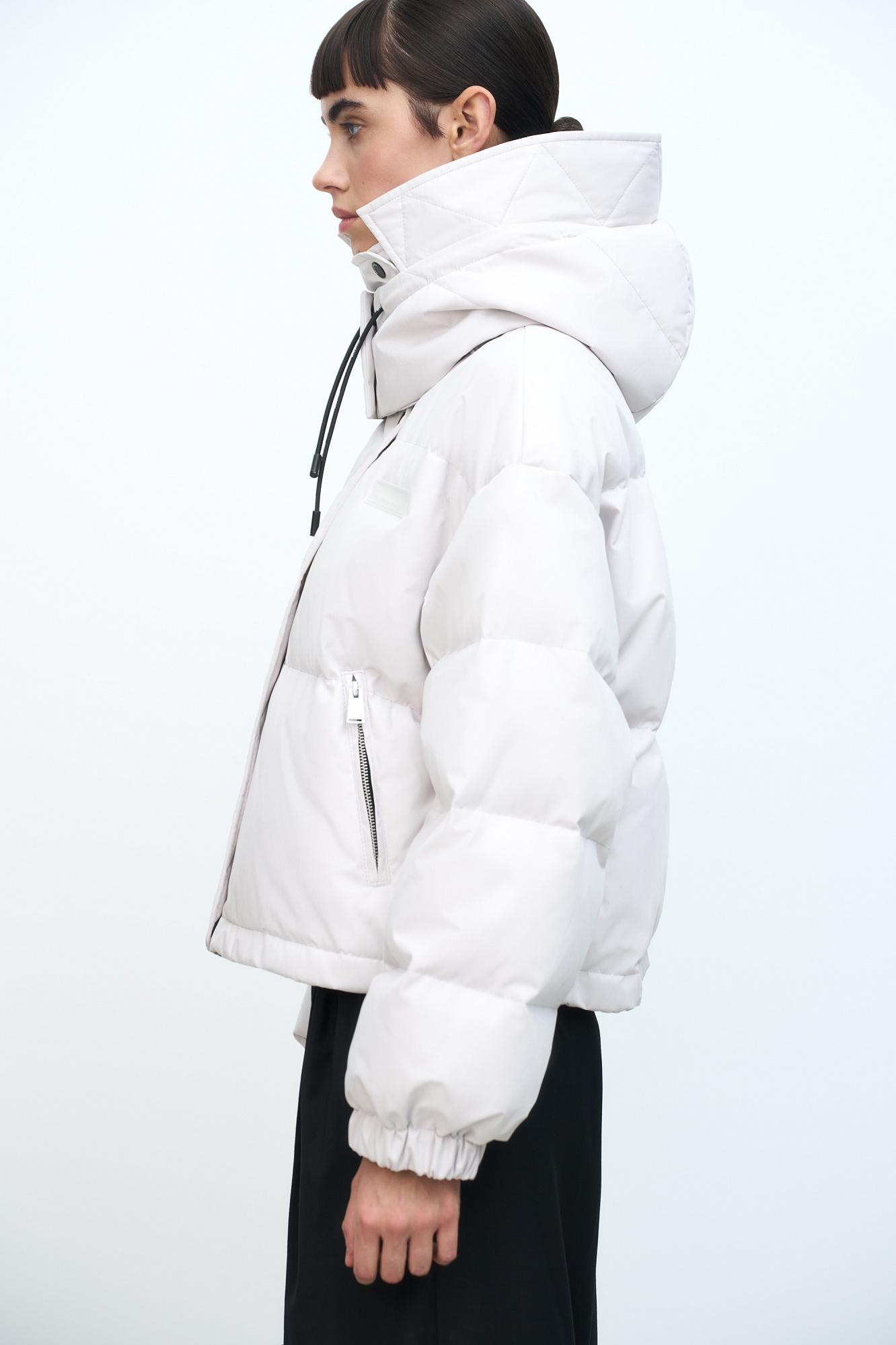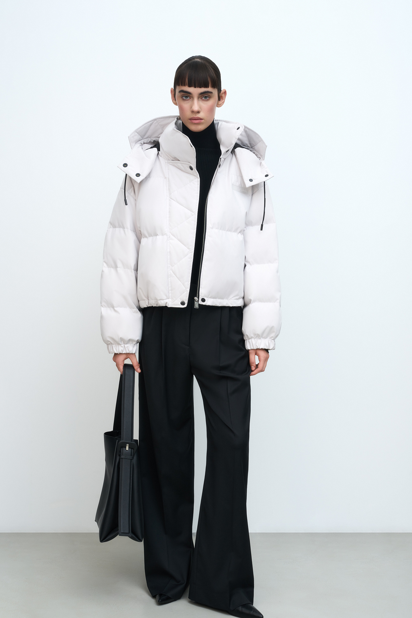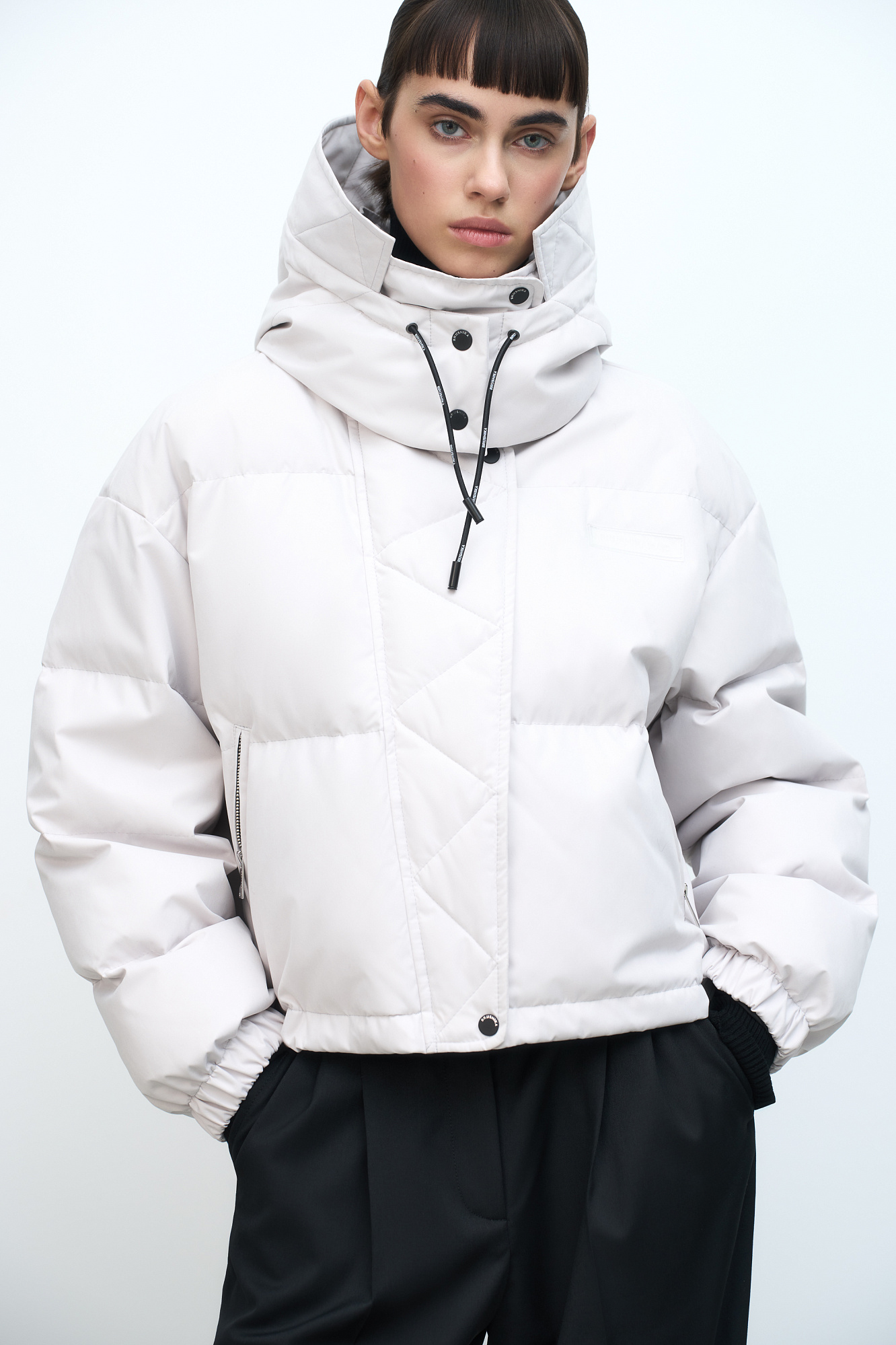 Утепленный пуховик с воротником-стойкой и капюшоном на молнии. Модель свободного силуэта с боковыми карманами, спущенным плечом и брендированным ярлыком на груди. Застежка на потайную молнию и кнопки. Наполнитель натуральный пух 90% перо 10%.
