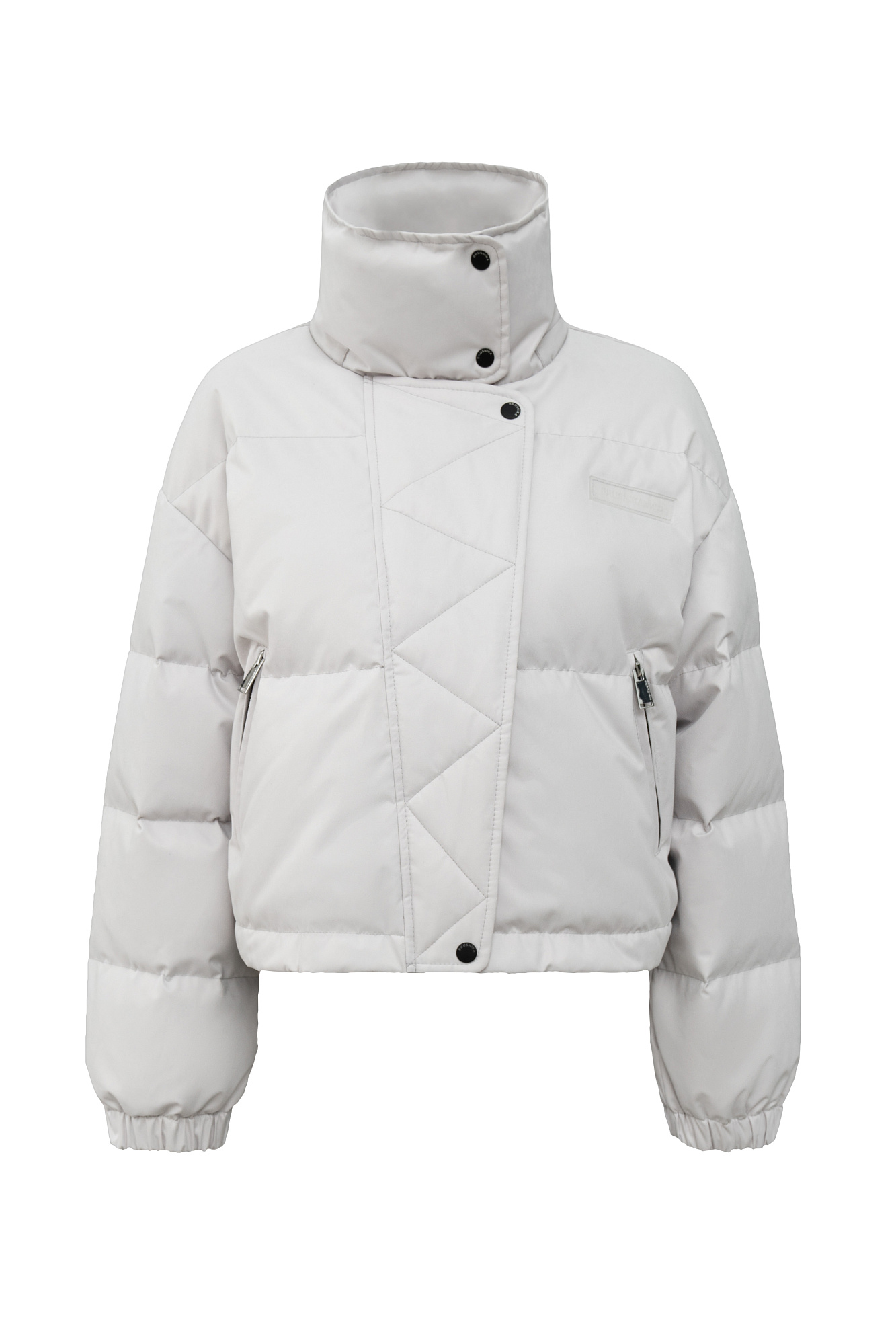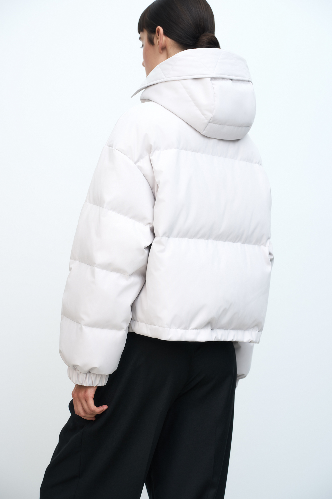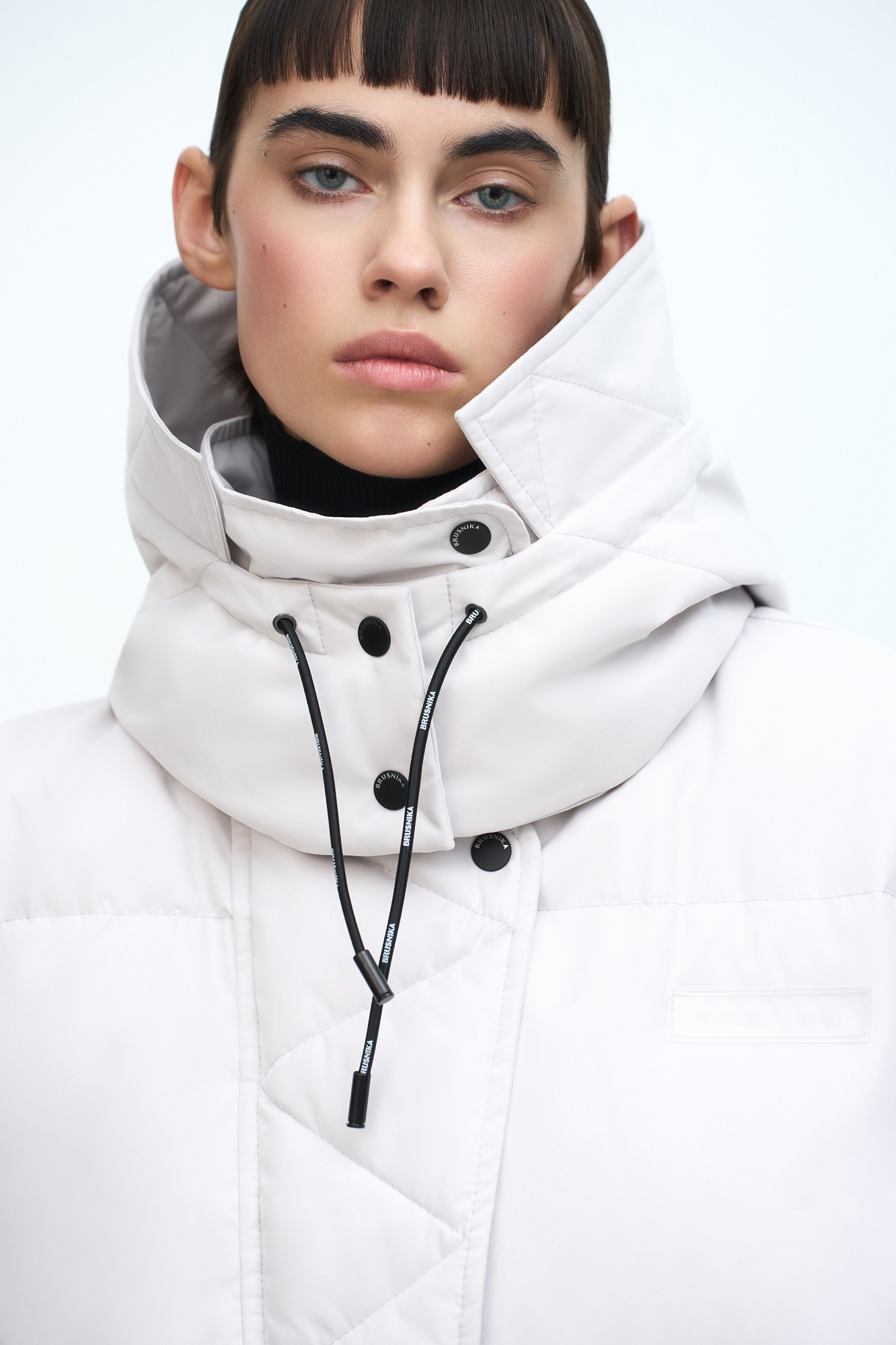 Утепленный пуховик с воротником-стойкой и капюшоном на молнии. Модель свободного силуэта с боковыми карманами, спущенным плечом и брендированным ярлыком на груди. Застежка на потайную молнию и кнопки. Наполнитель натуральный пух 90% перо 10%.