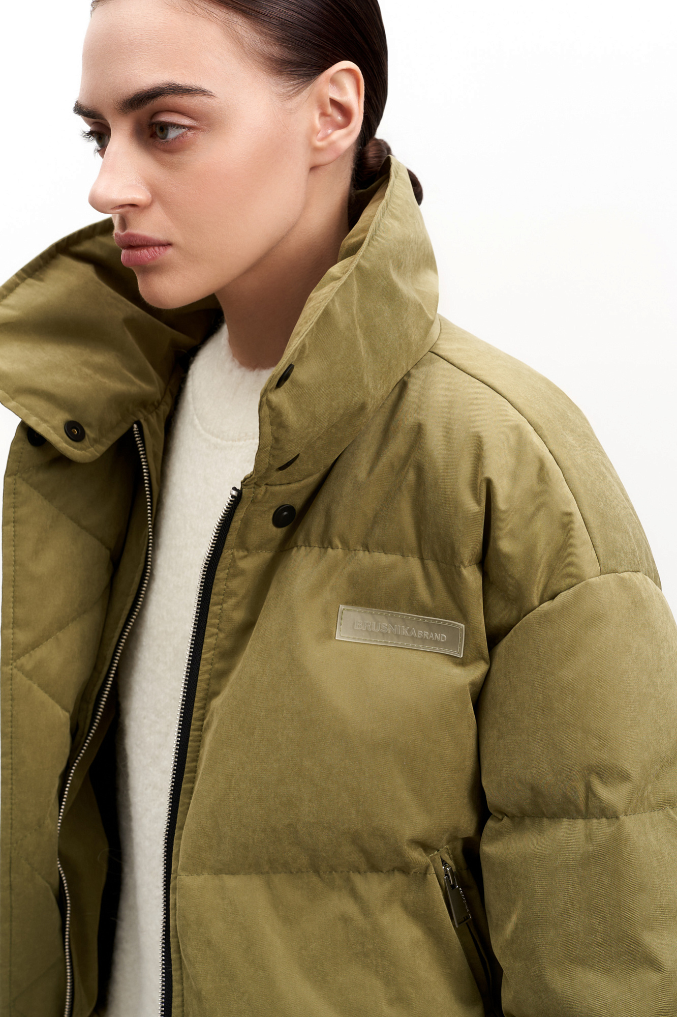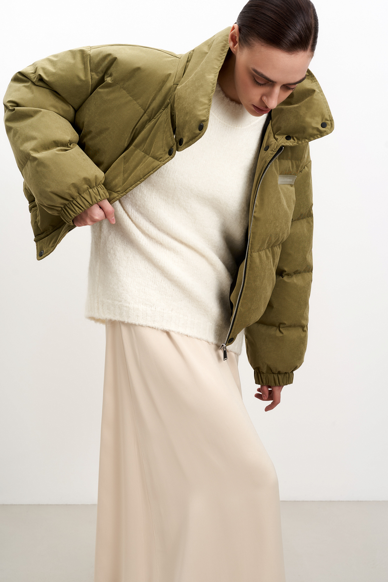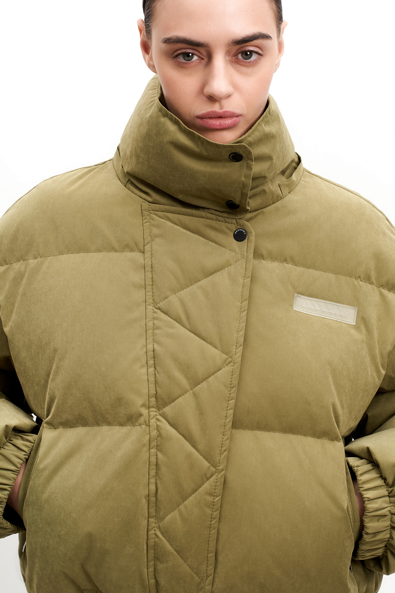 Утепленный пуховик с воротником-стойкой и капюшоном на молнии. Модель свободного силуэта с боковыми карманами, спущенным плечом и брендированным ярлыком на груди. Застежка на потайную молнию и кнопки. Наполнитель натуральный пух 90% перо 10%.