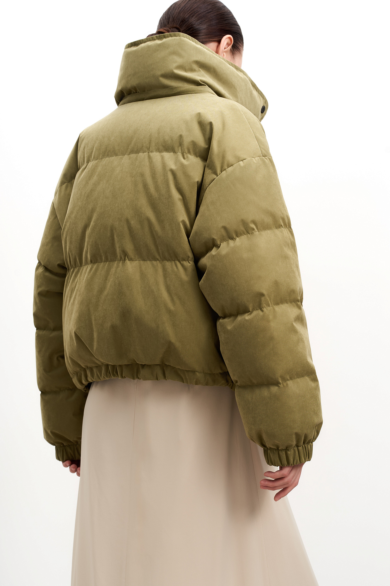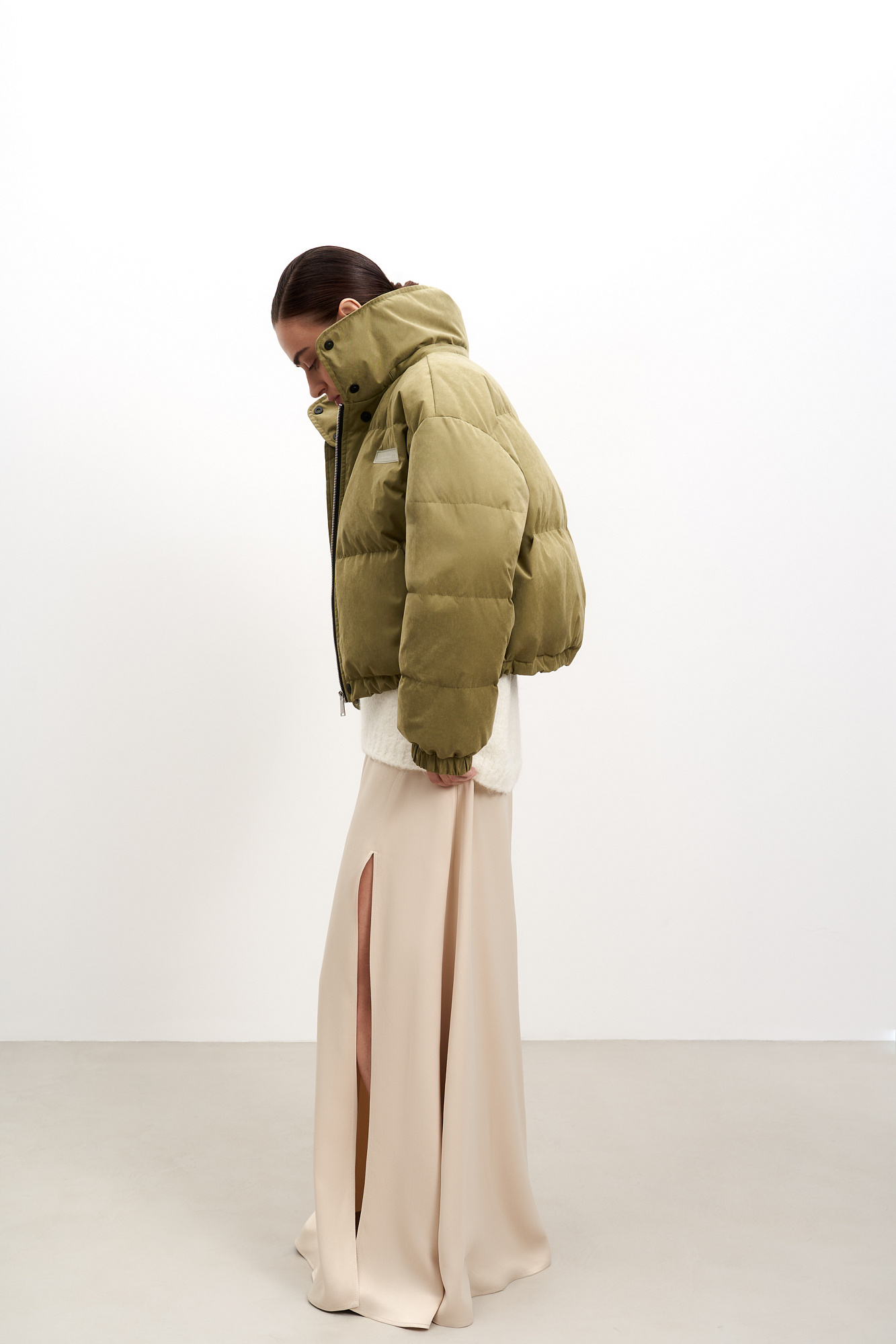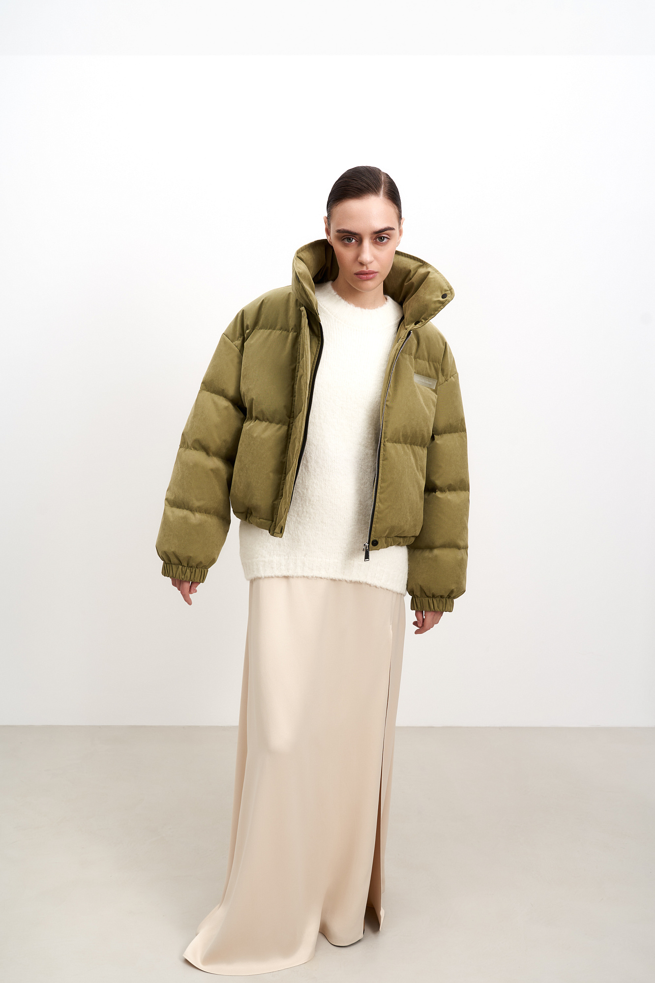 Утепленный пуховик с воротником-стойкой и капюшоном на молнии. Модель свободного силуэта с боковыми карманами, спущенным плечом и брендированным ярлыком на груди. Застежка на потайную молнию и кнопки. Наполнитель натуральный пух 90% перо 10%.