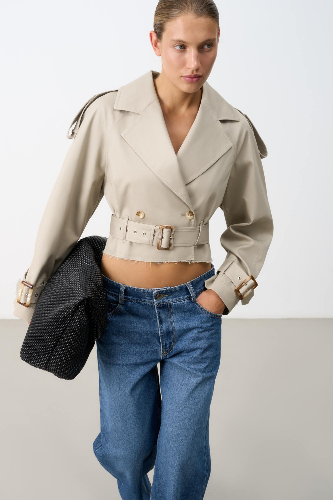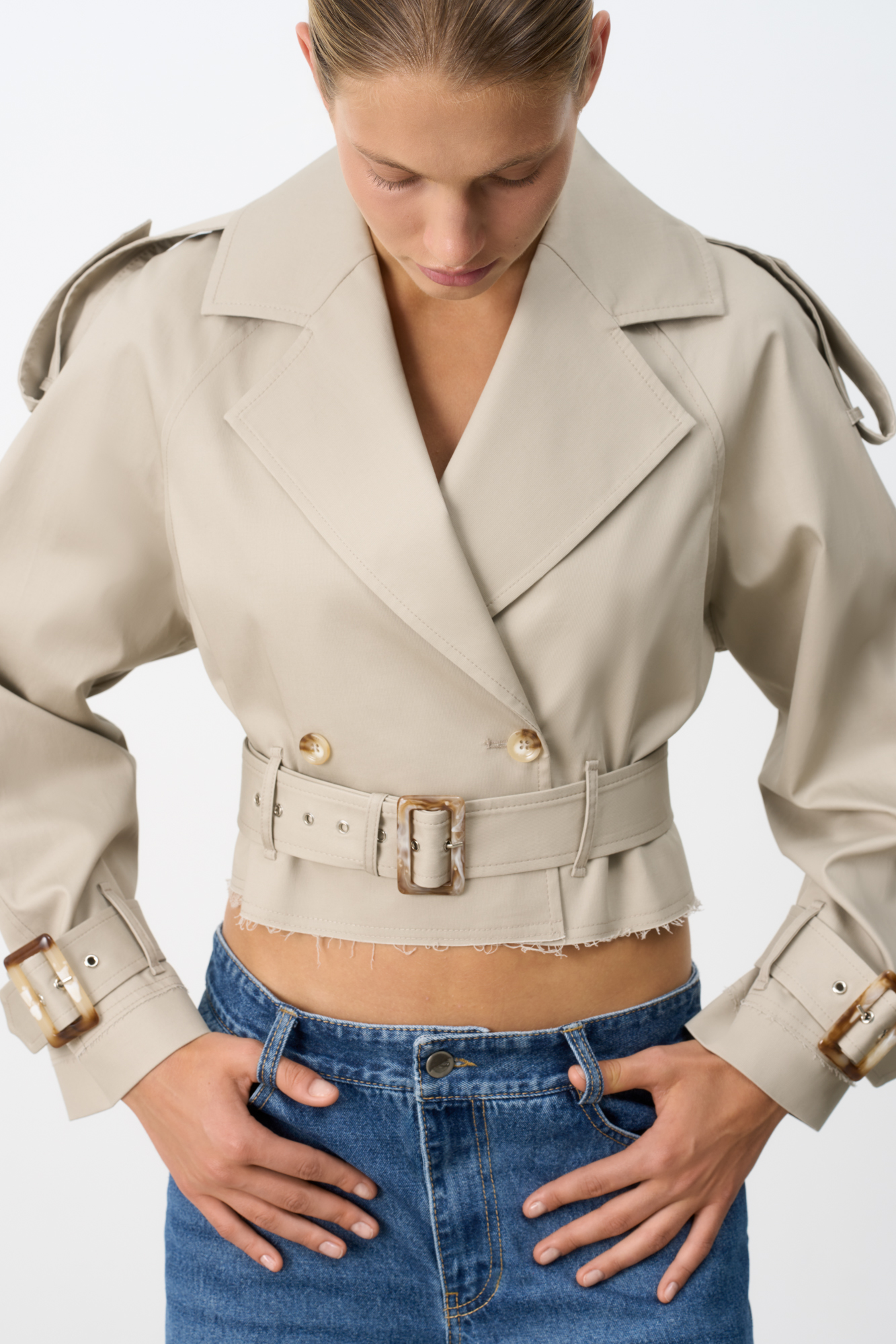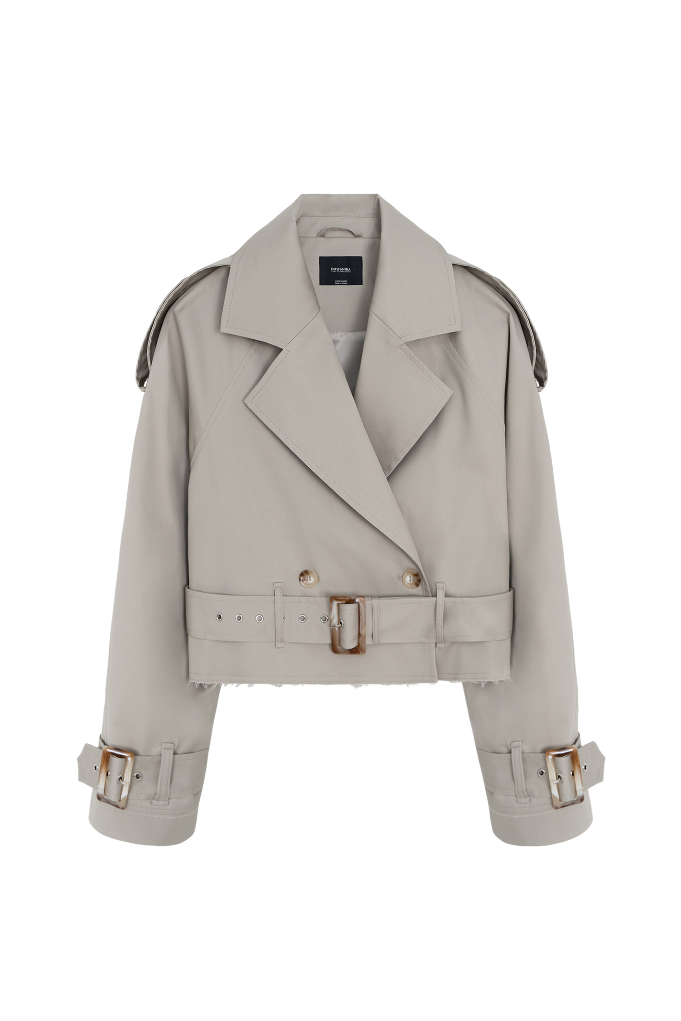Жакет-косуха из плащевой ткани. Двубортная модель со спущенной линией плеч и классическим английским воротником. Изделие декорировано эполетами на плечах, широким поясом с пряжкой на талии и манжетах рукавов и имитацией необработанного края. На подкладке.