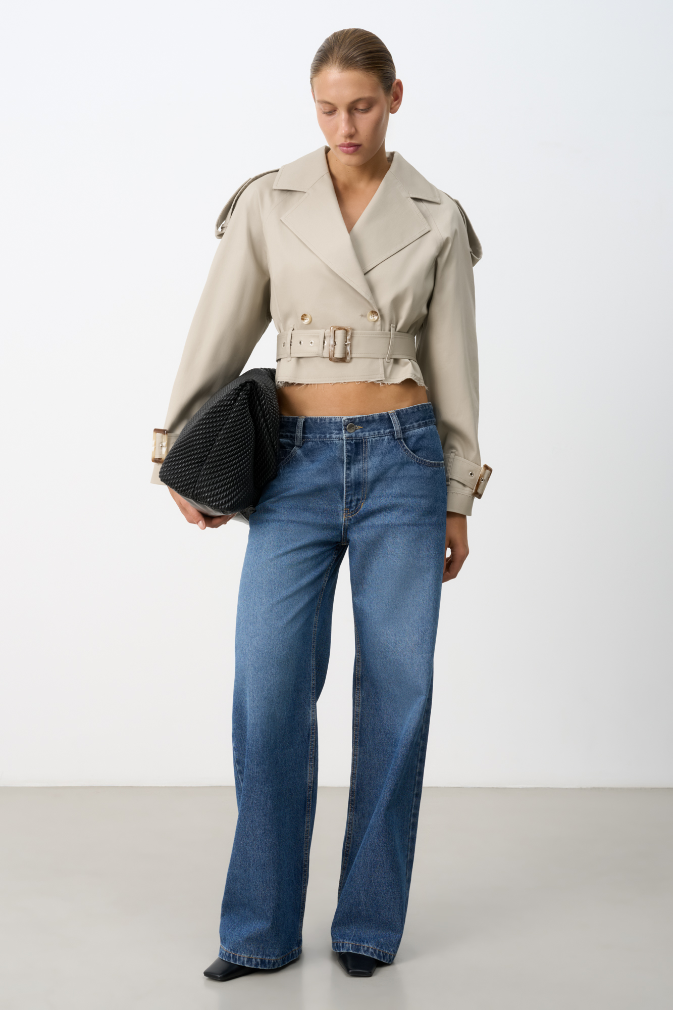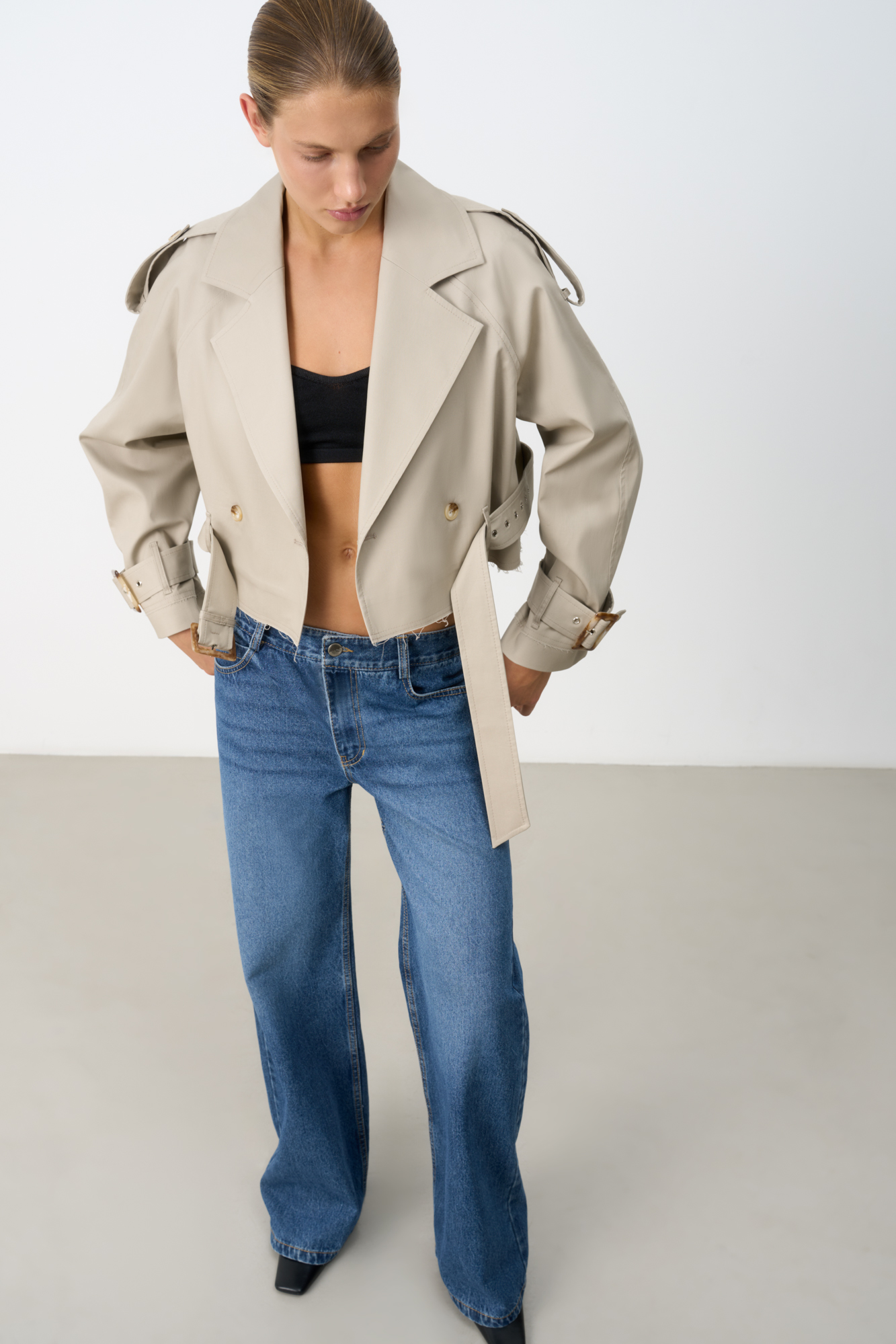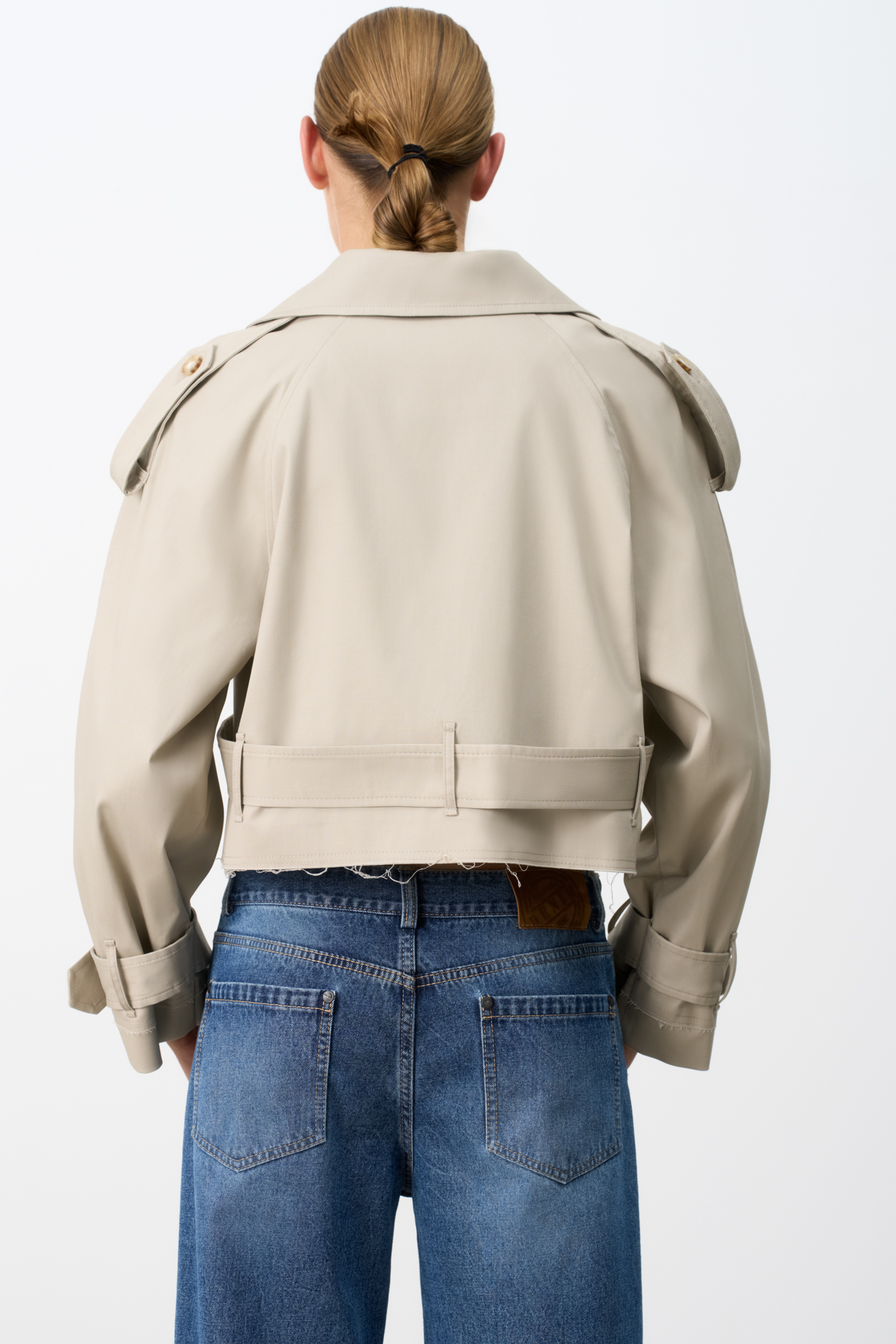 Жакет-косуха из плащевой ткани. Двубортная модель со спущенной линией плеч и классическим английским воротником. Изделие декорировано эполетами на плечах, широким поясом с пряжкой на талии и манжетах рукавов и имитацией необработанного края. На подкладке.