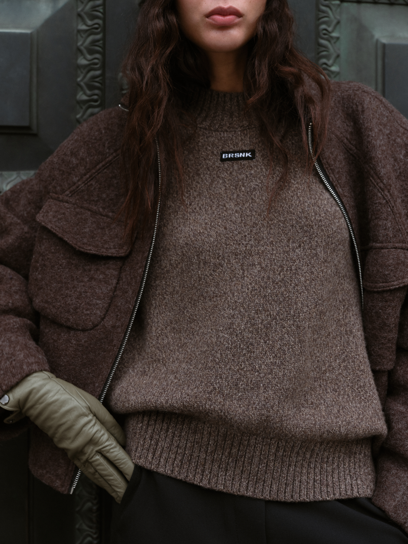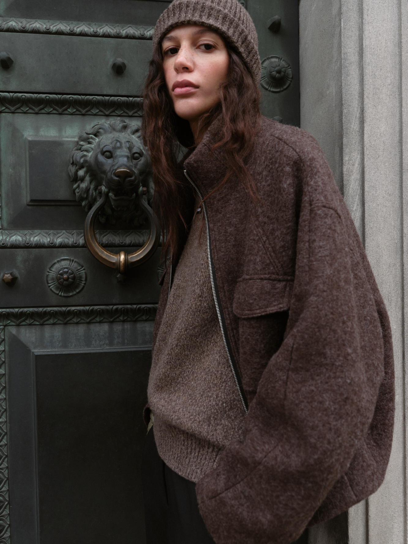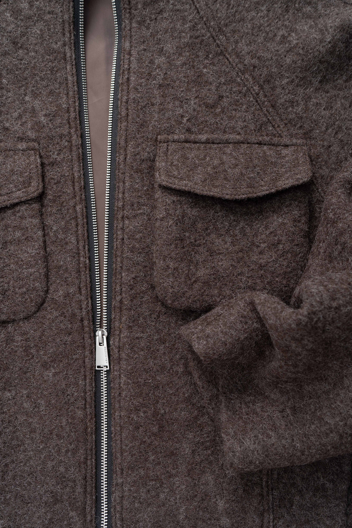 Шерстяная куртка на подкладке. Модель свободного силуэта со спущенной линией плеча, накладными карманами на груди и воротником-стойкой. Застежка на молнию.