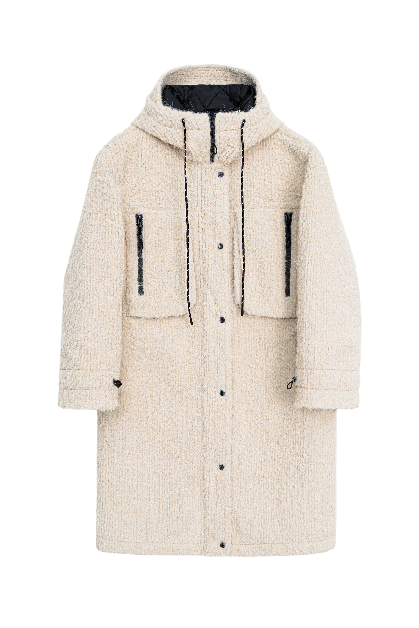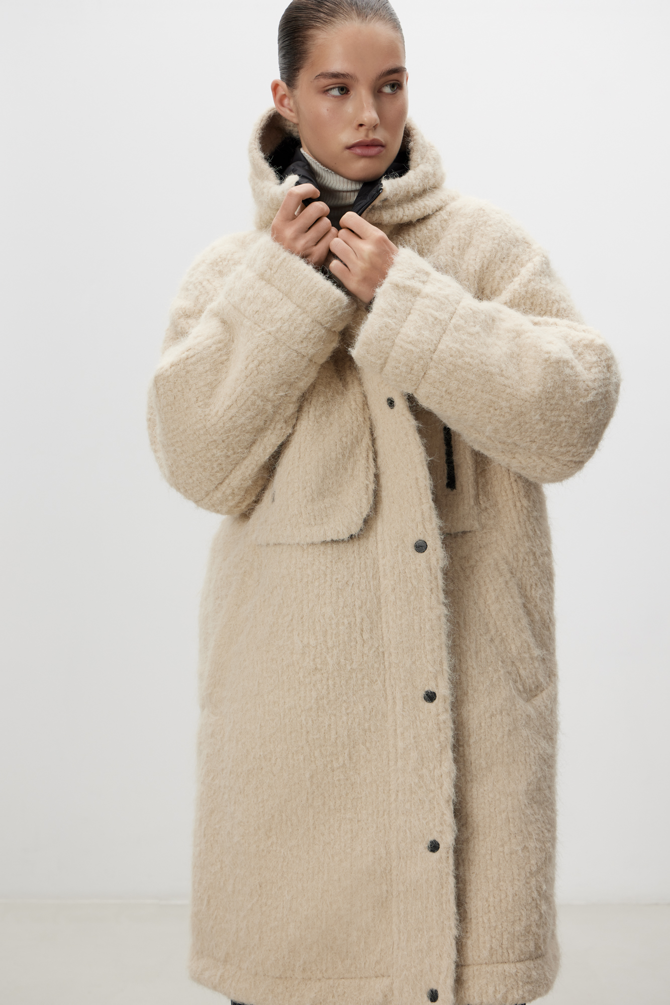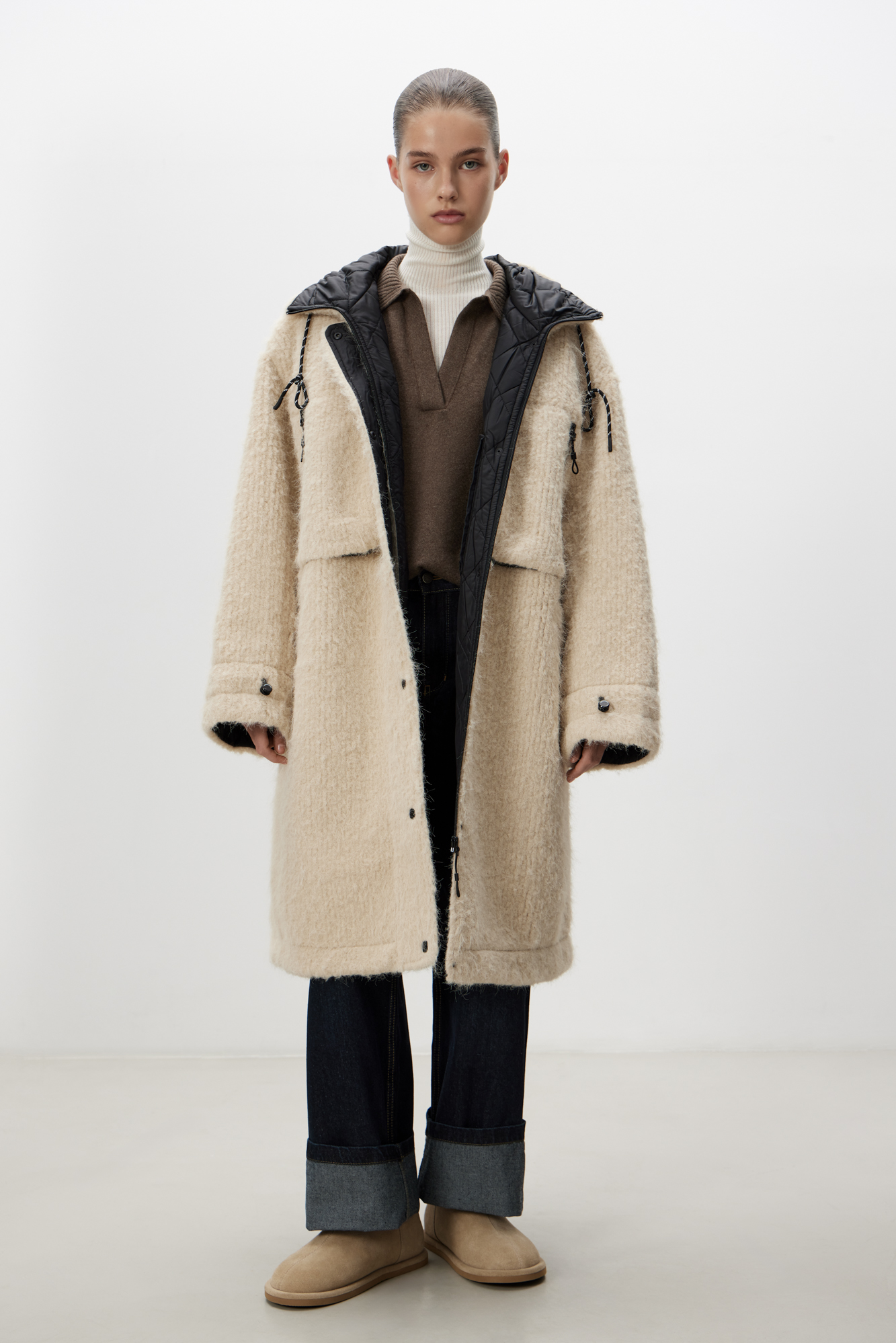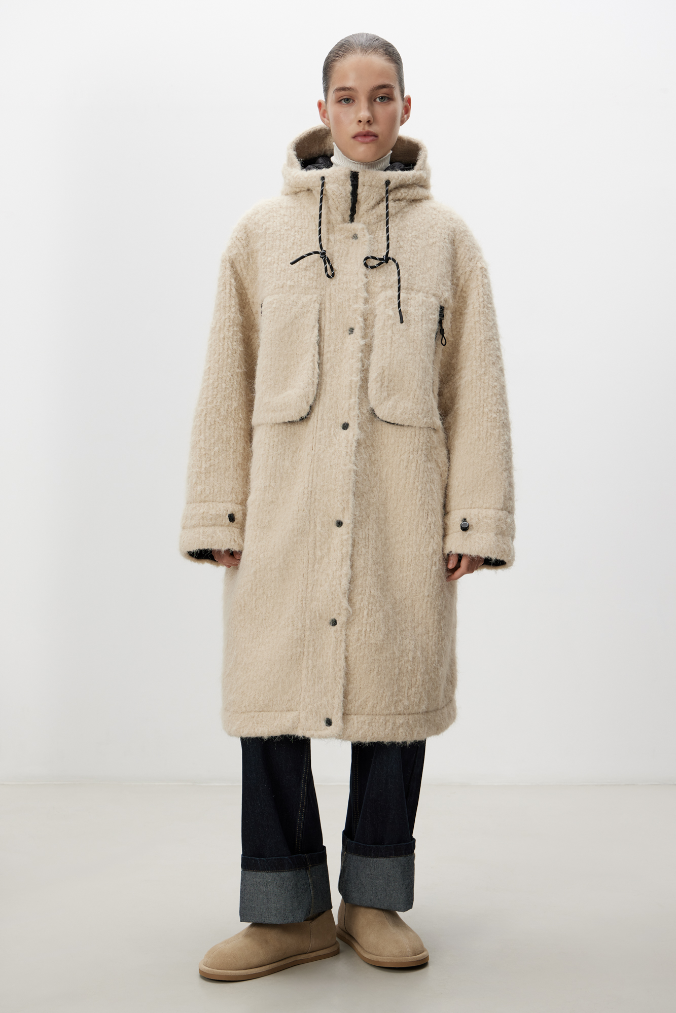 Длинная куртка из экомеха на стеганой подкладке. Модель с капюшоном и двумя накладными карманами. Застежка на молнию под планкой с кнопками.