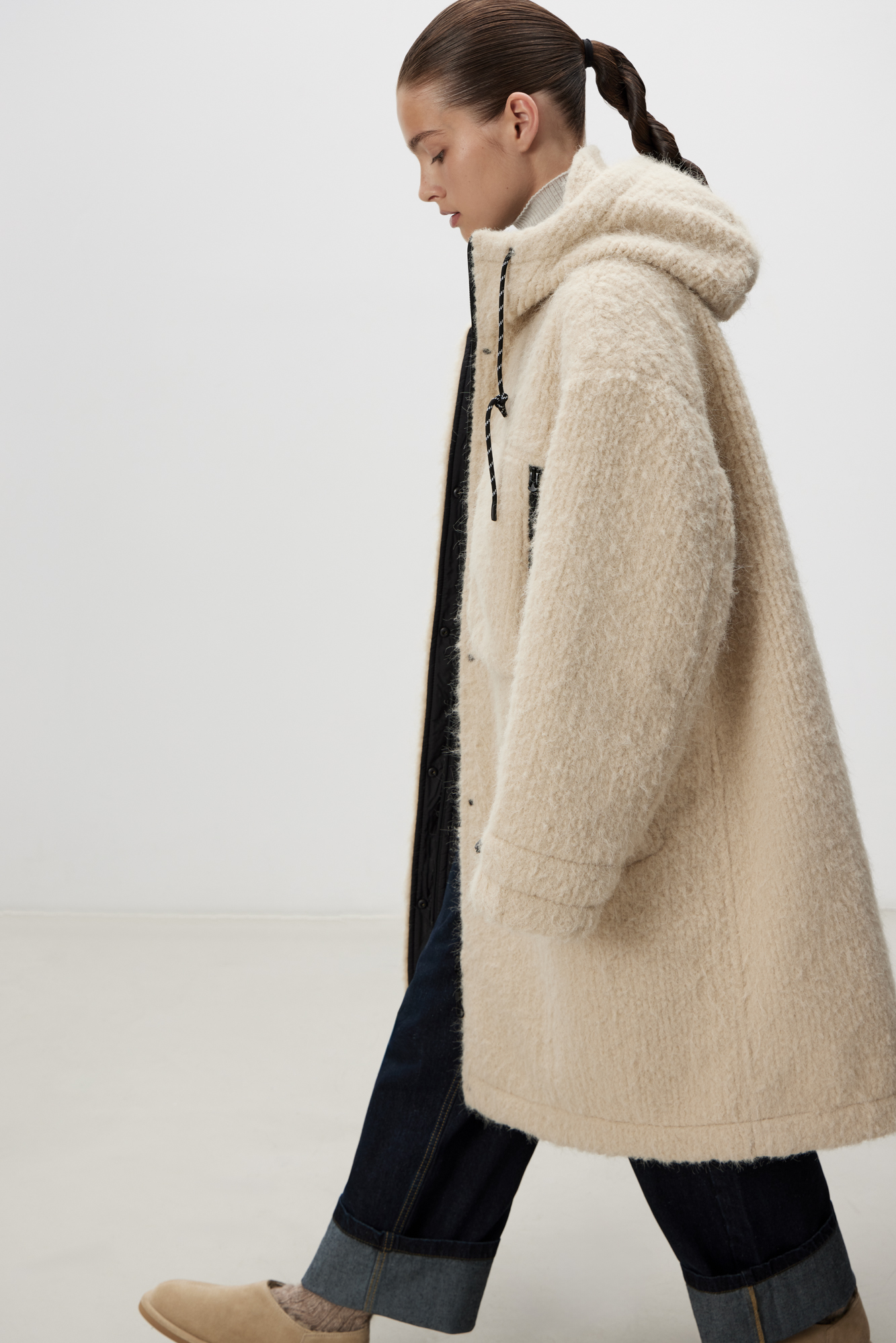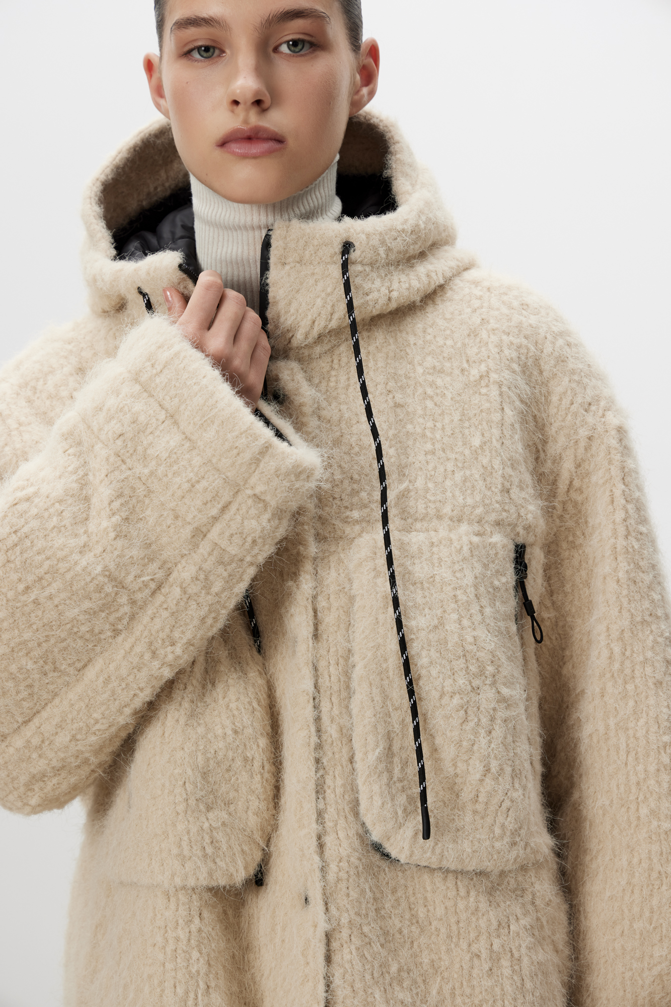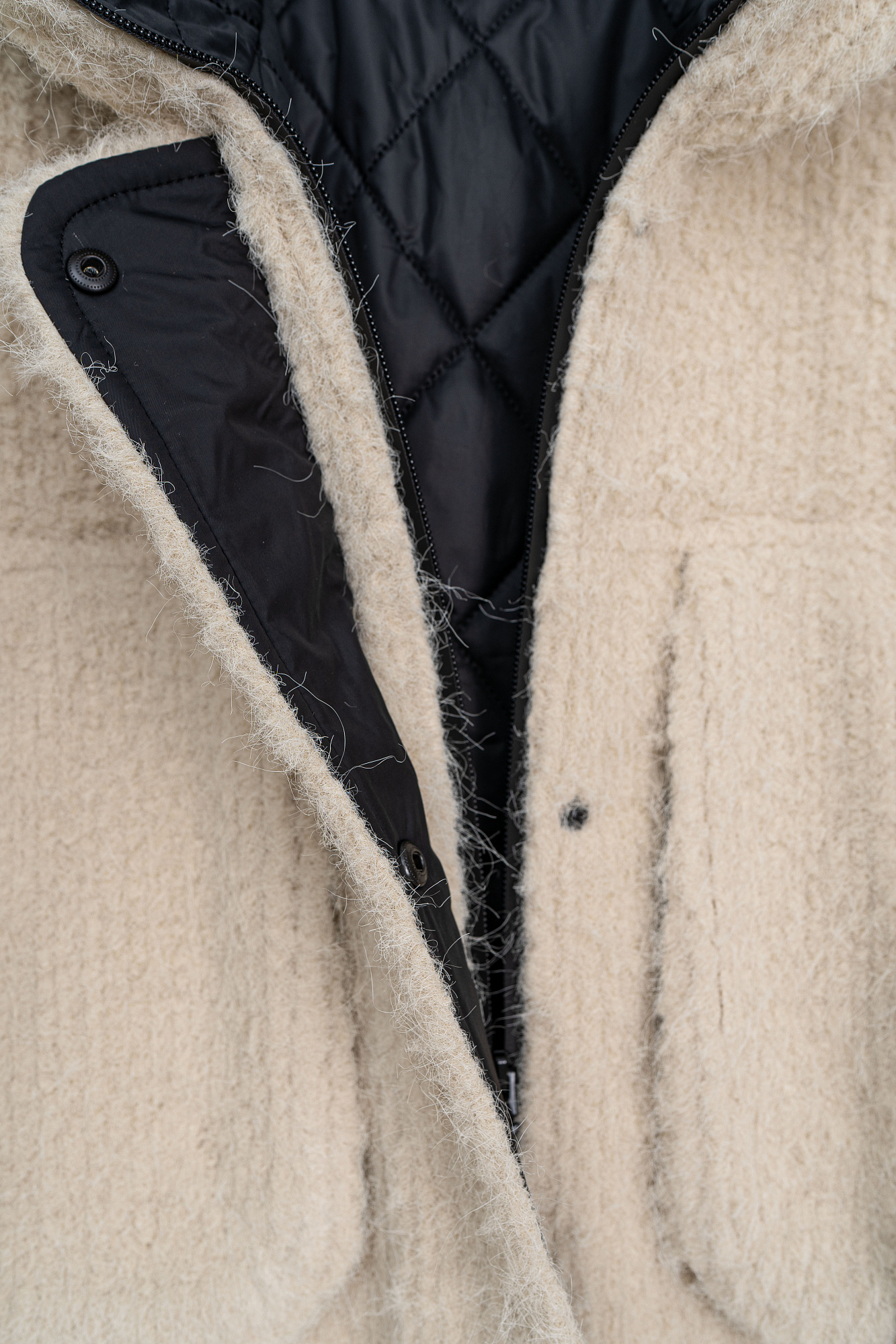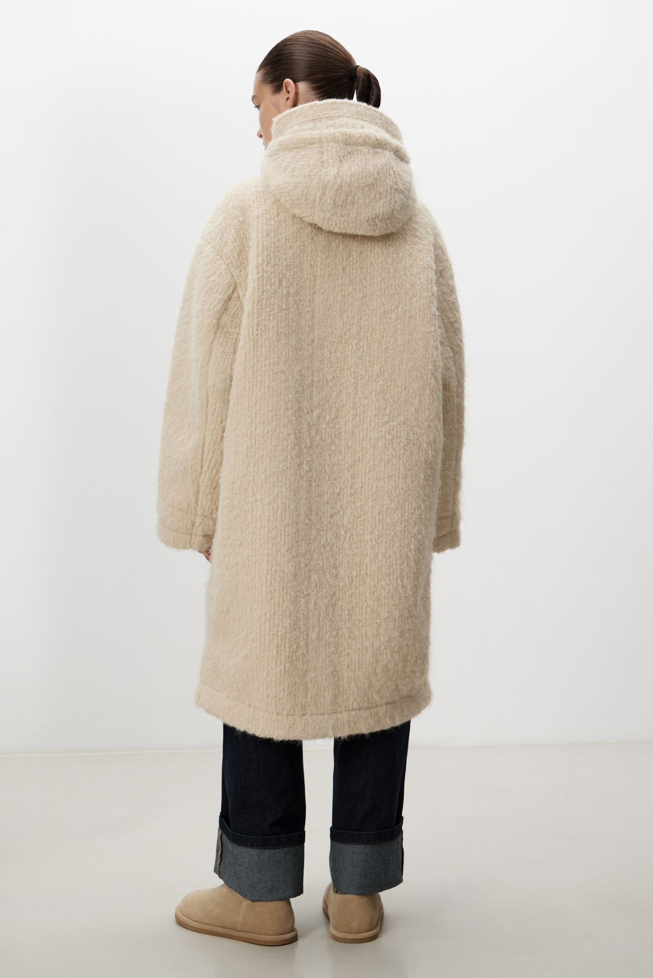 Длинная куртка из экомеха на стеганой подкладке. Модель с капюшоном и двумя накладными карманами. Застежка на молнию под планкой с кнопками.