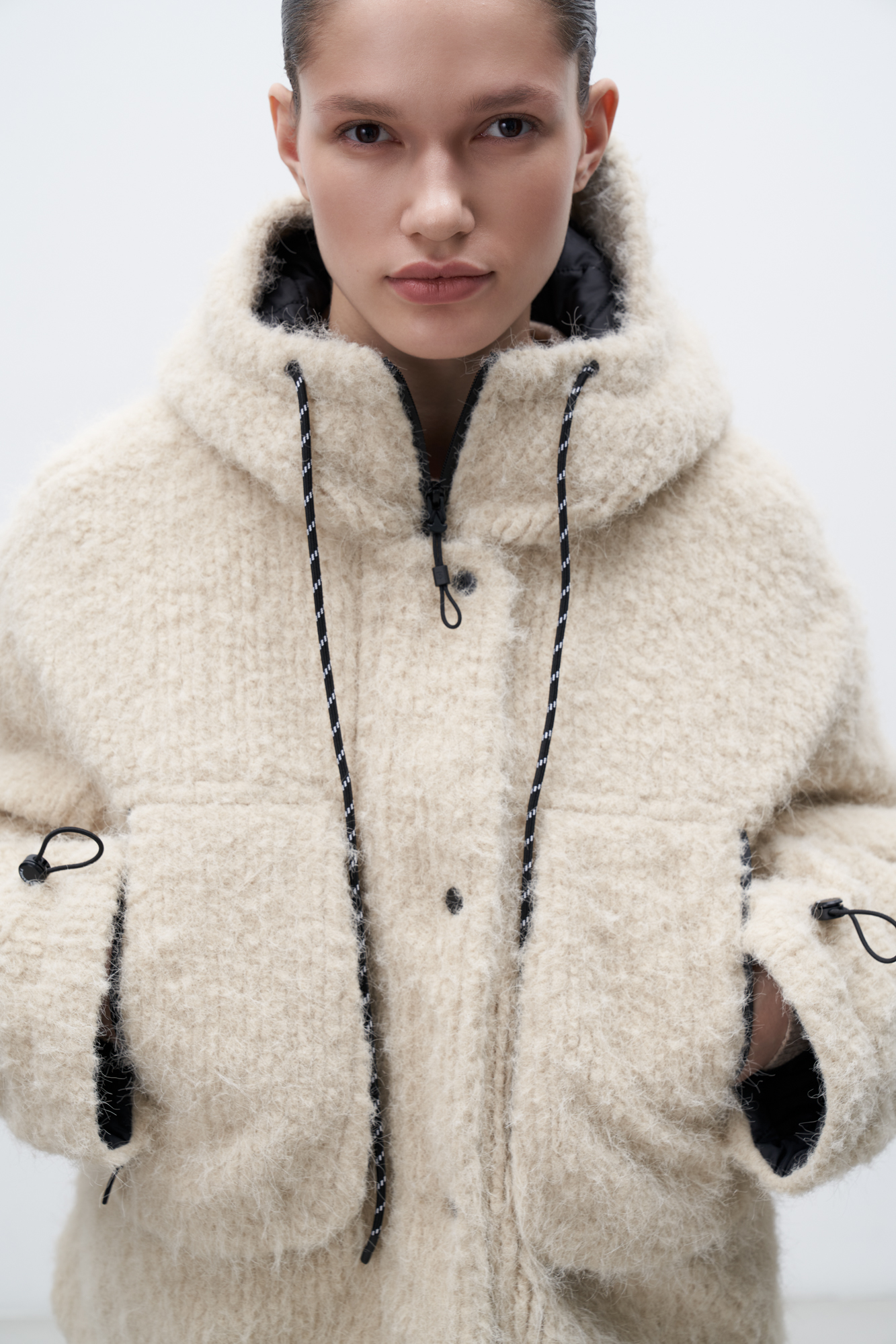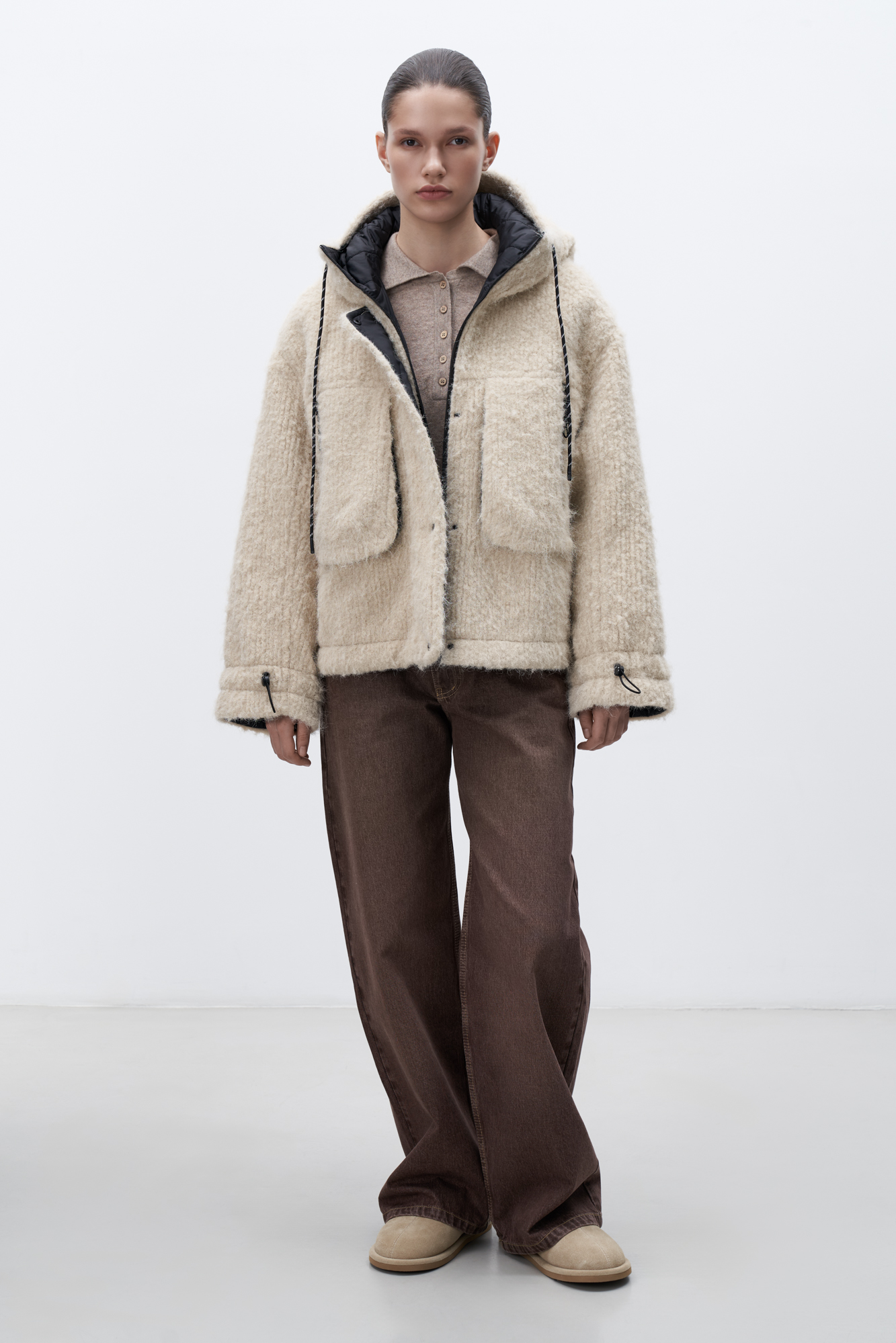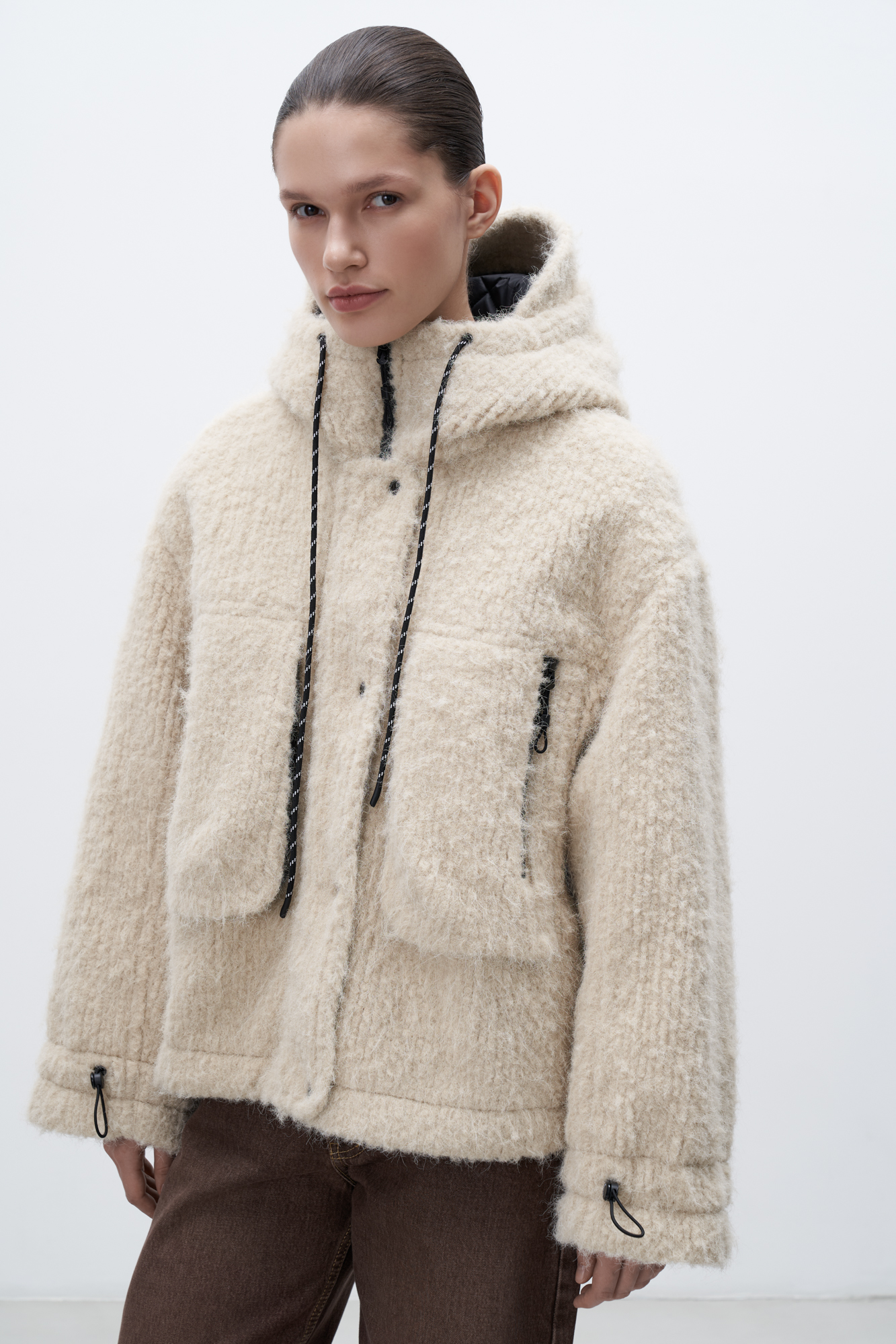 Куртка из экомеха на стеганой подкладке. Модель с капюшоном и двумя накладными карманами. Застежка на молнию под планкой с кнопками.