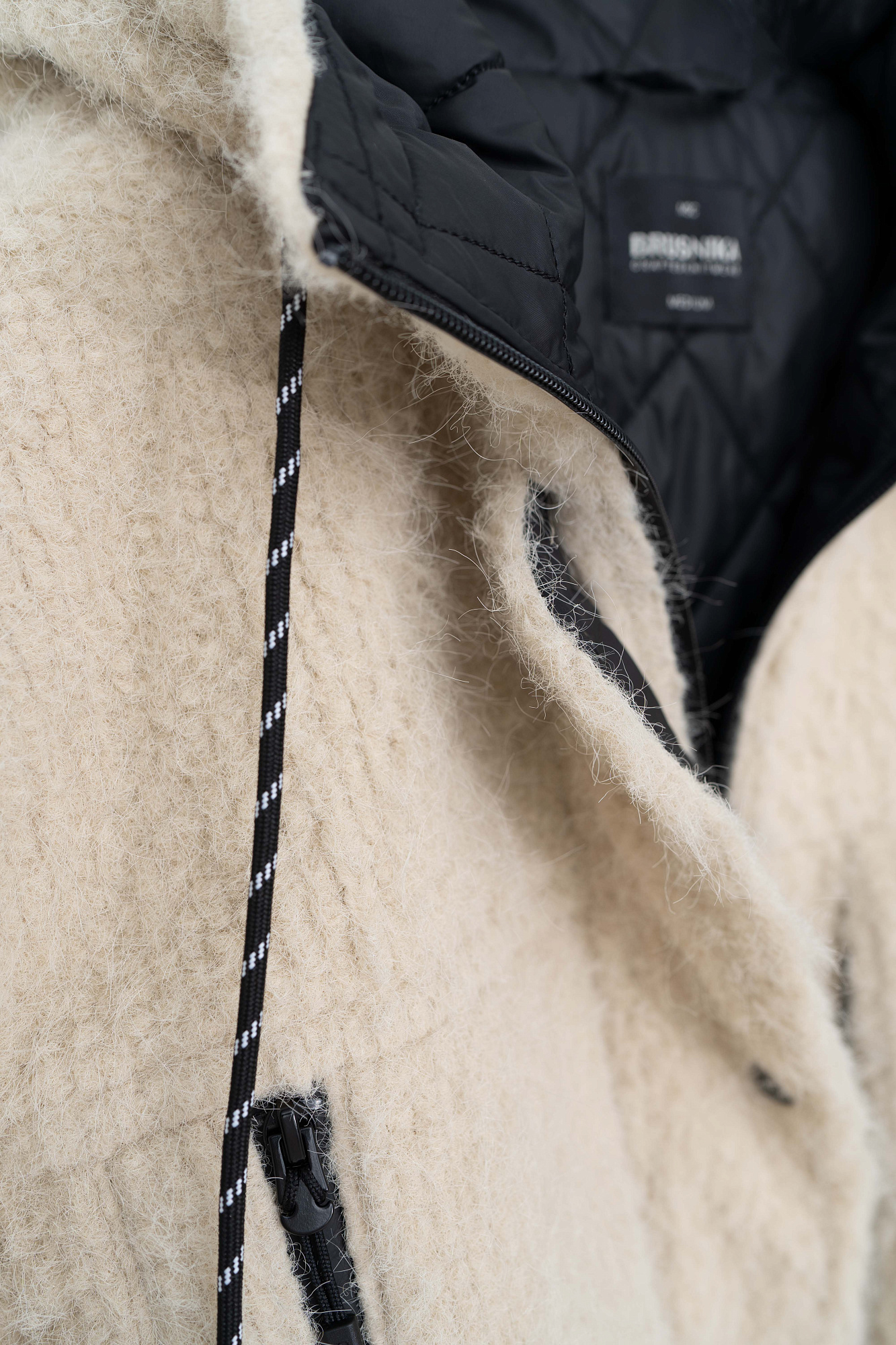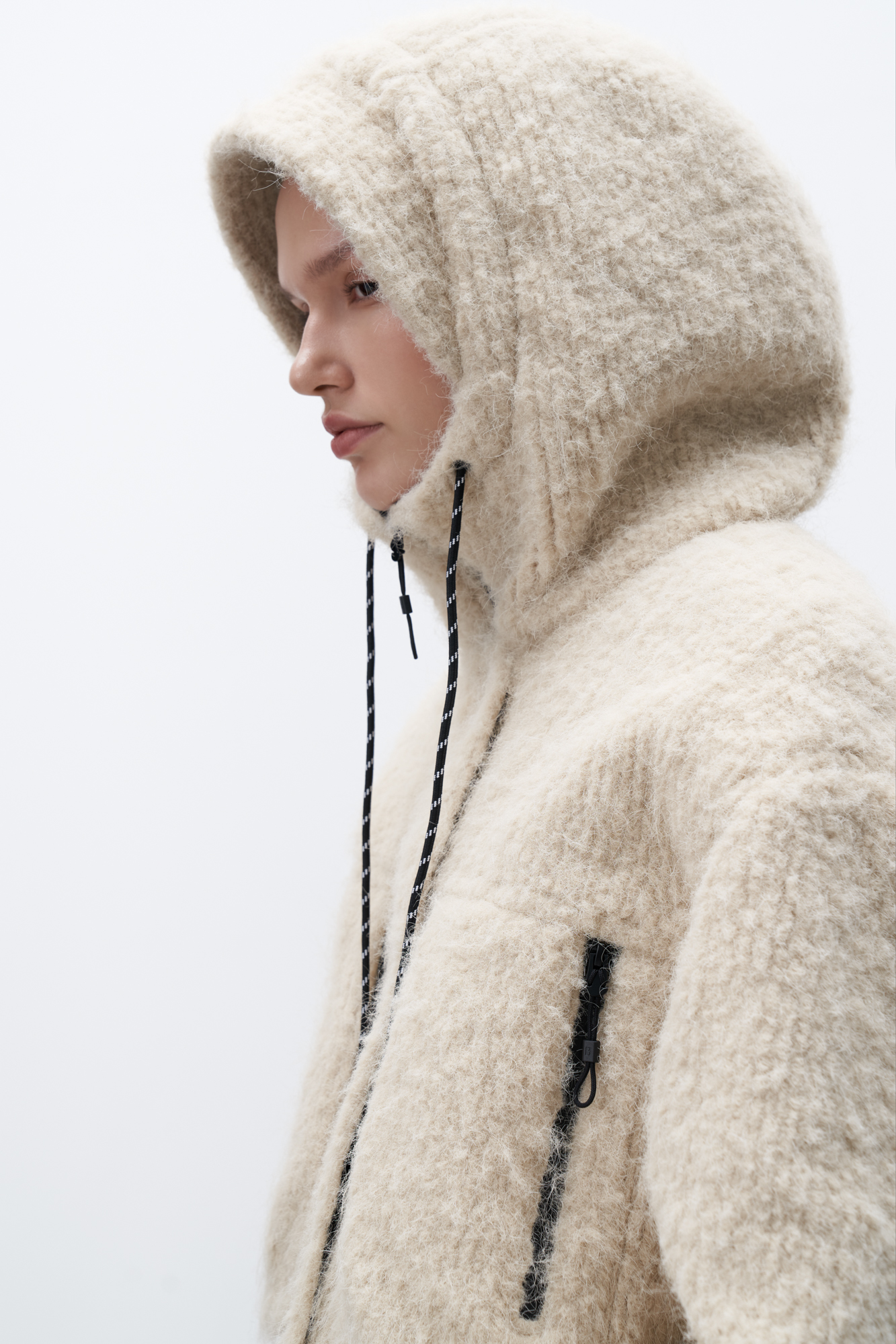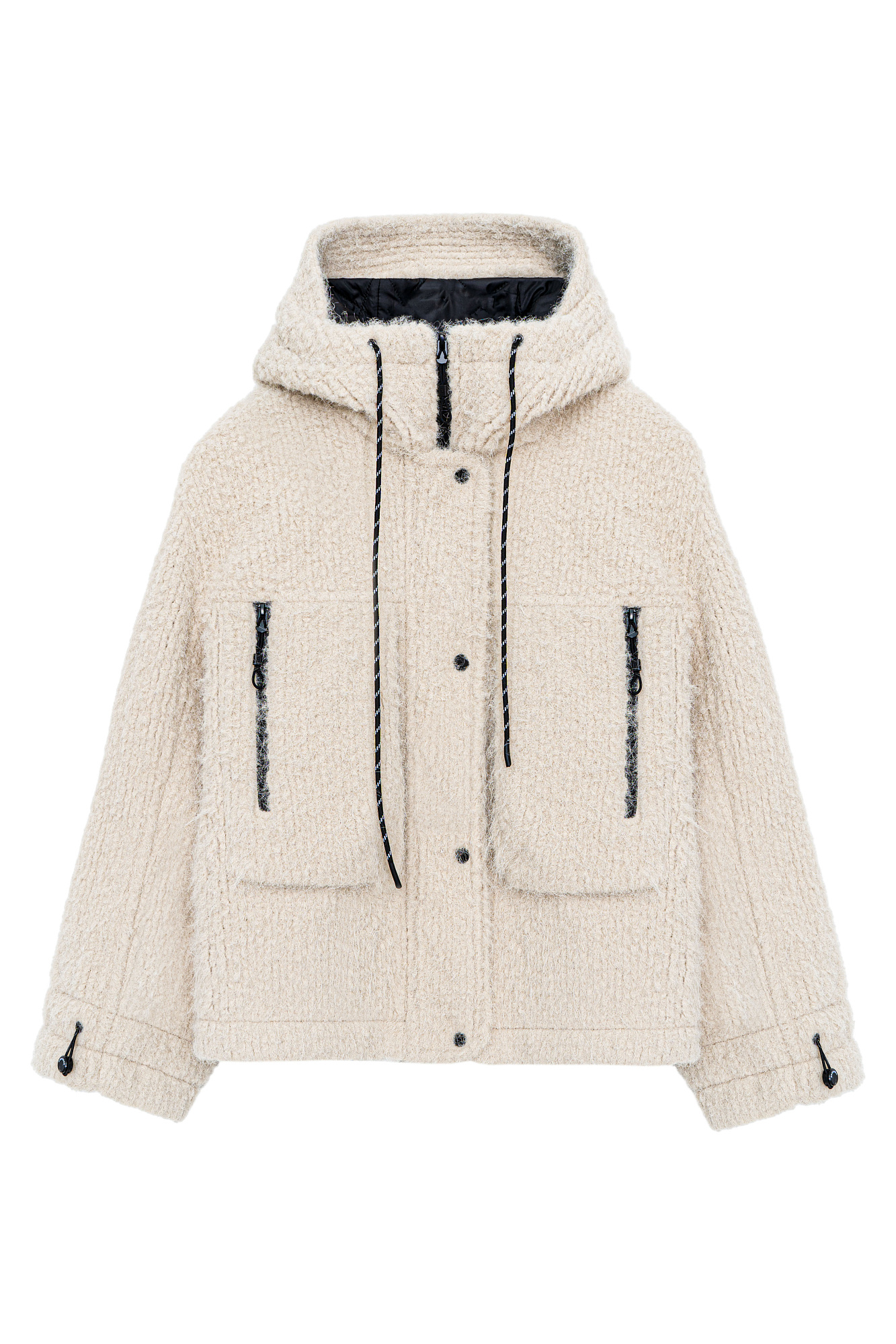 Куртка из экомеха на стеганой подкладке. Модель с капюшоном и двумя накладными карманами. Застежка на молнию под планкой с кнопками.
