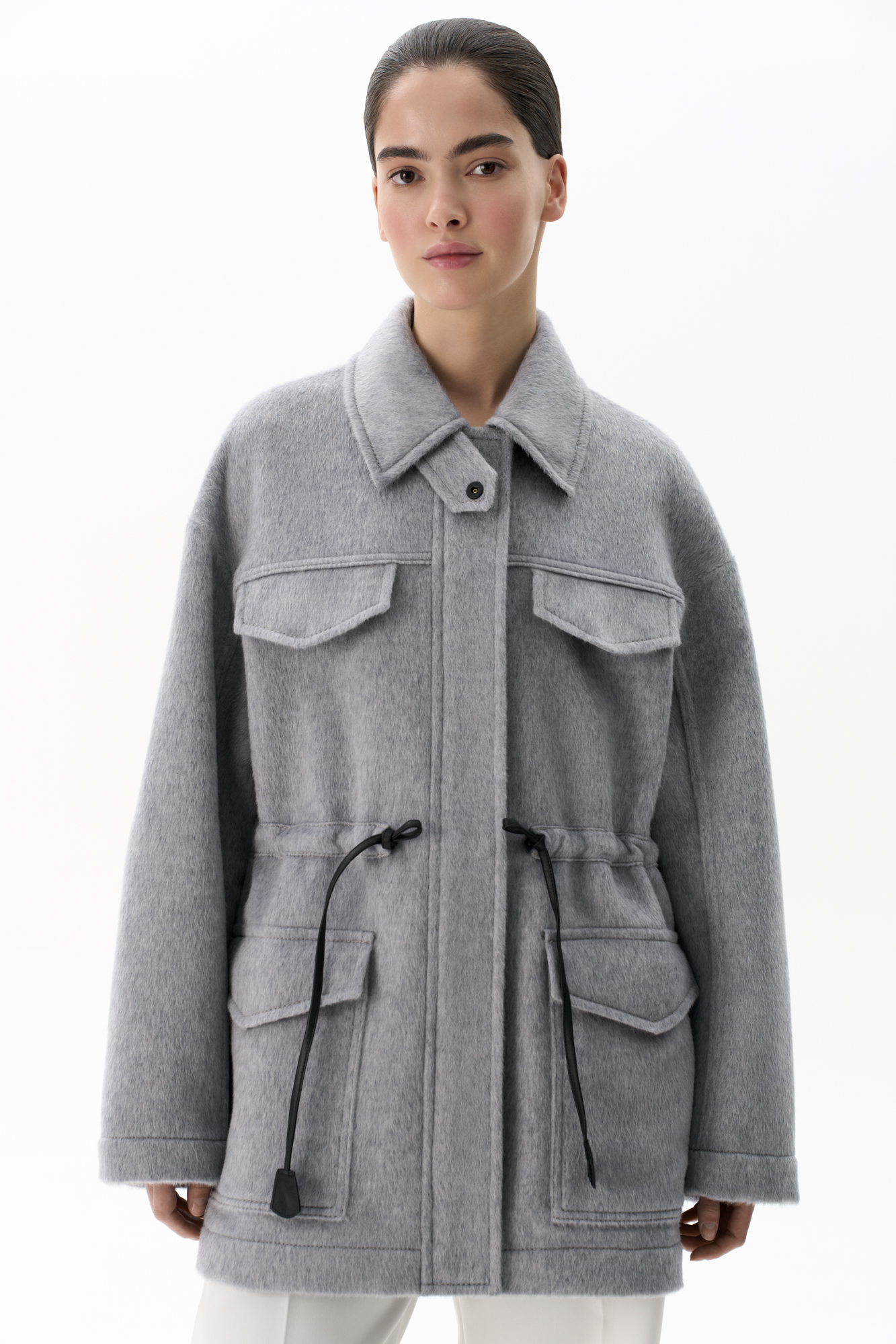 Куртка из 100% шерсти. Модель свободного силуэта со спущенной линией плеча, регулируемой кулиской на поясе и отложным воротником с патой. Изделие с накладными карманами. Застежка на молнию и магнитные кнопки под планкой.