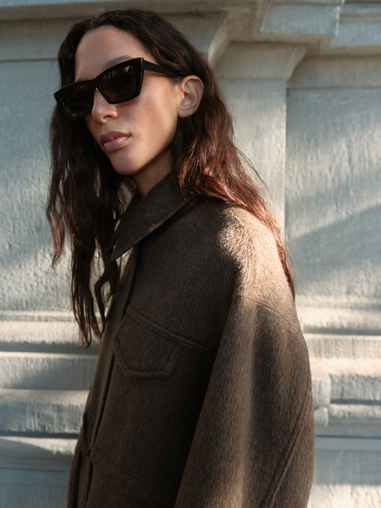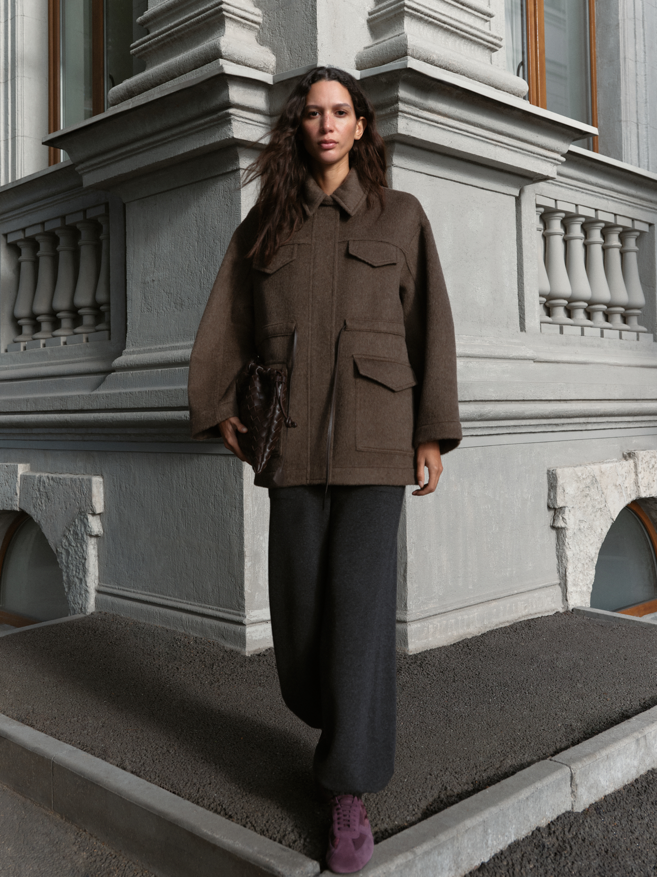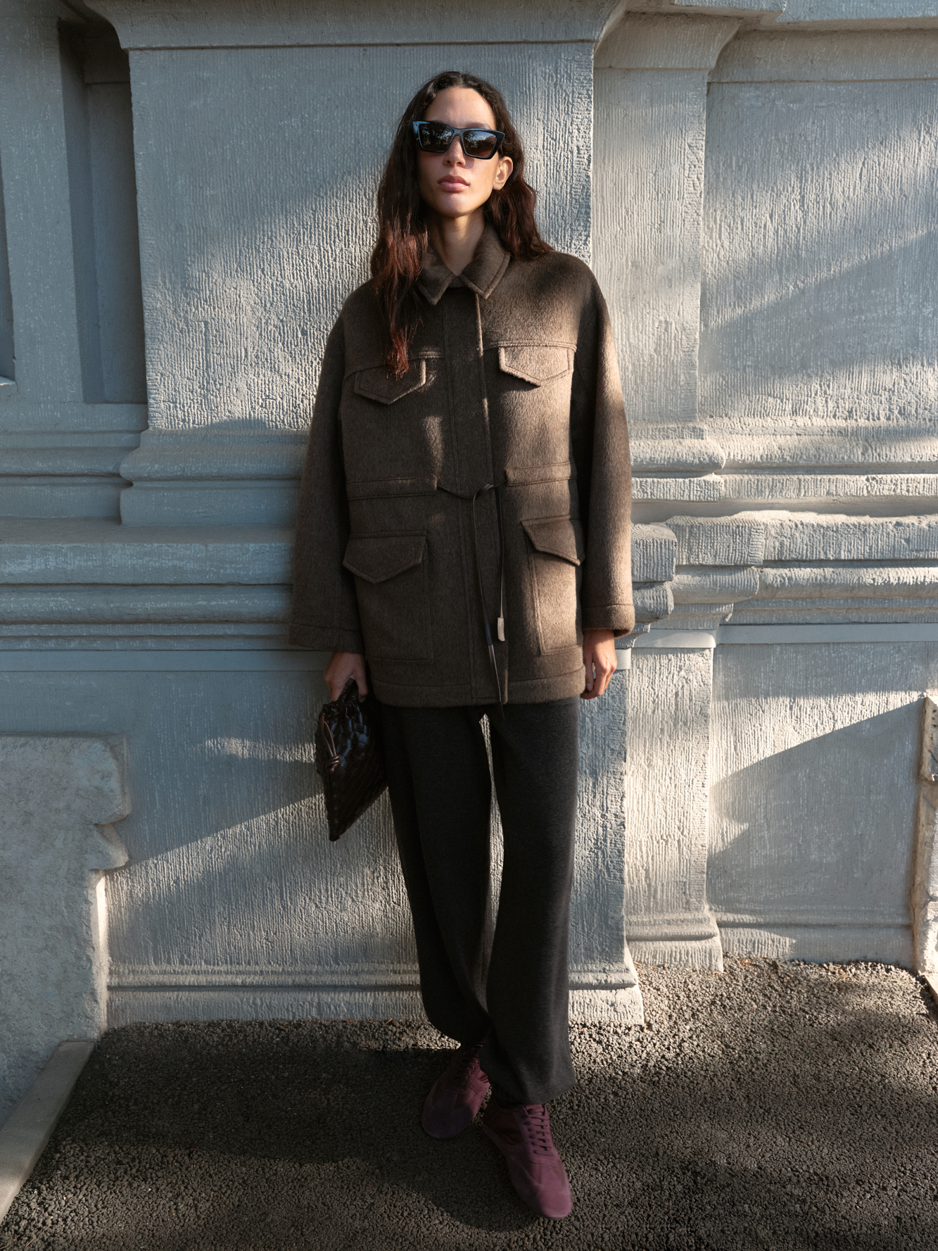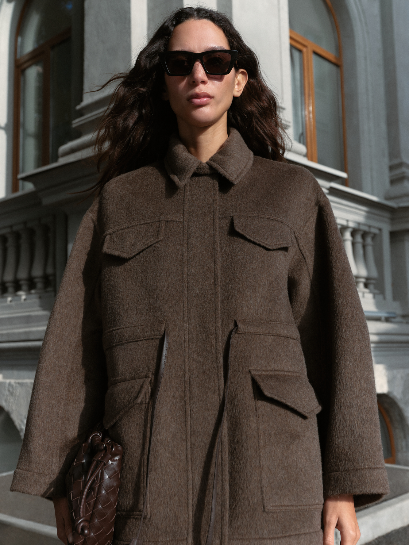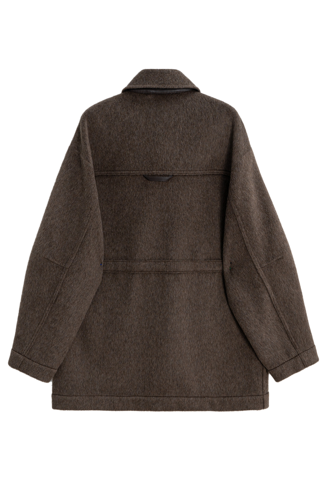 Куртка из 100% шерсти. Модель свободного силуэта со спущенной линией плеча, регулируемой кулиской на поясе и отложным воротником с патой. Изделие с накладными карманами. Застежка на молнию и магнитные кнопки под планкой.