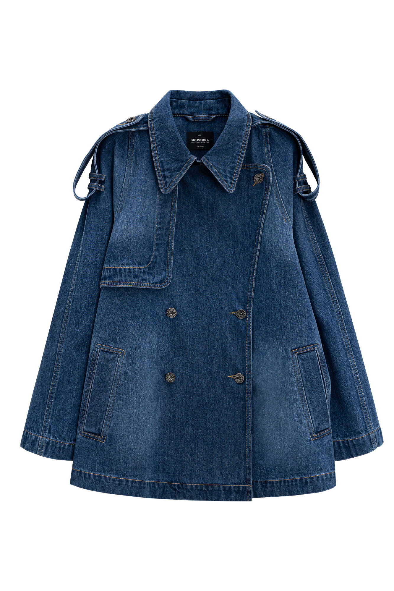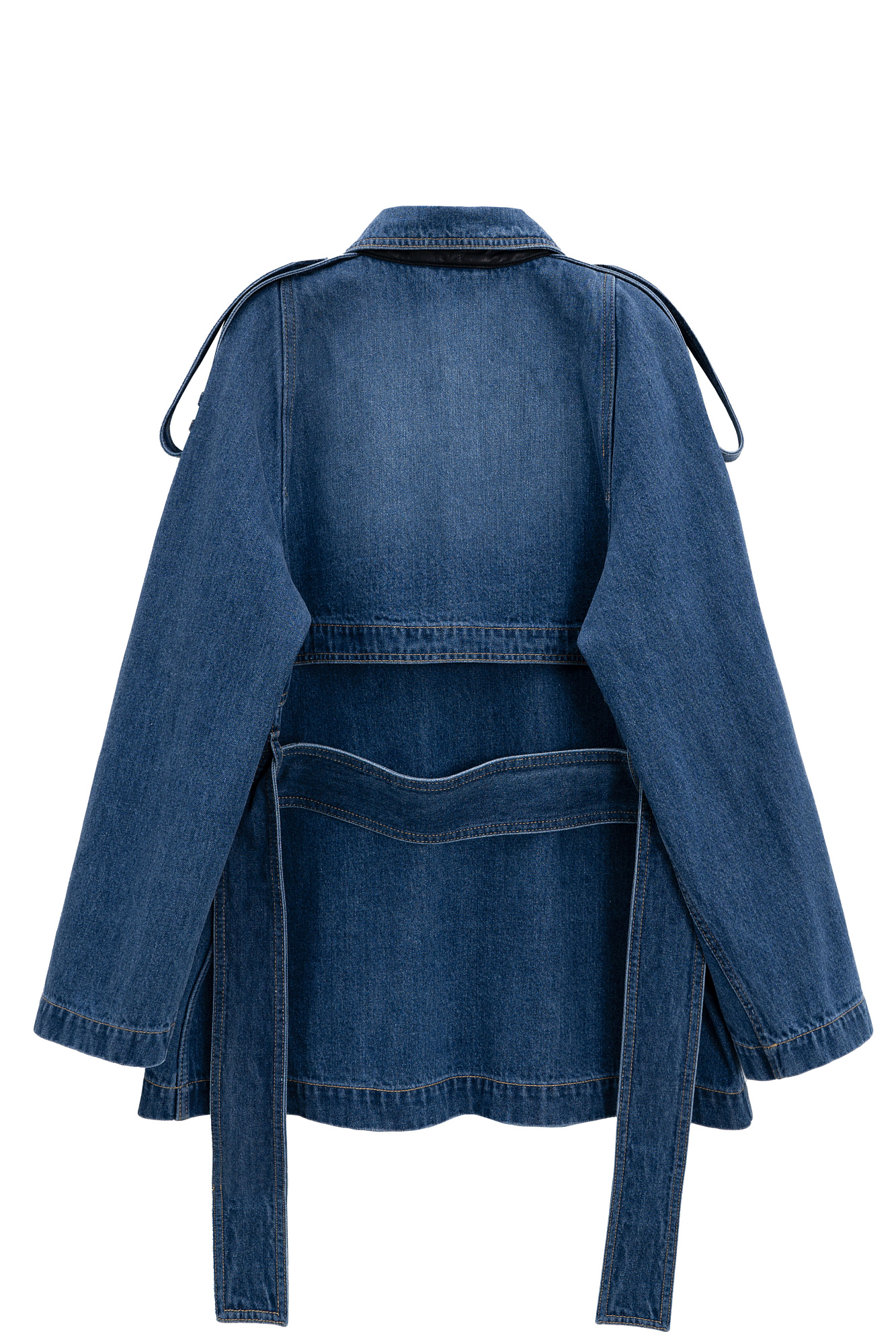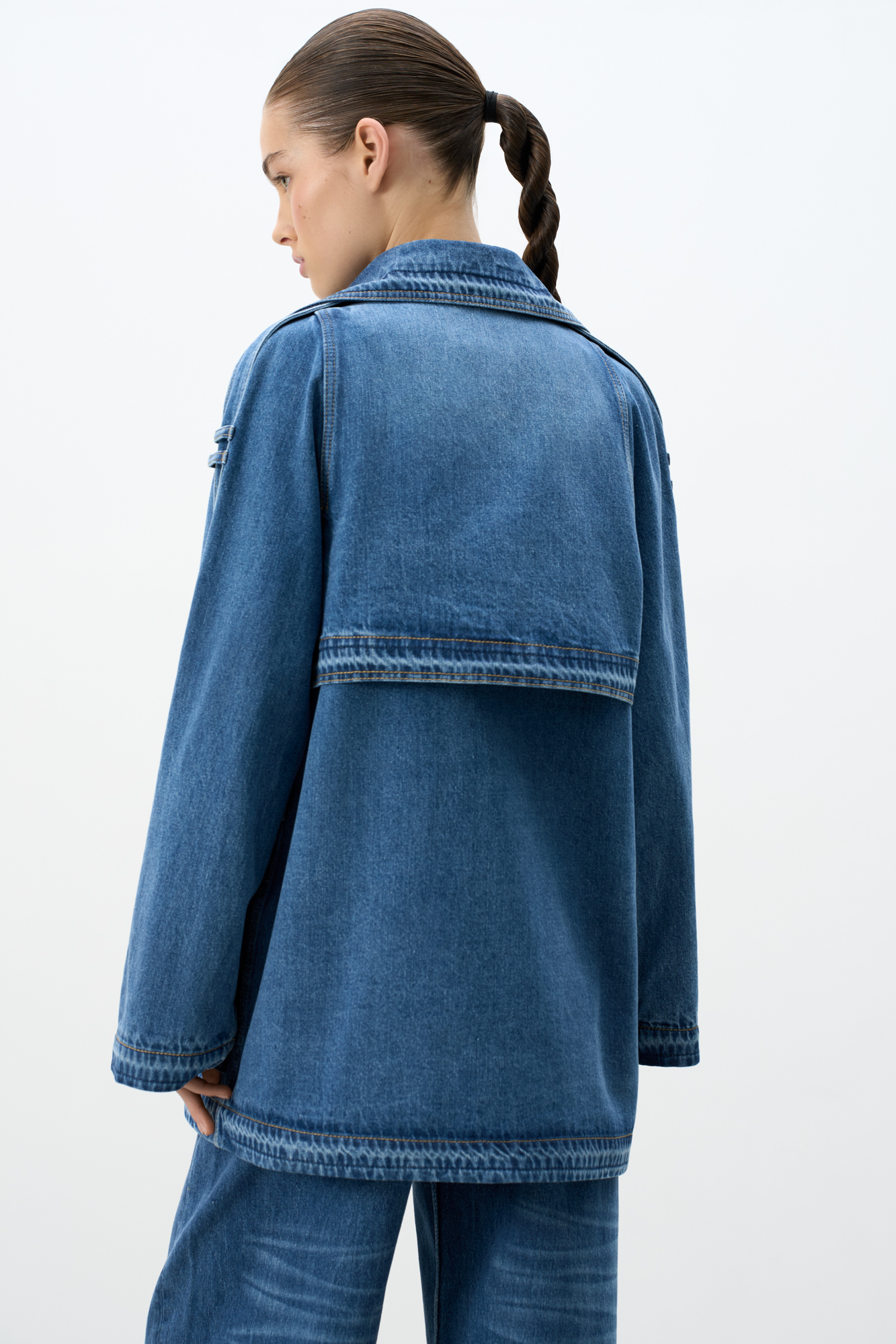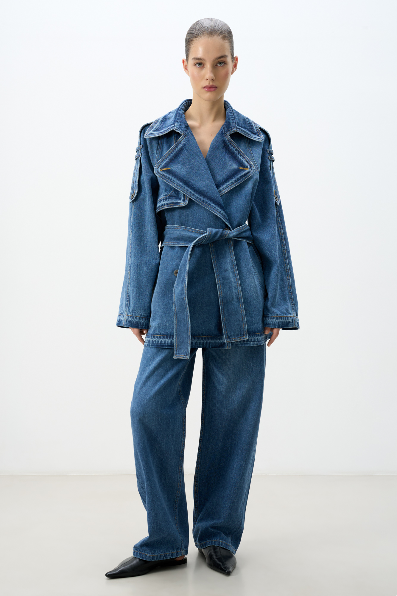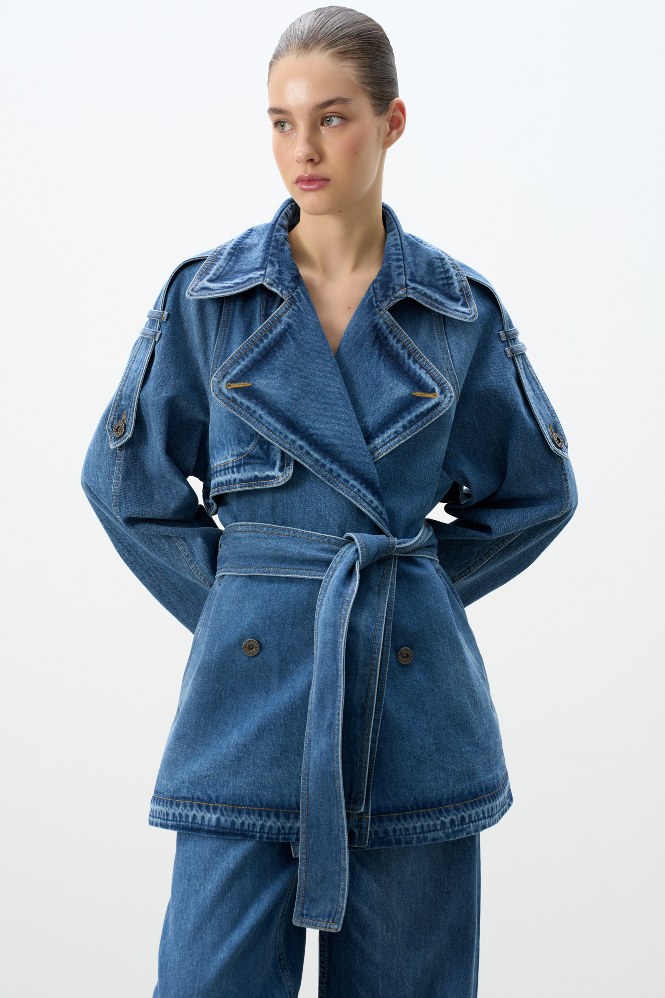 Джинсовый двубортный тренч из 100% хлопка. Модель свободного кроя, с классическим отложным воротником, отлетной кокеткой, патами на плечах, двумя боковыми карманами и шлевками на талии для пояса. Застежка на металлические пуговицы. Изделие без подкладки.