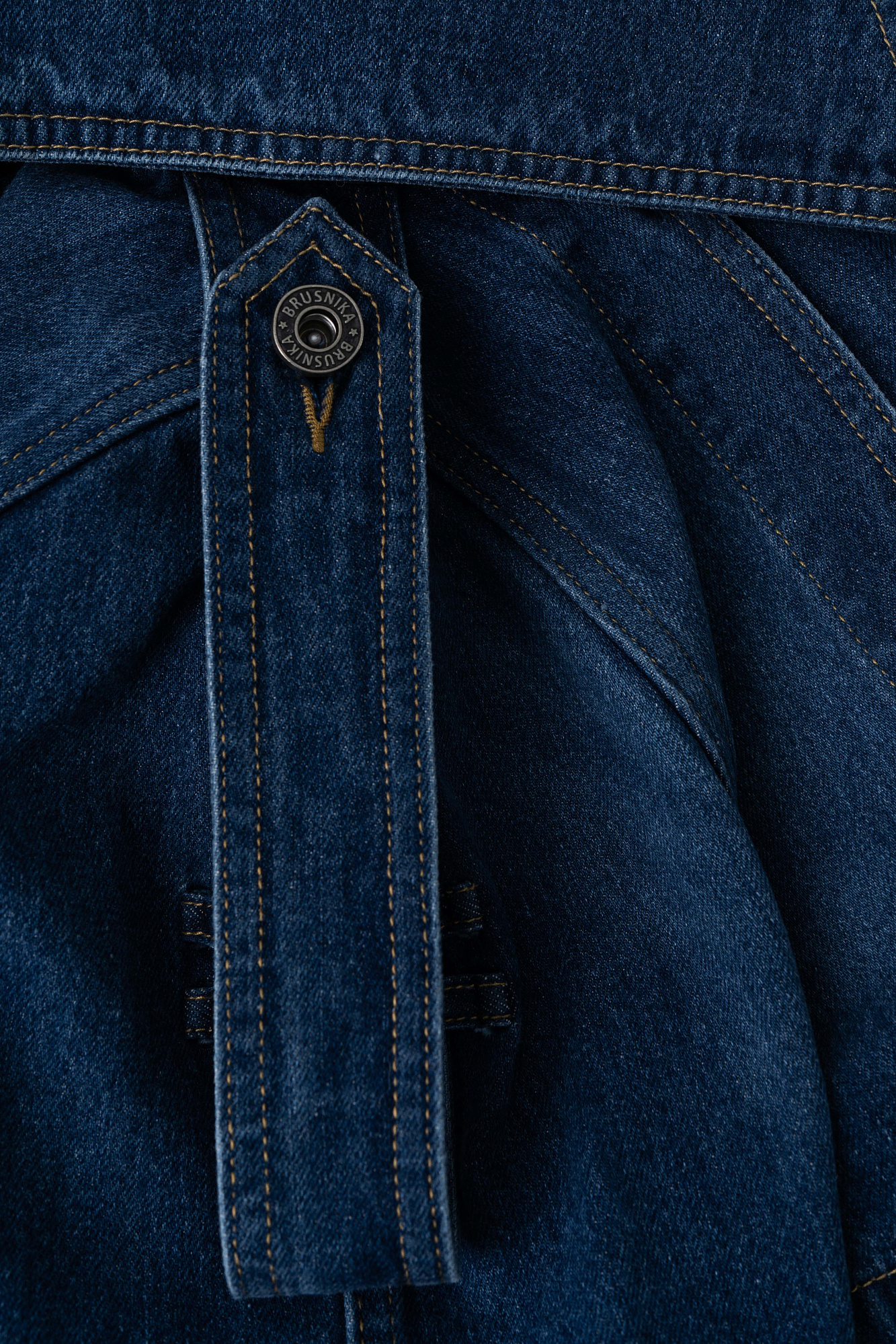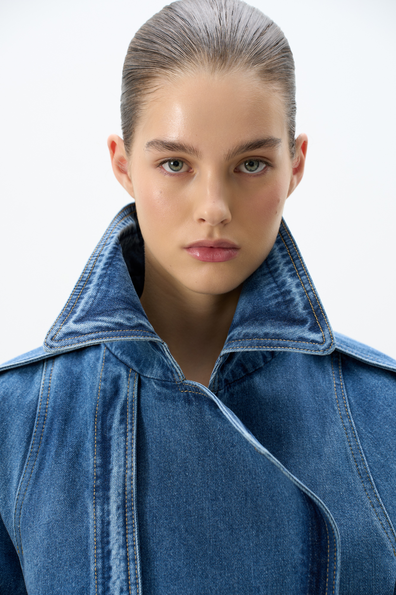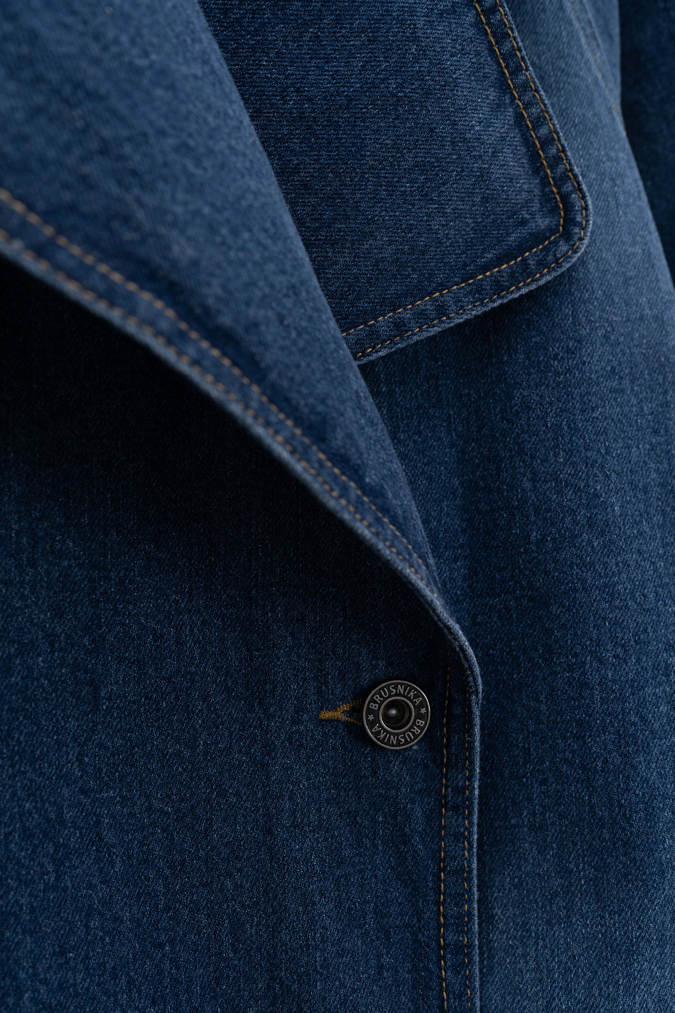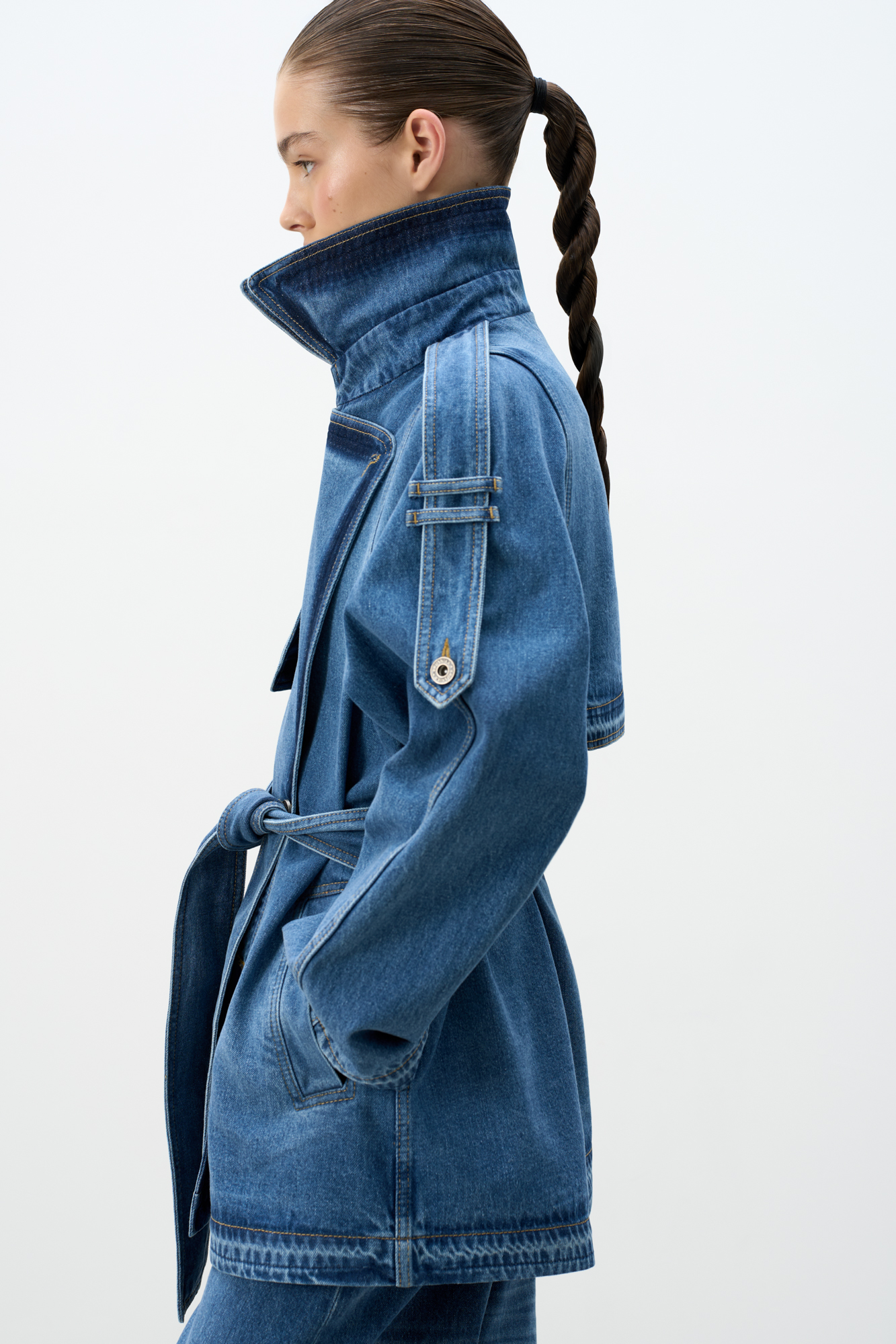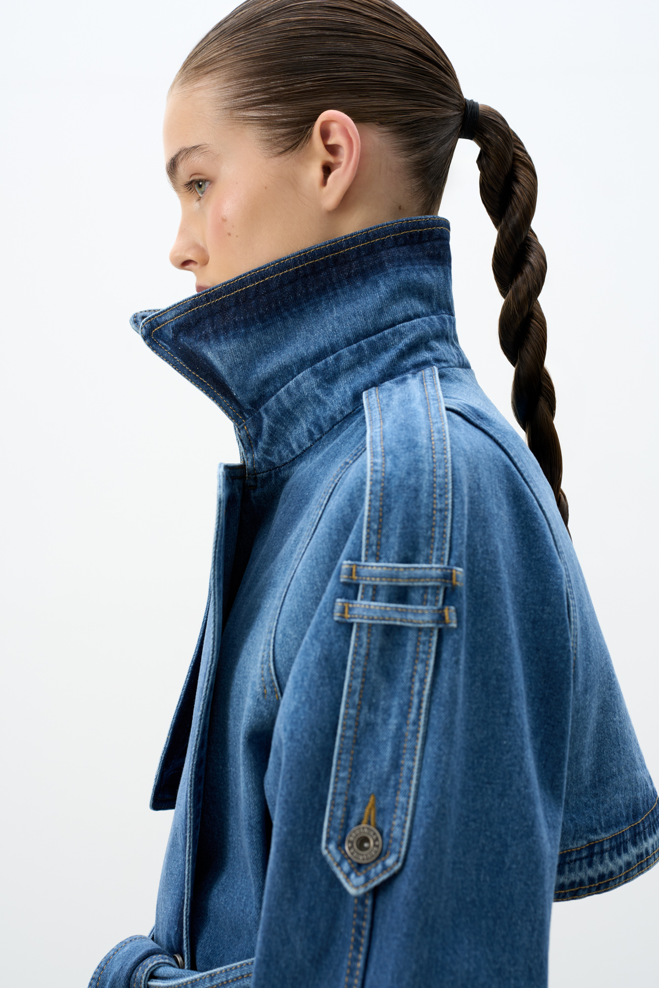 Джинсовый двубортный тренч из 100% хлопка. Модель свободного кроя, с классическим отложным воротником, отлетной кокеткой, патами на плечах, двумя боковыми карманами и шлевками на талии для пояса. Застежка на металлические пуговицы. Изделие без подкладки.
