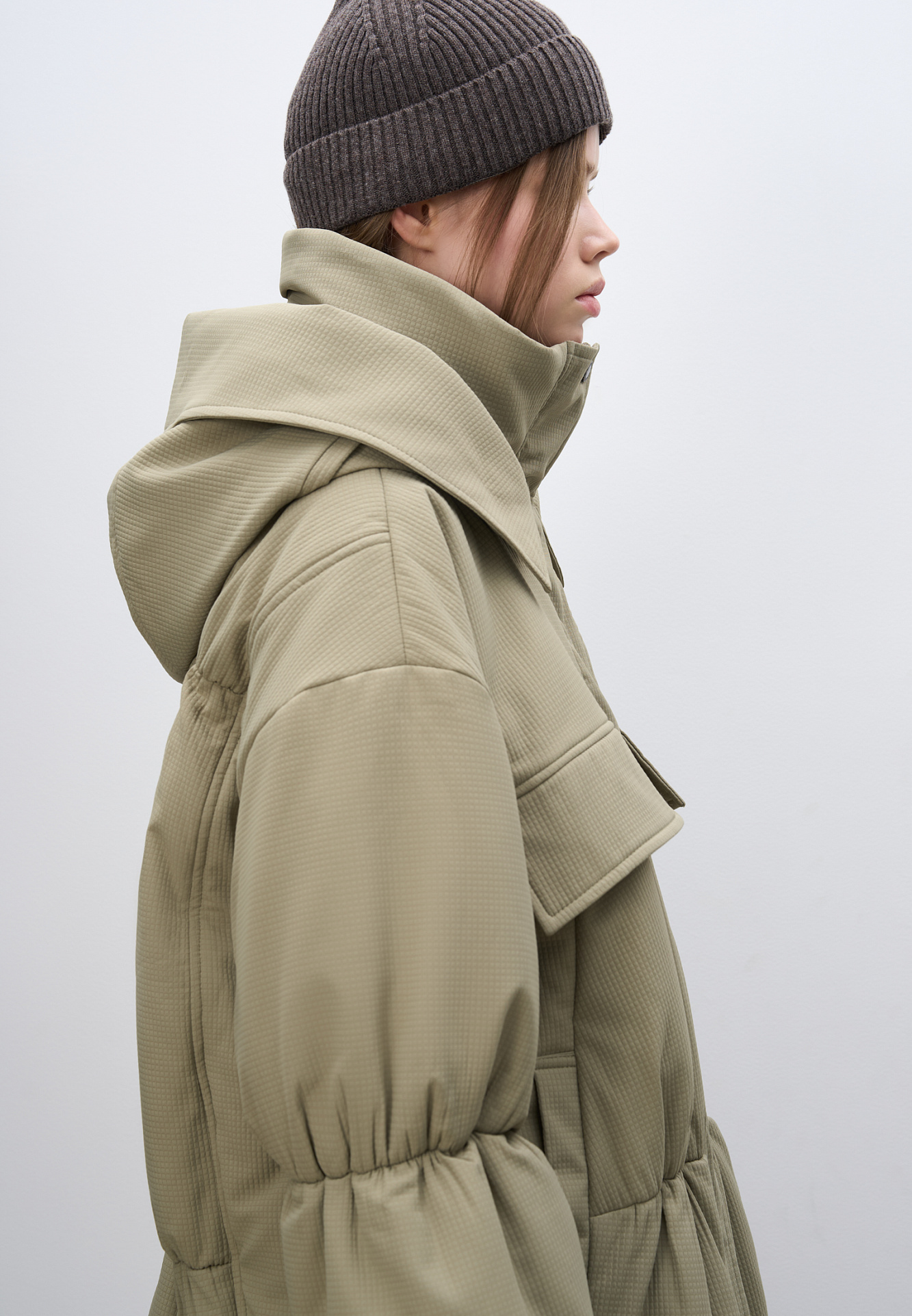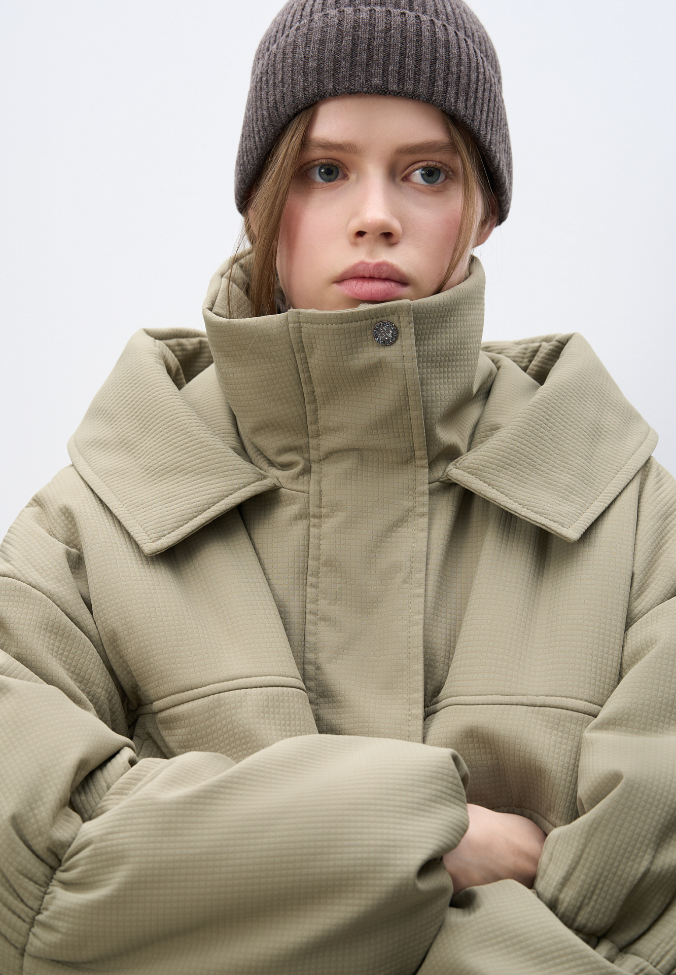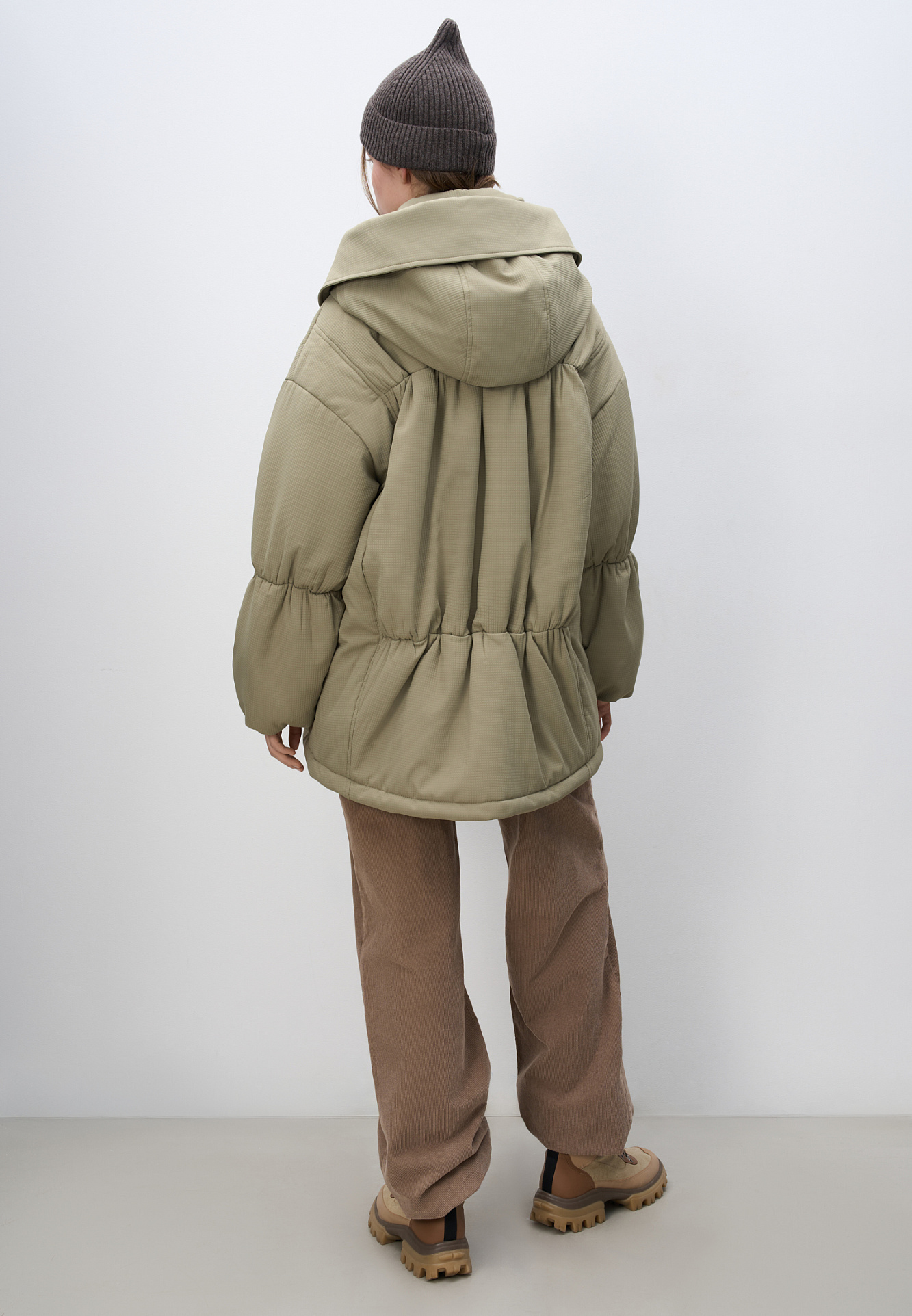 Длинная куртка на синтепоне из текстурной ткани. Модель свободного силуэта со спущенной линией плеча, накладными и боковыми карманами, воротником-стойкой и капюшоном. Изделие на подкладке. Застежка на молнию под планкой с кнопками.