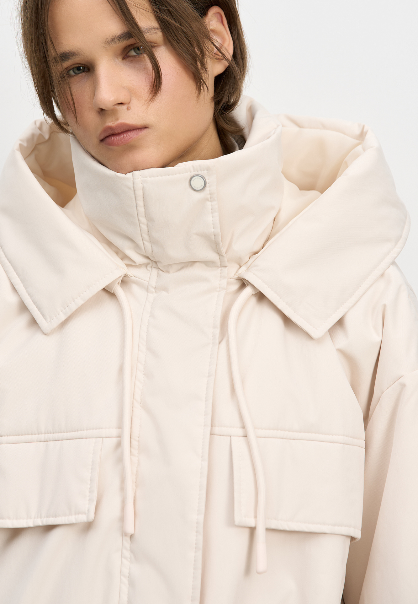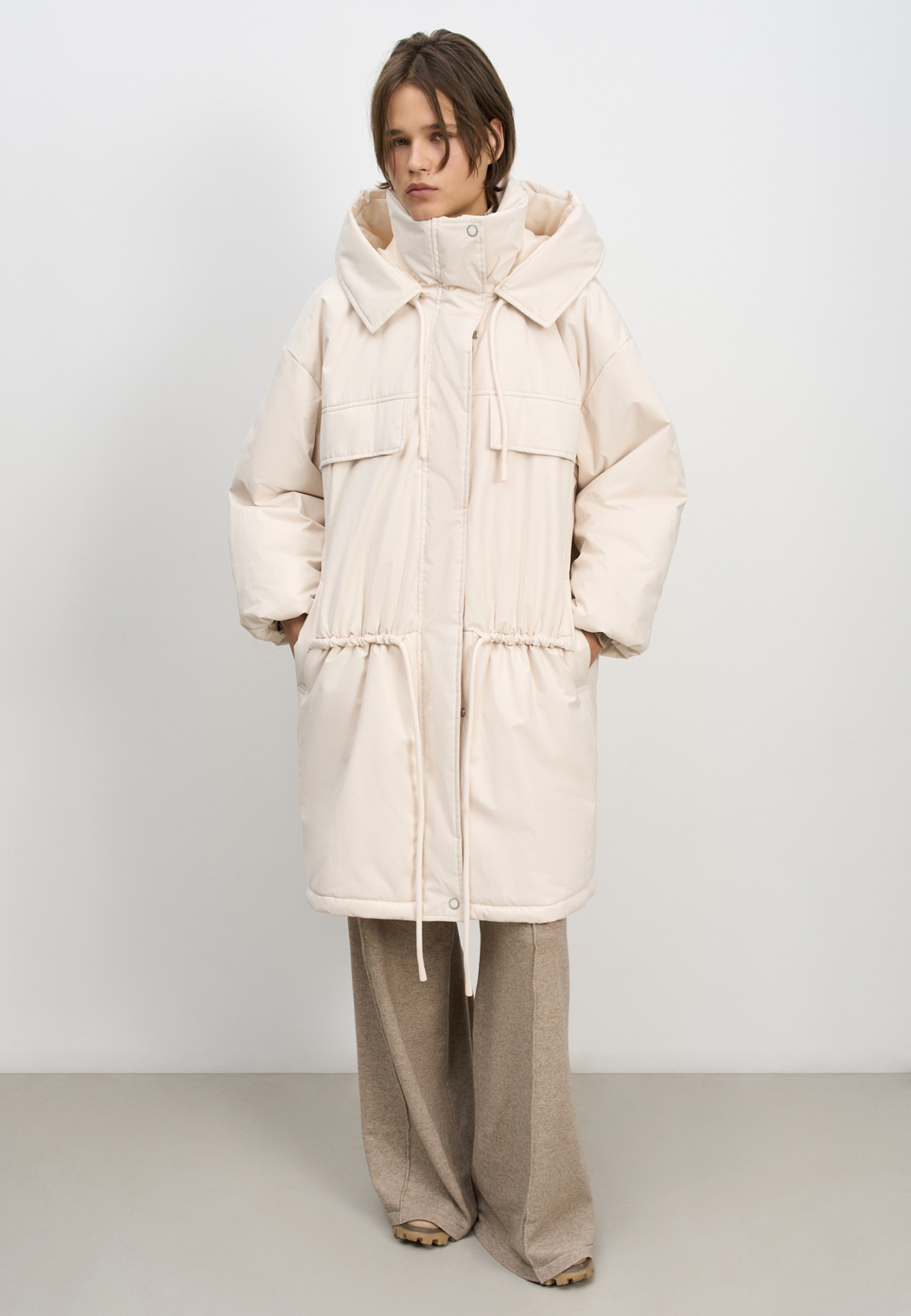 Длинная куртка на синтепоне с капюшоном. Модель свободного силуэта со спущенной линией плеча, накладными и боковыми карманами, регулируемой кулиской на поясе. Изделие на подкладке. Застежка на молнию и магнитные кнопки.