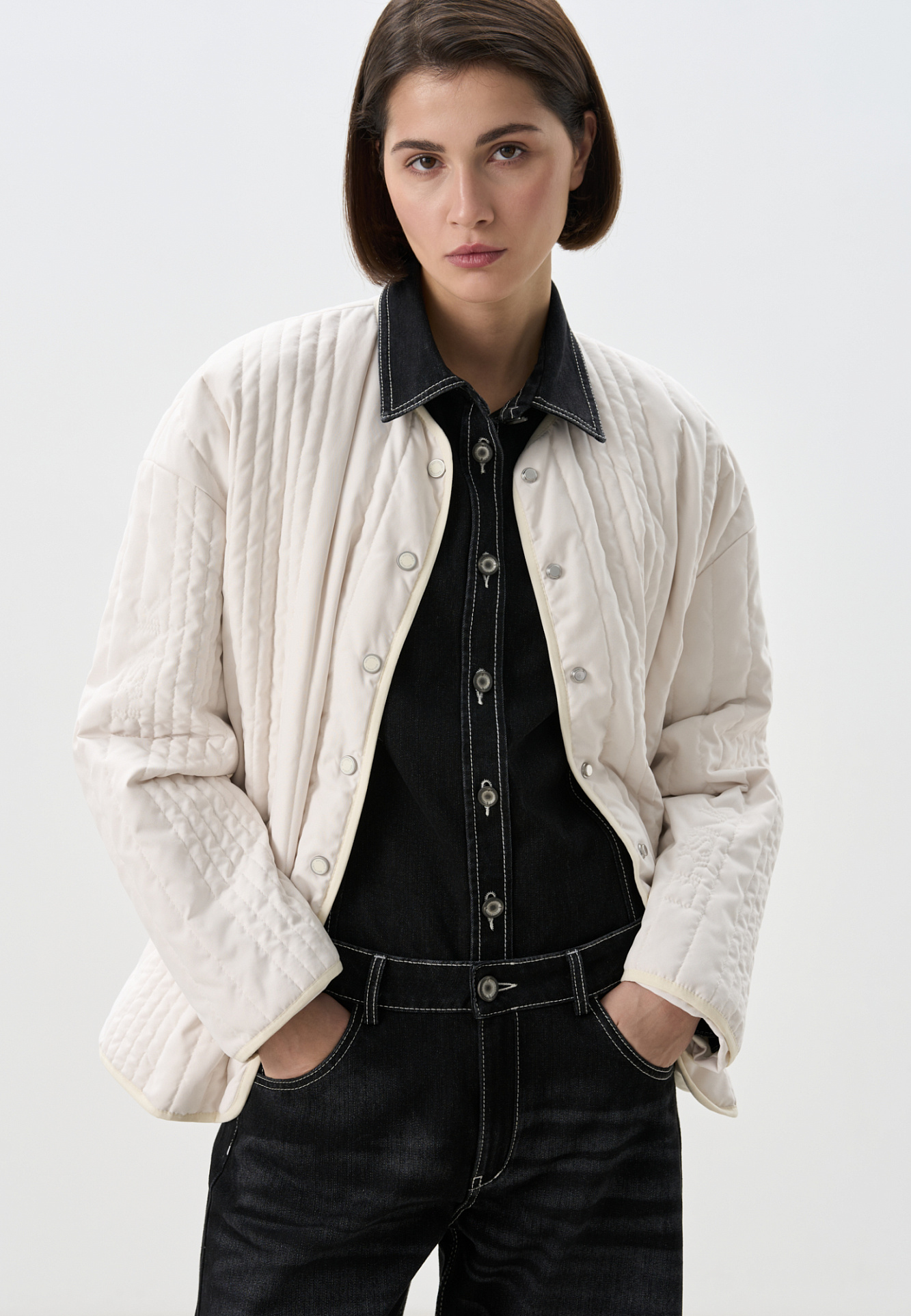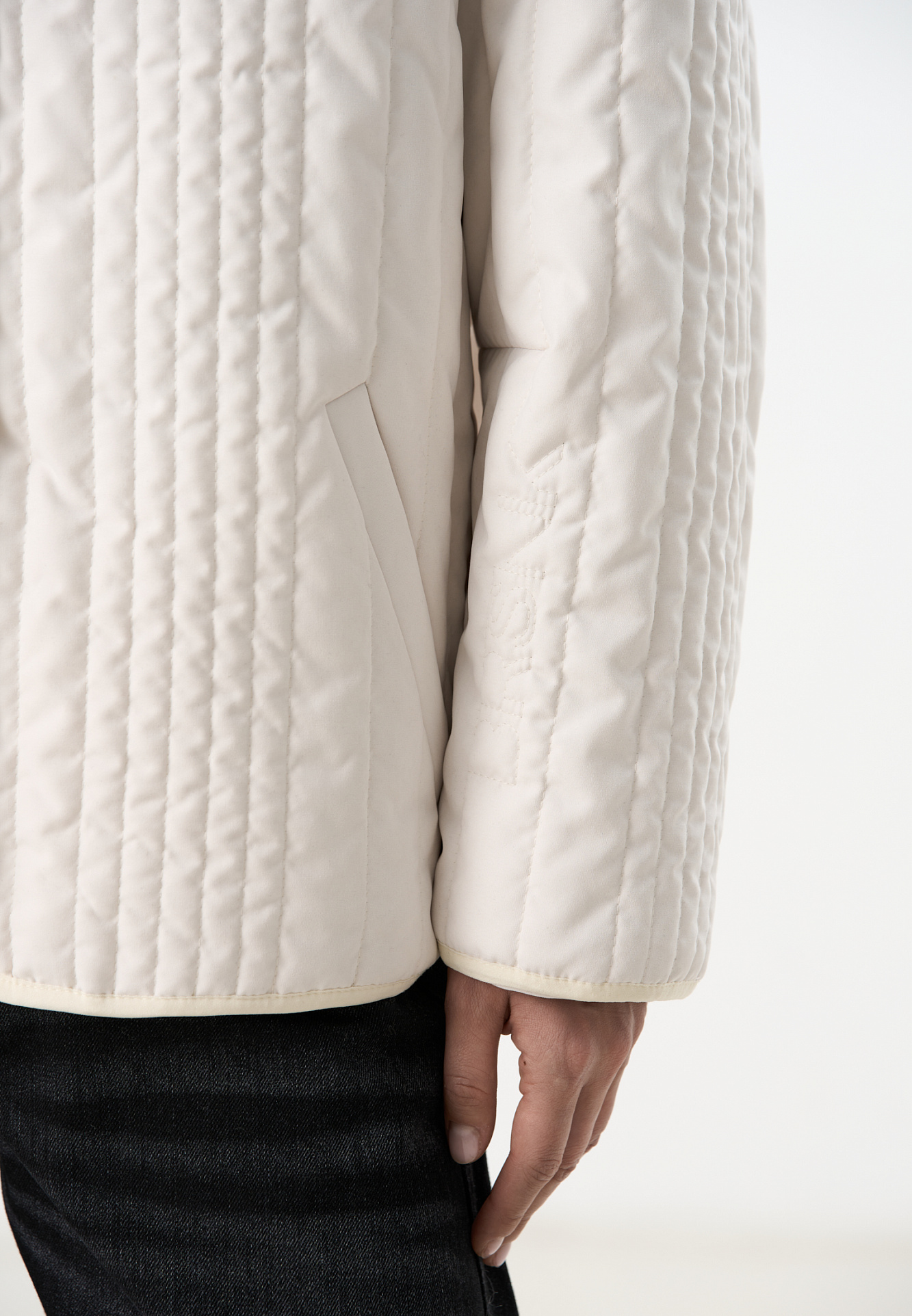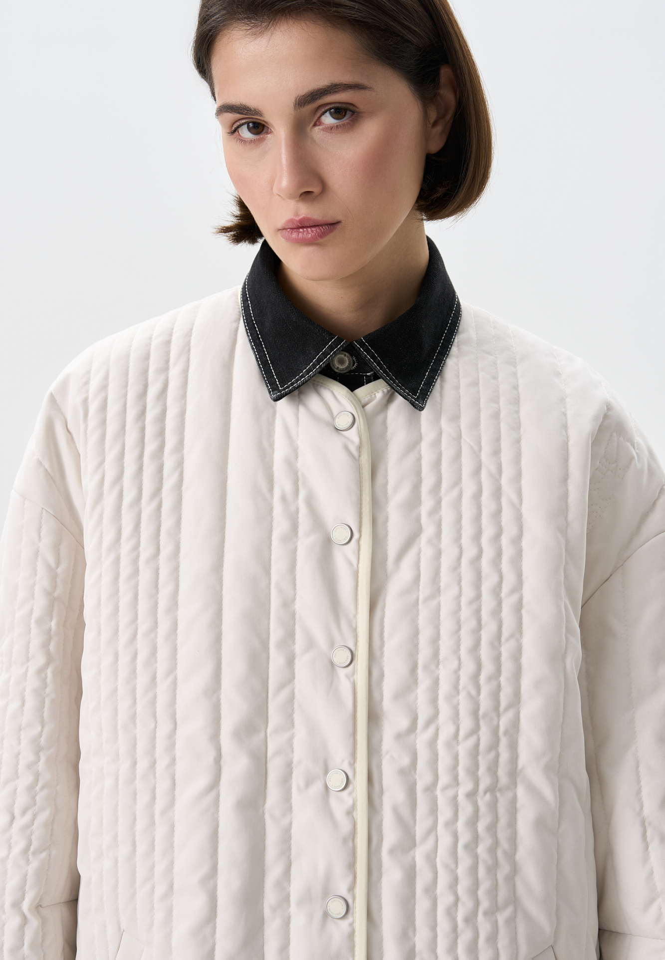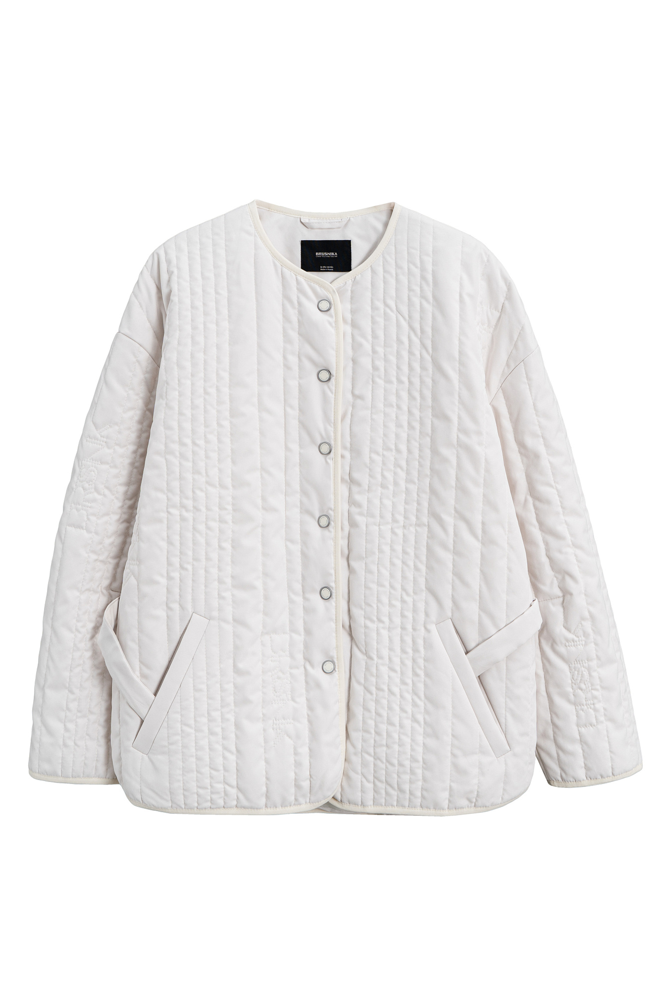 Стеганая куртка на синтепоне из нейлона. Модель с круглым вырезом горловины, спущенной линией плеч и карманами. Застежка на кнопки.