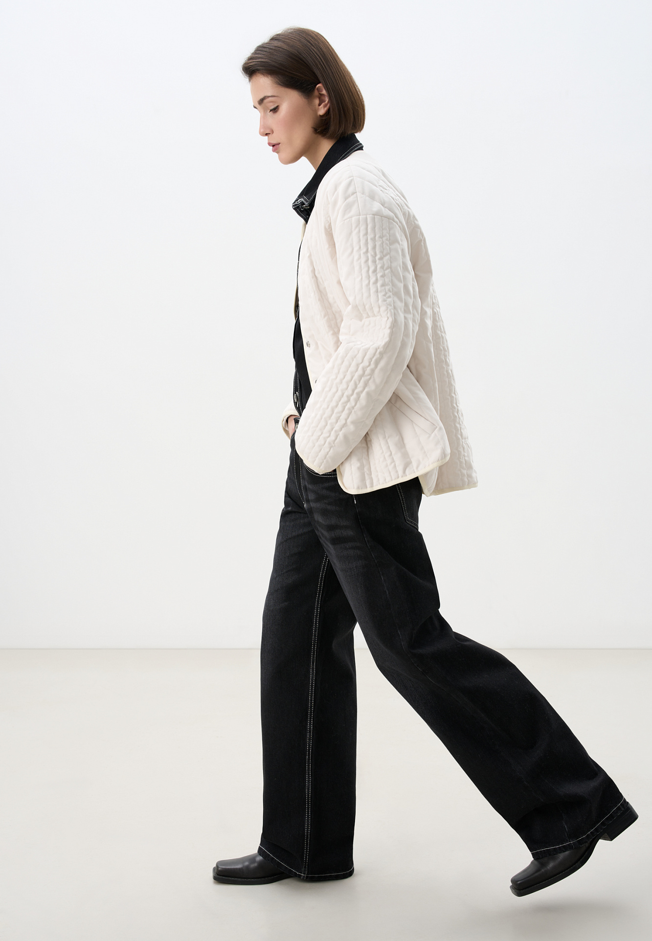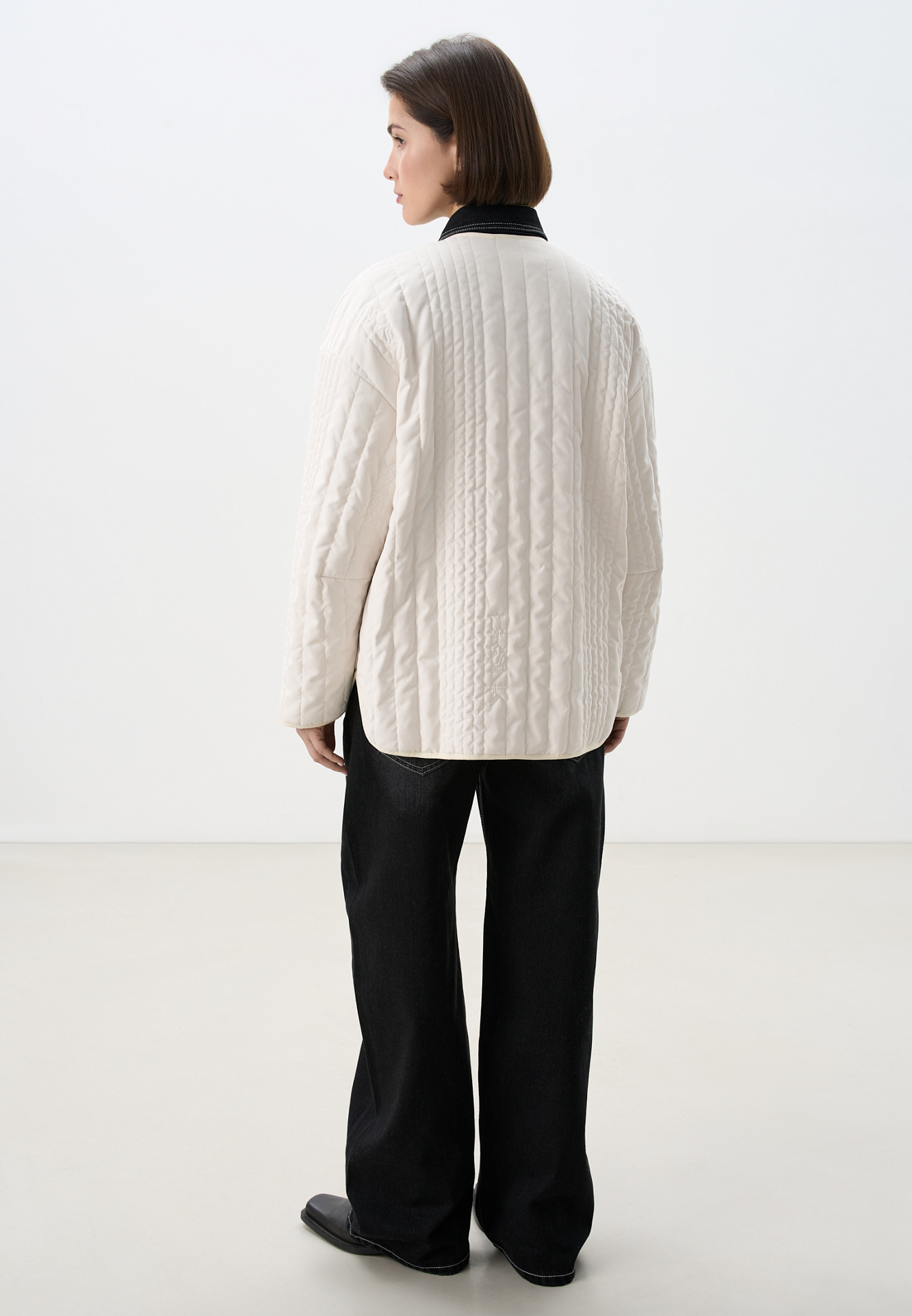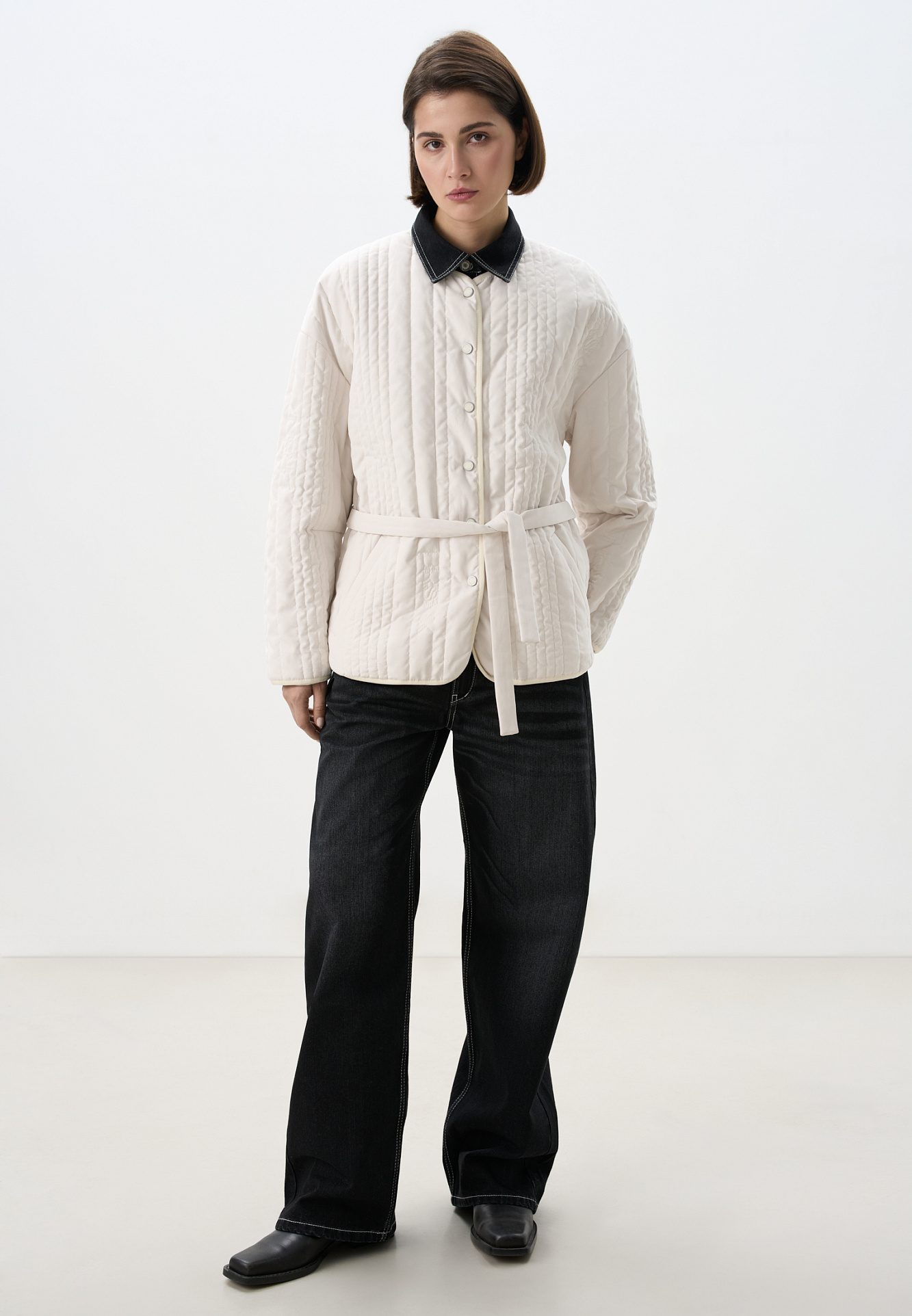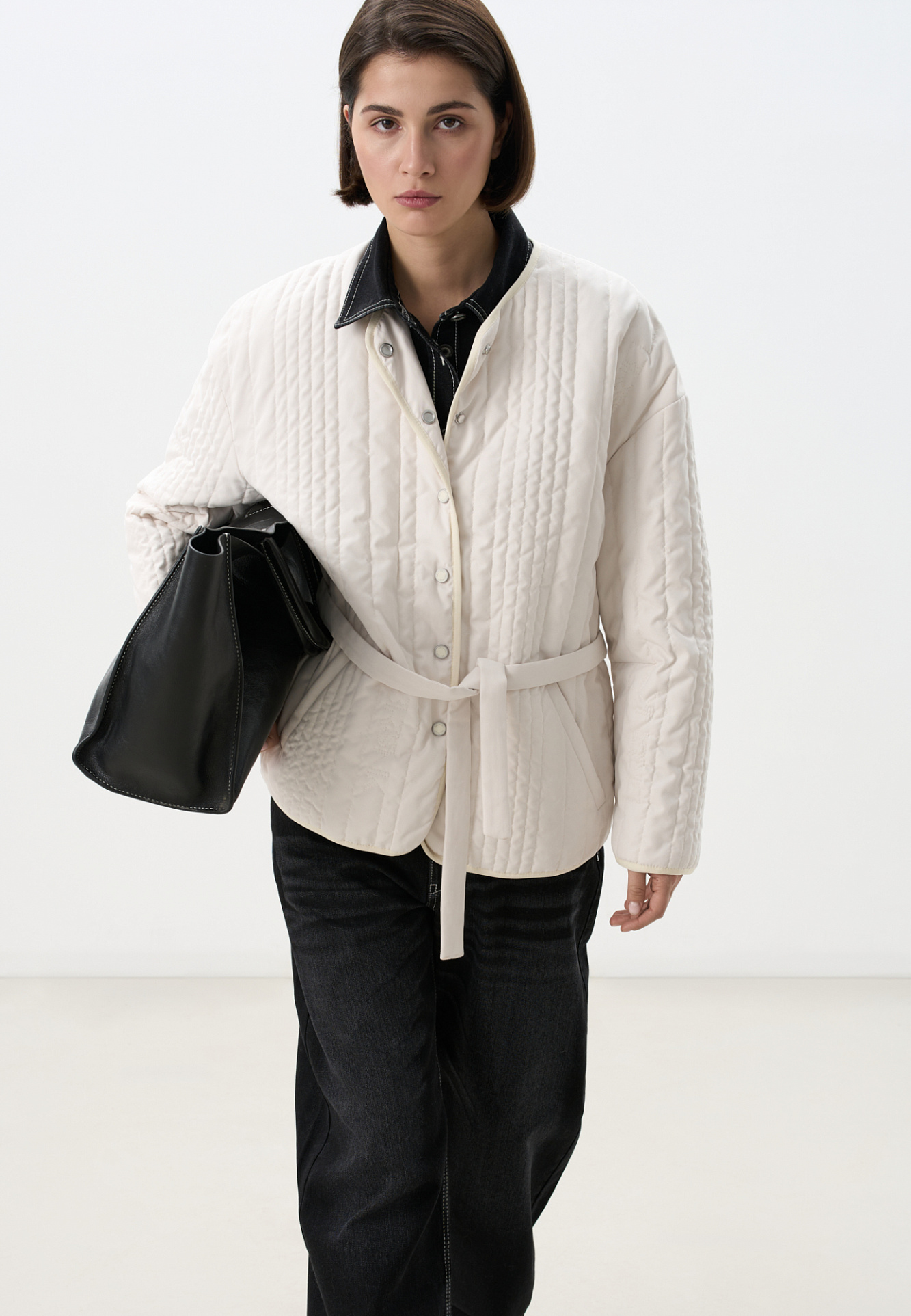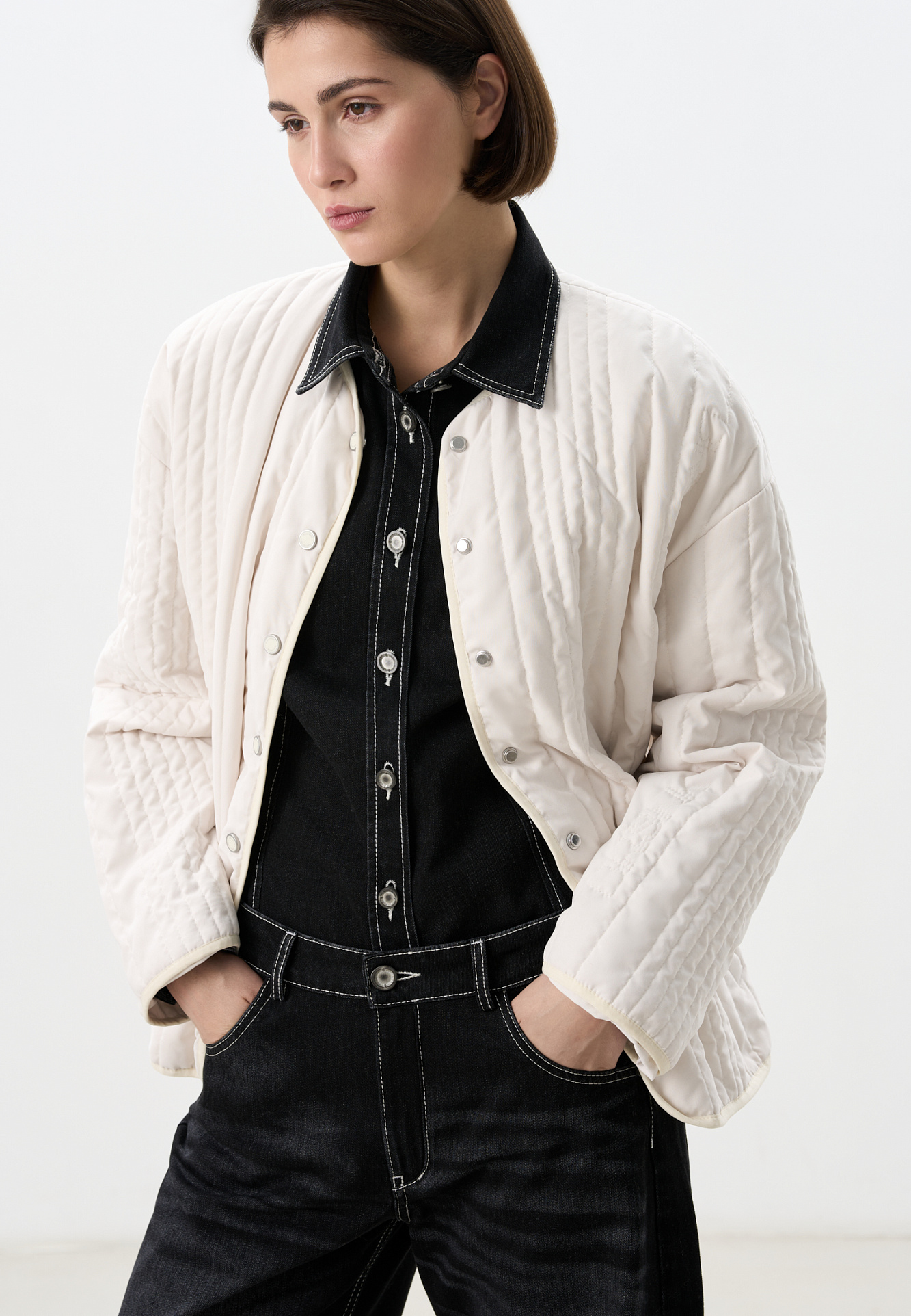 Стеганая куртка на синтепоне из нейлона. Модель с круглым вырезом горловины, спущенной линией плеч и карманами. Застежка на кнопки.