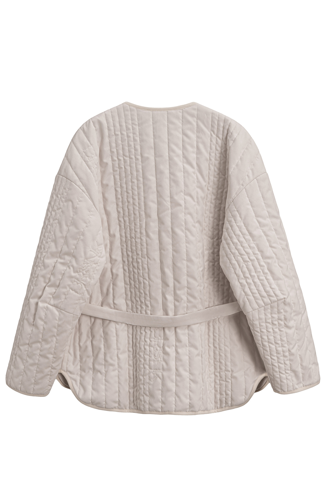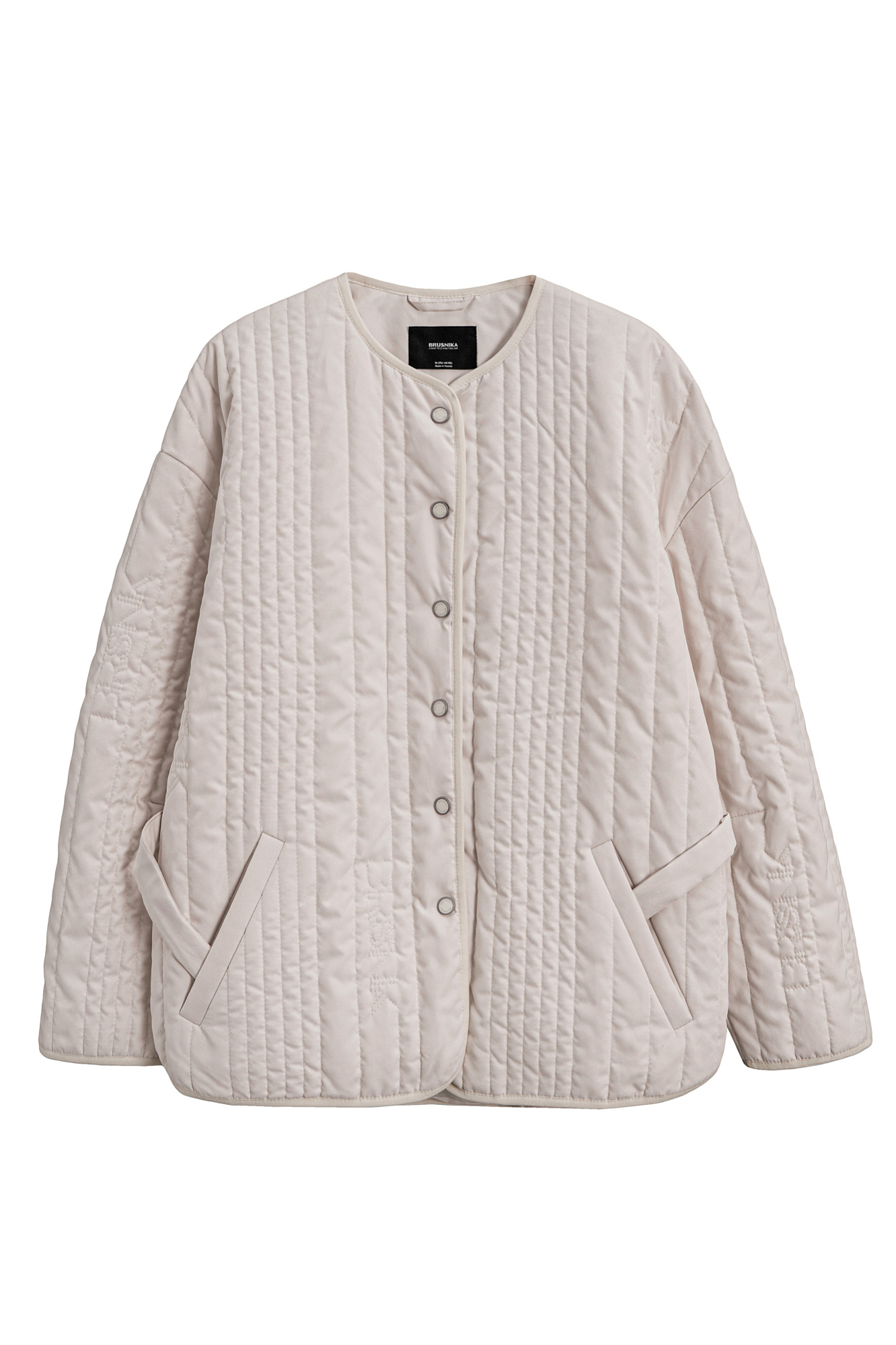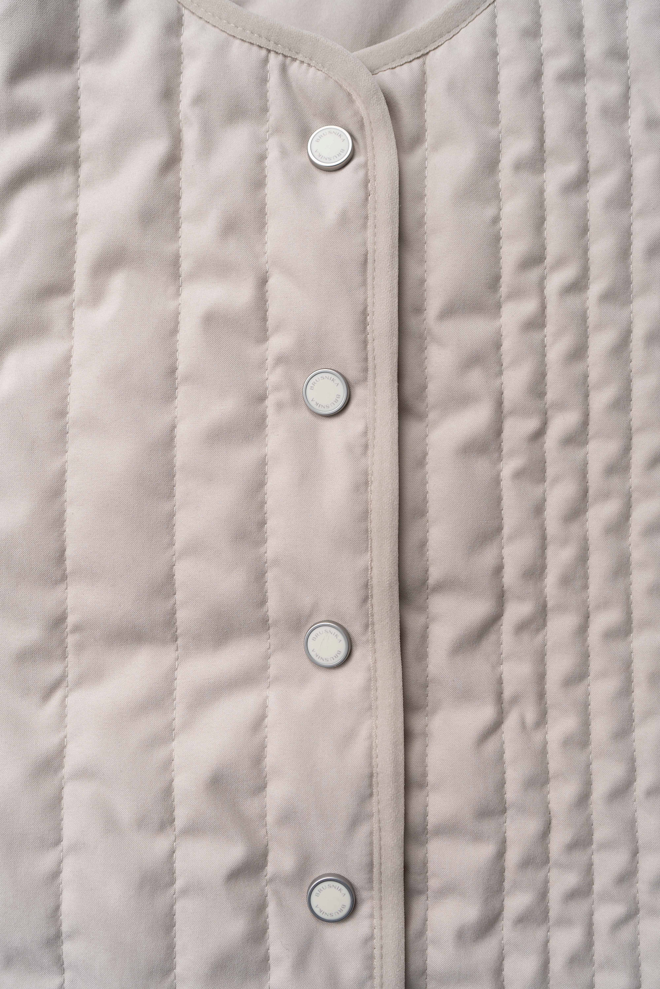 Стеганая куртка на синтепоне из нейлона. Модель с круглым вырезом горловины, спущенной линией плеч и карманами. Застежка на кнопки.
