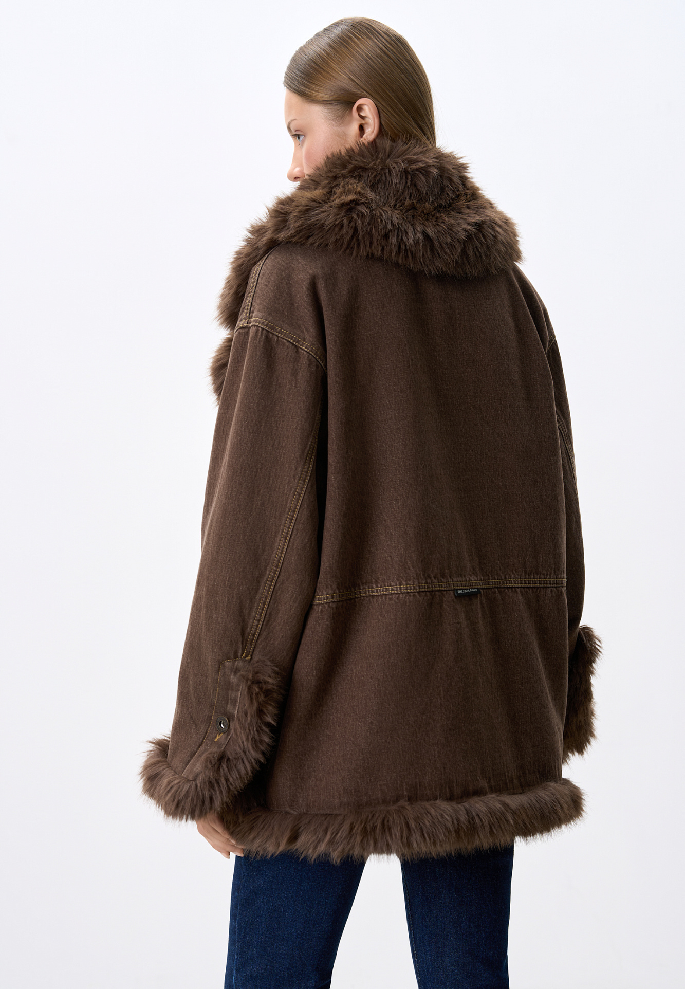 Утепленная джинсовая куртка из 100% хлопка. Модель свободного кроя с широким отложным воротником и манжетами, декорированными экомехом. Застежка на металлические пуговицы.