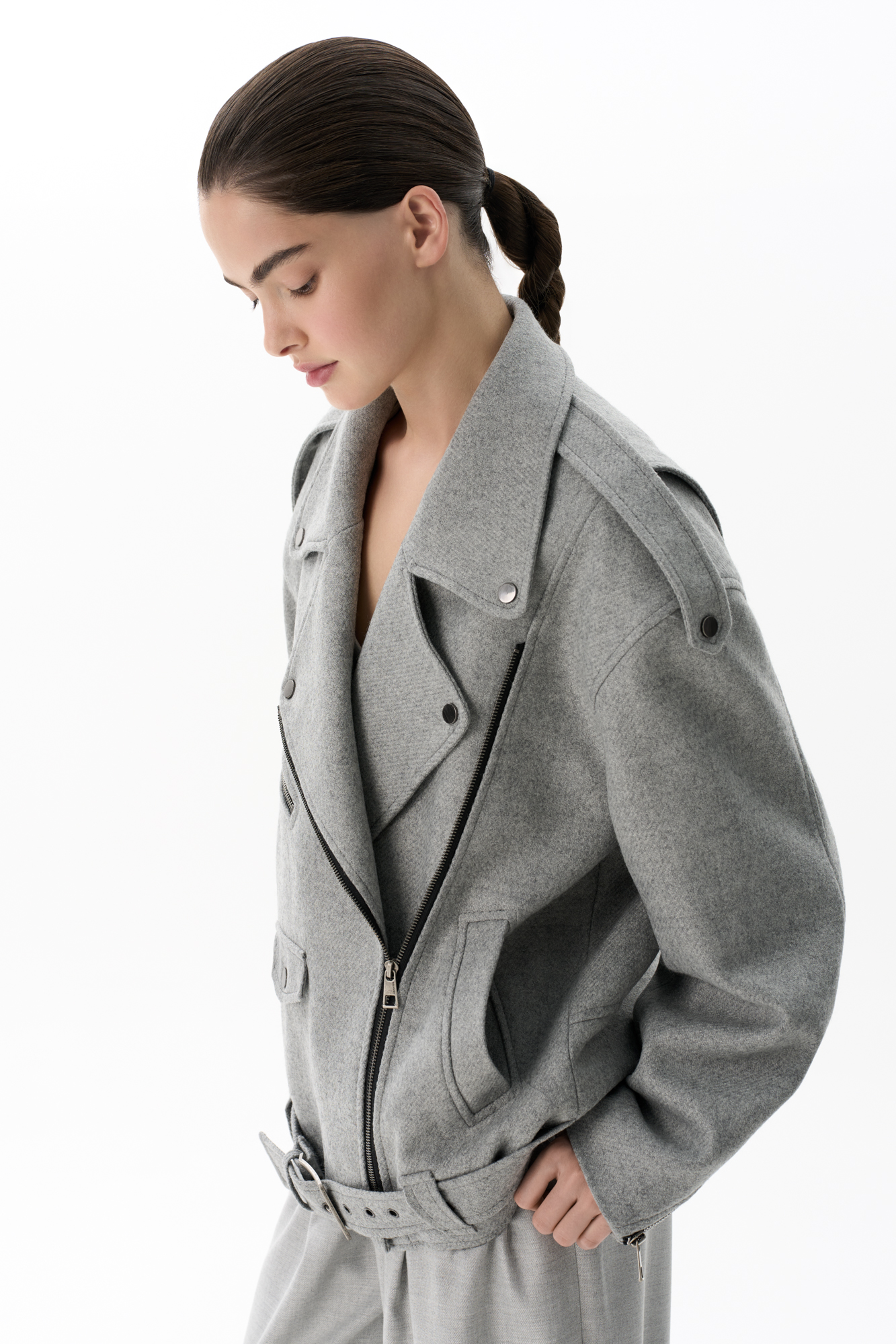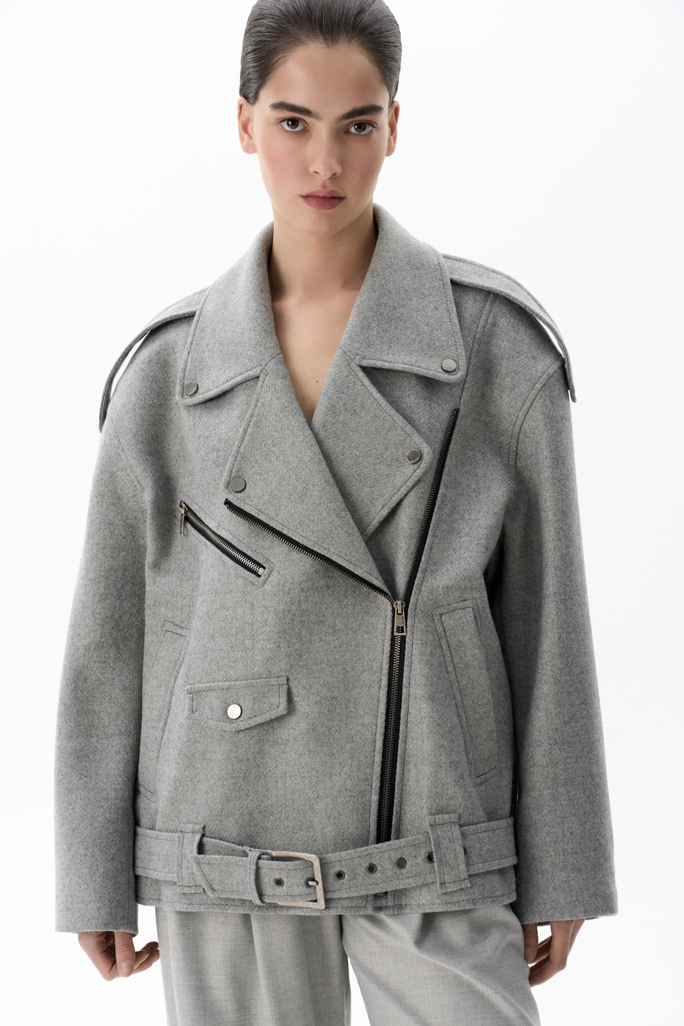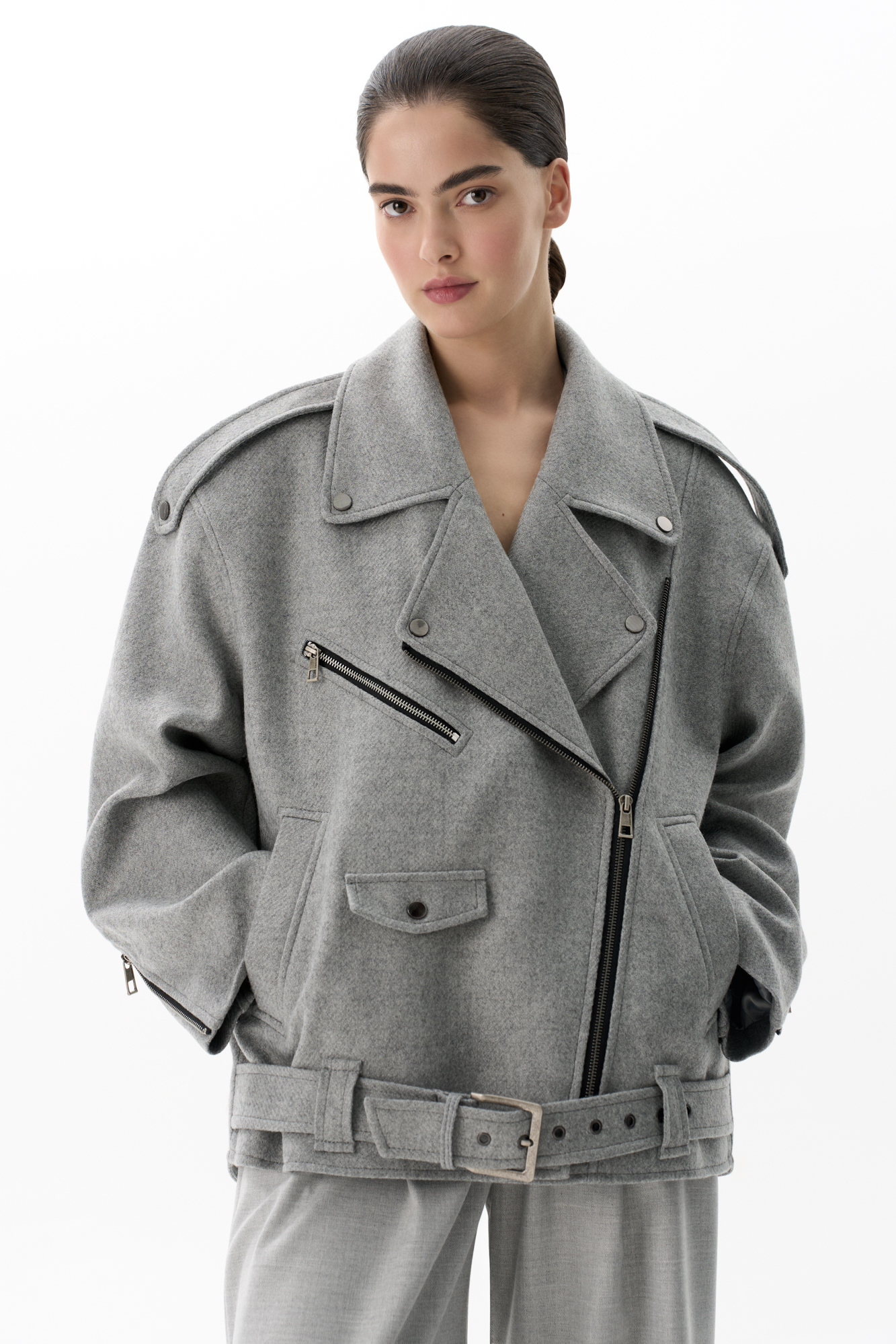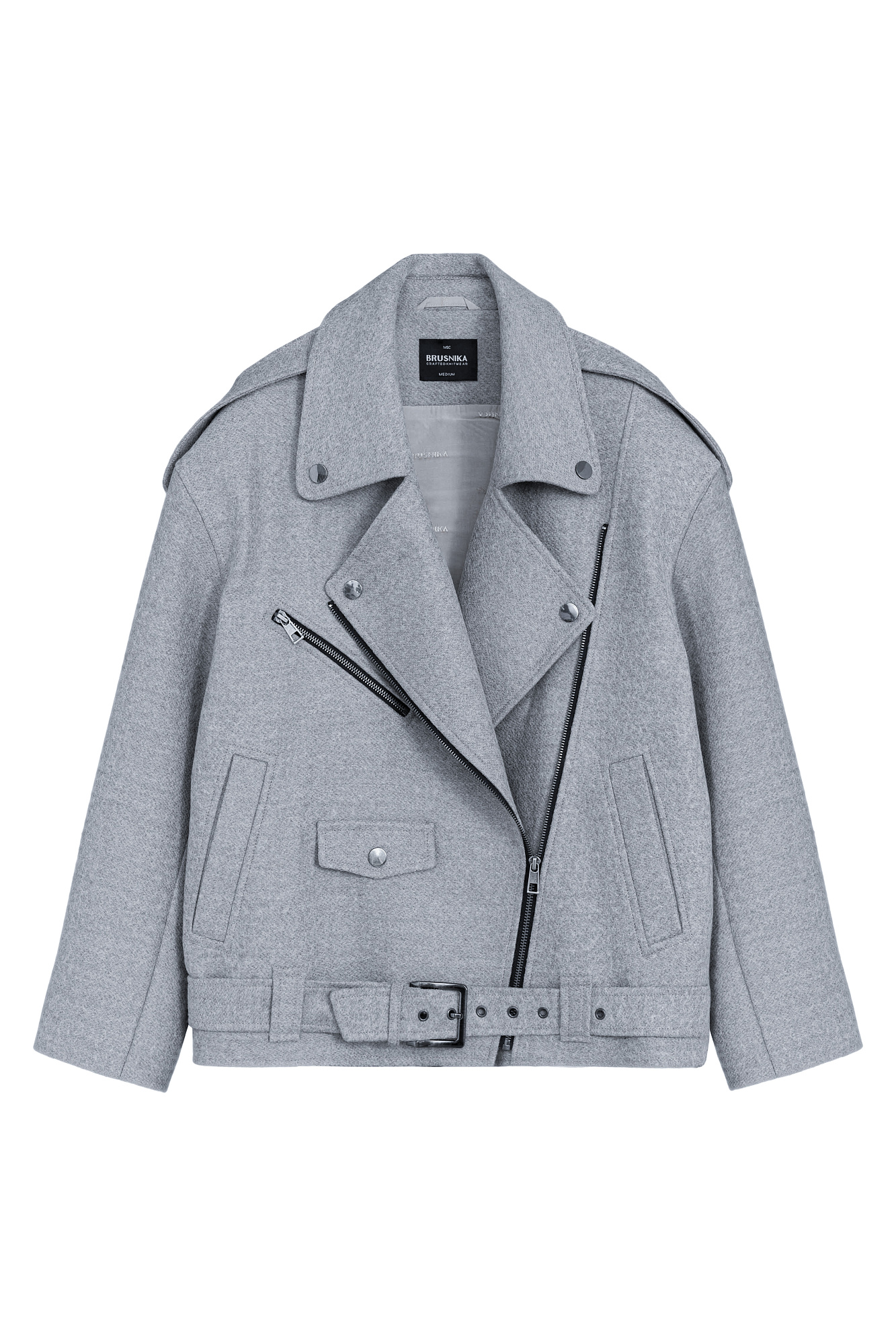 Жакет-косуха из смесовой шерсти. Модель свободного силуэта со спущенной линией плеч и косой застежкой. Изделие декорировано эполетами на плечах, широким поясом с пряжкой на талии, боковыми и нагрудным карманом. Изделие на подкладке.
