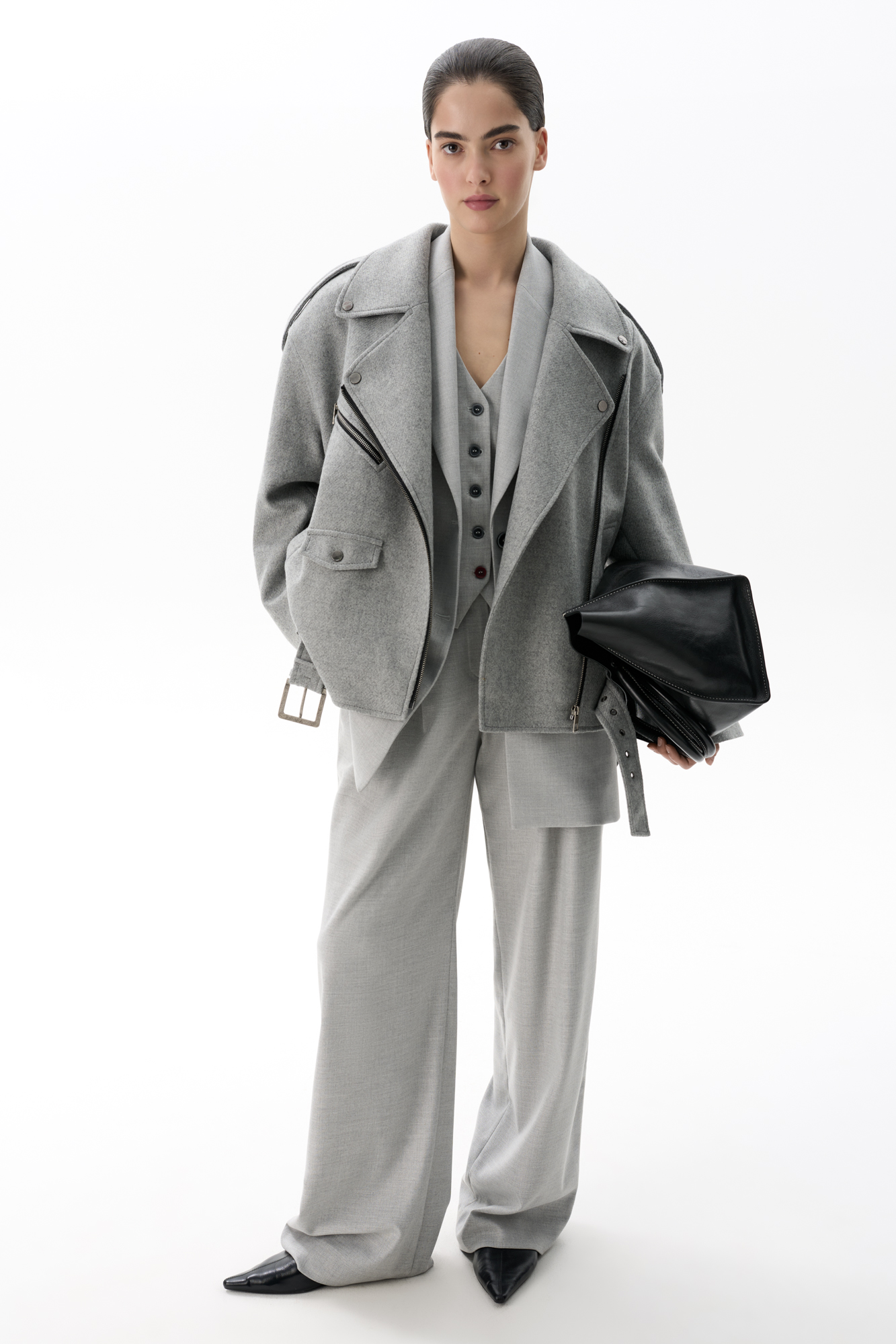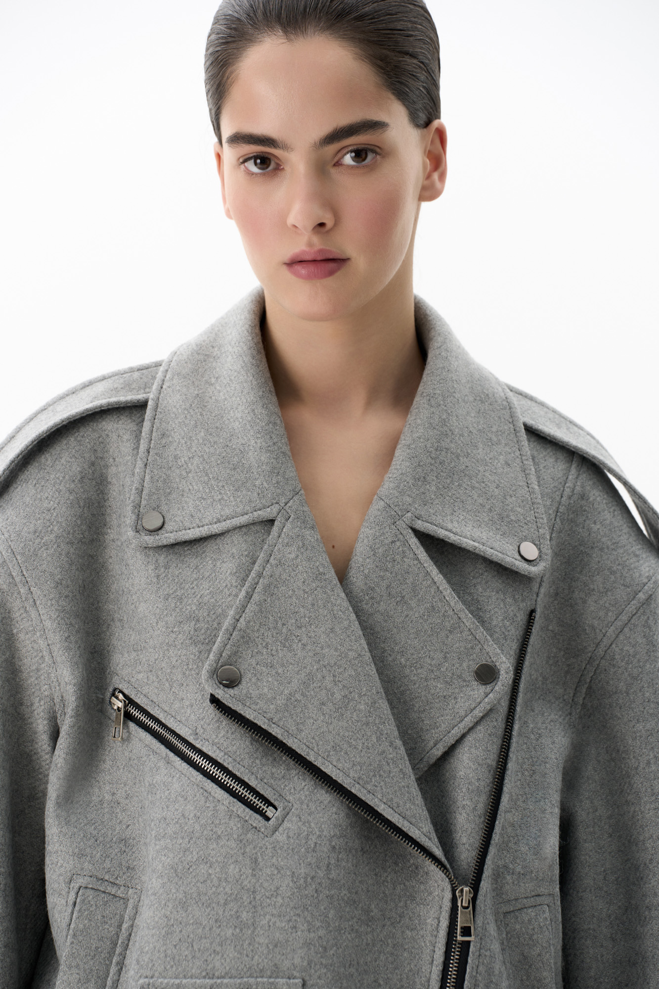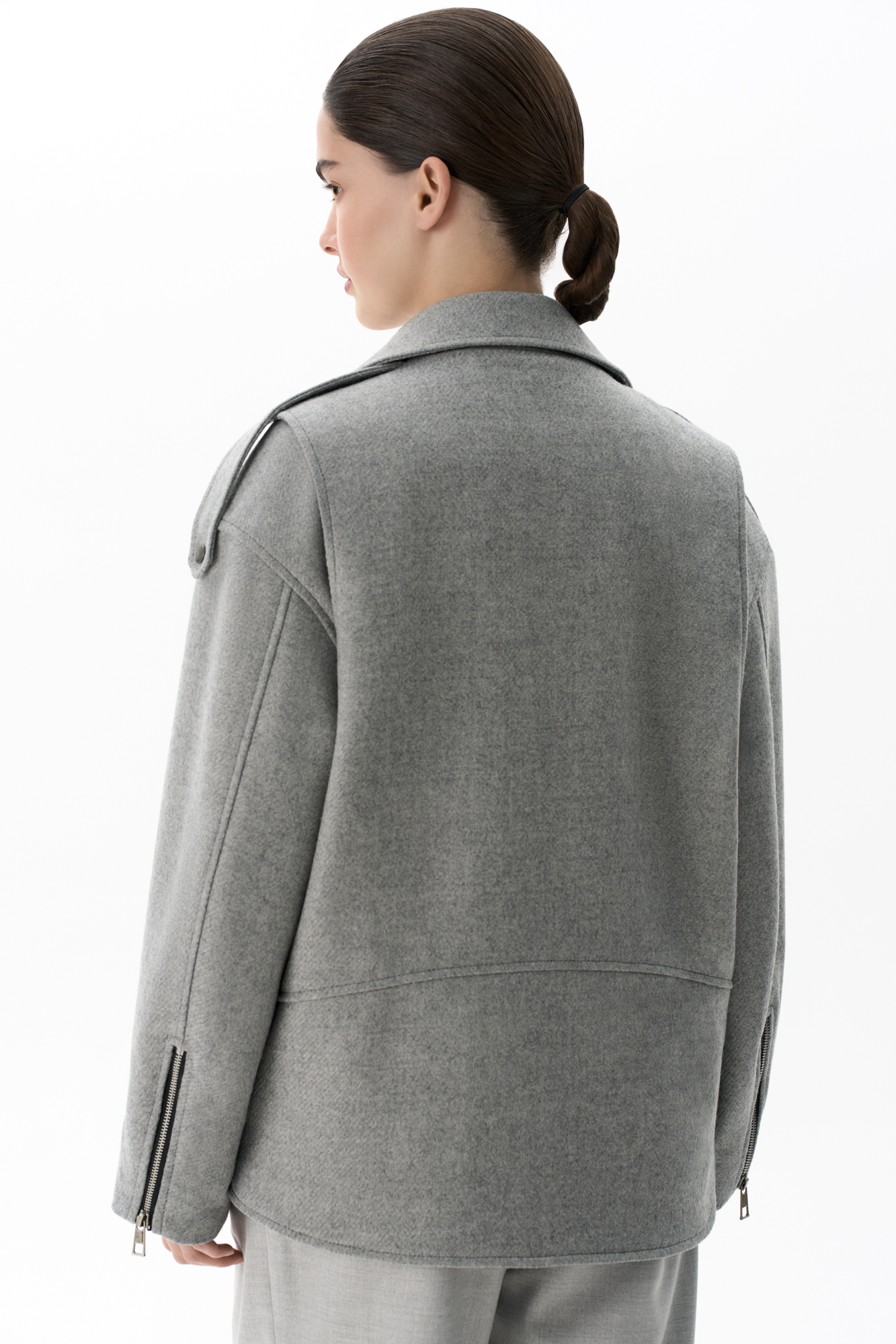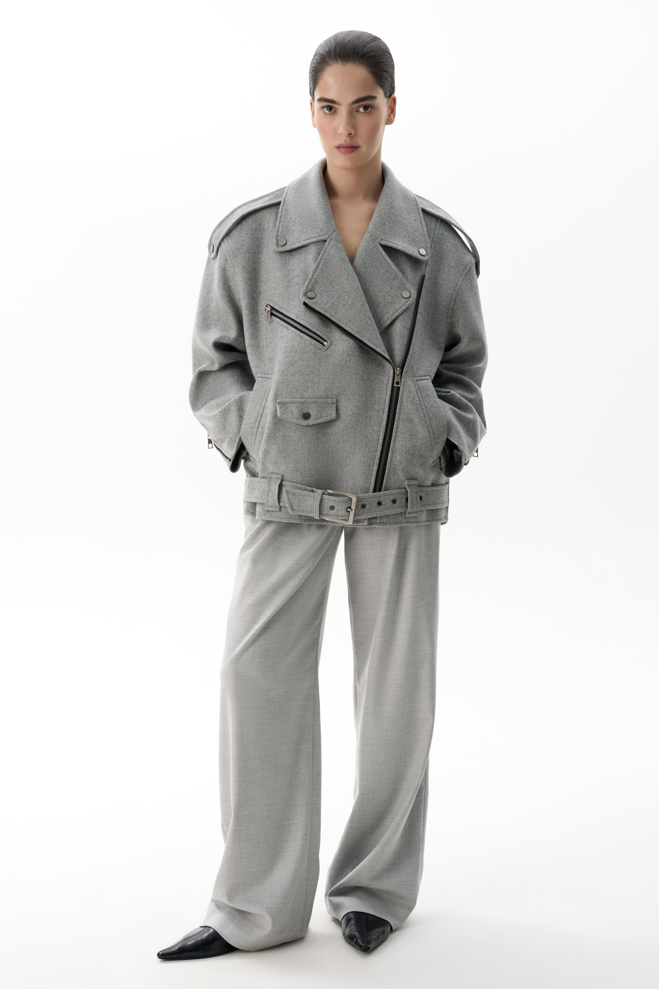 Жакет-косуха из смесовой шерсти. Модель свободного силуэта со спущенной линией плеч и косой застежкой. Изделие декорировано эполетами на плечах, широким поясом с пряжкой на талии, боковыми и нагрудным карманом. Изделие на подкладке.