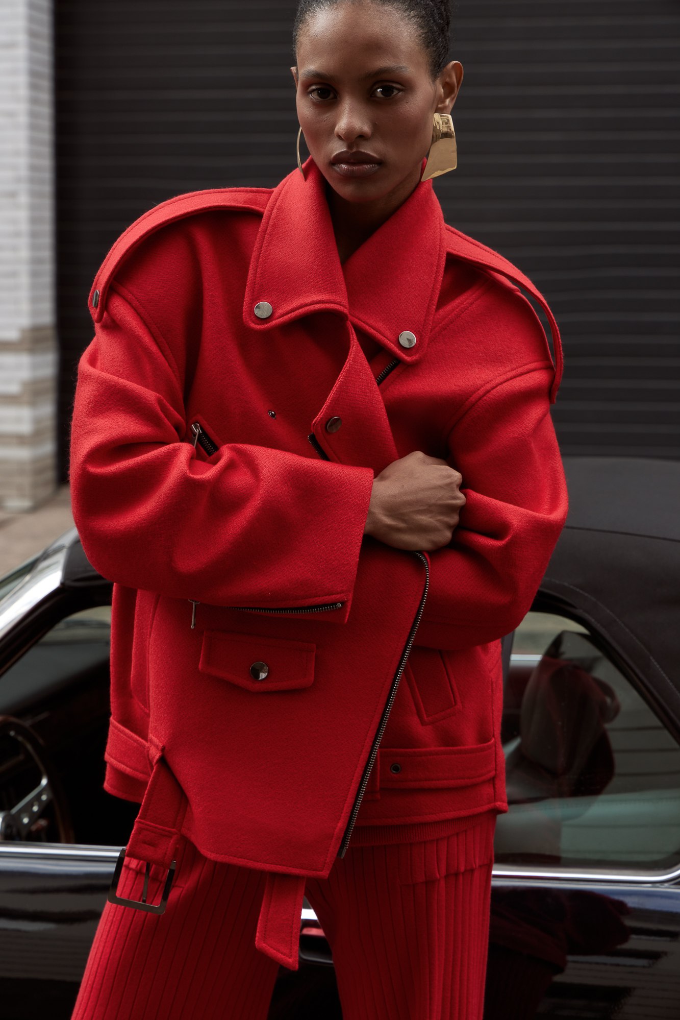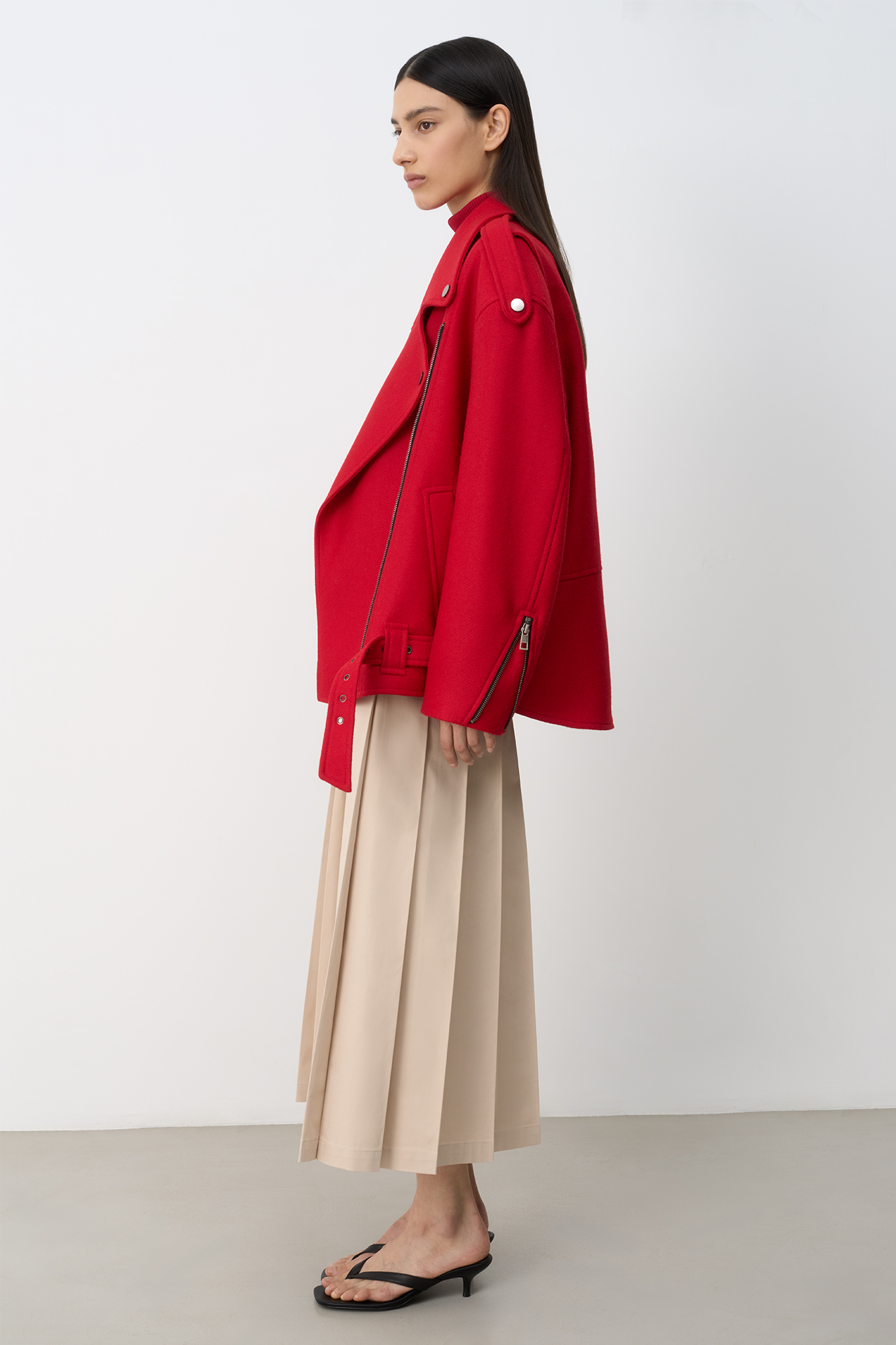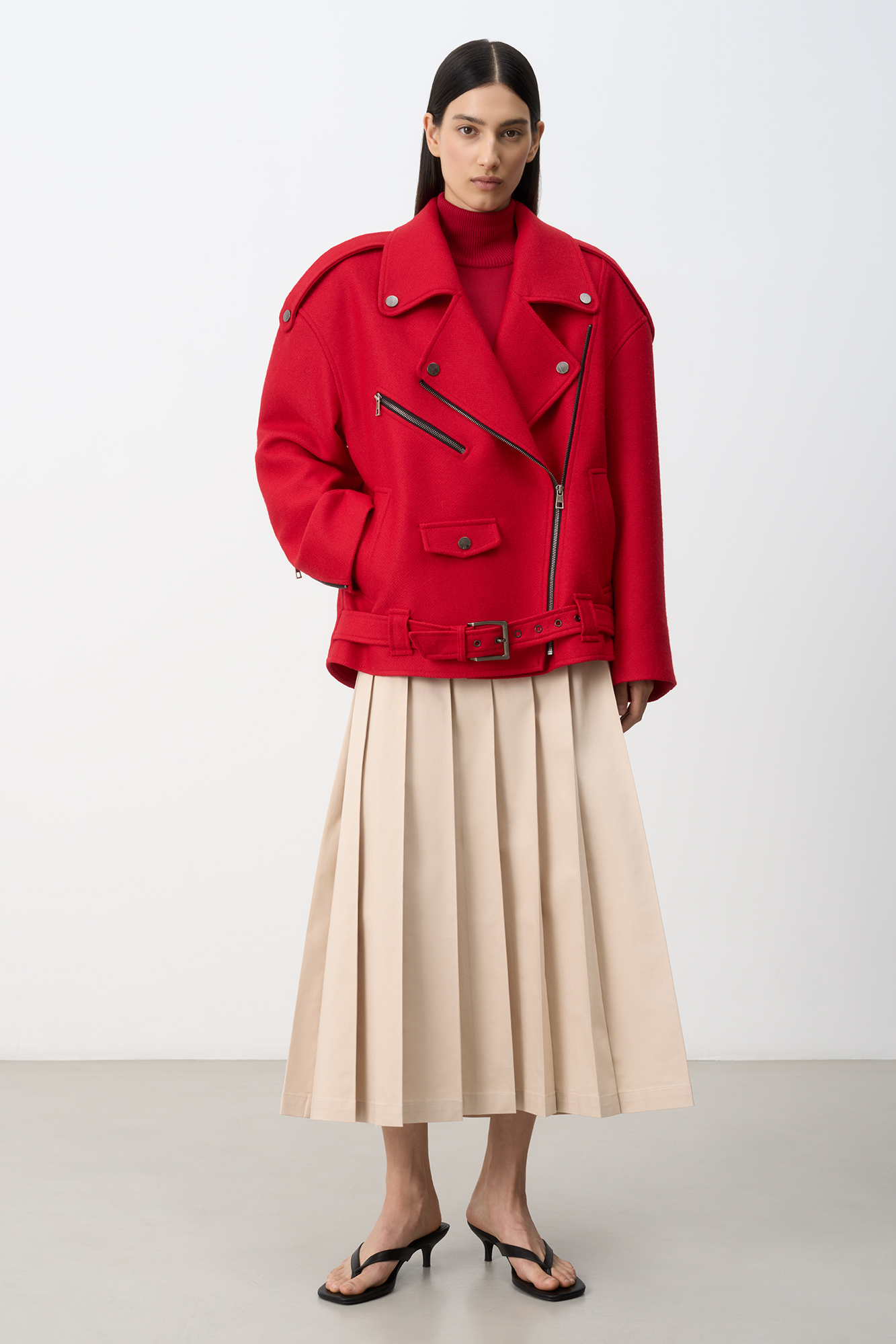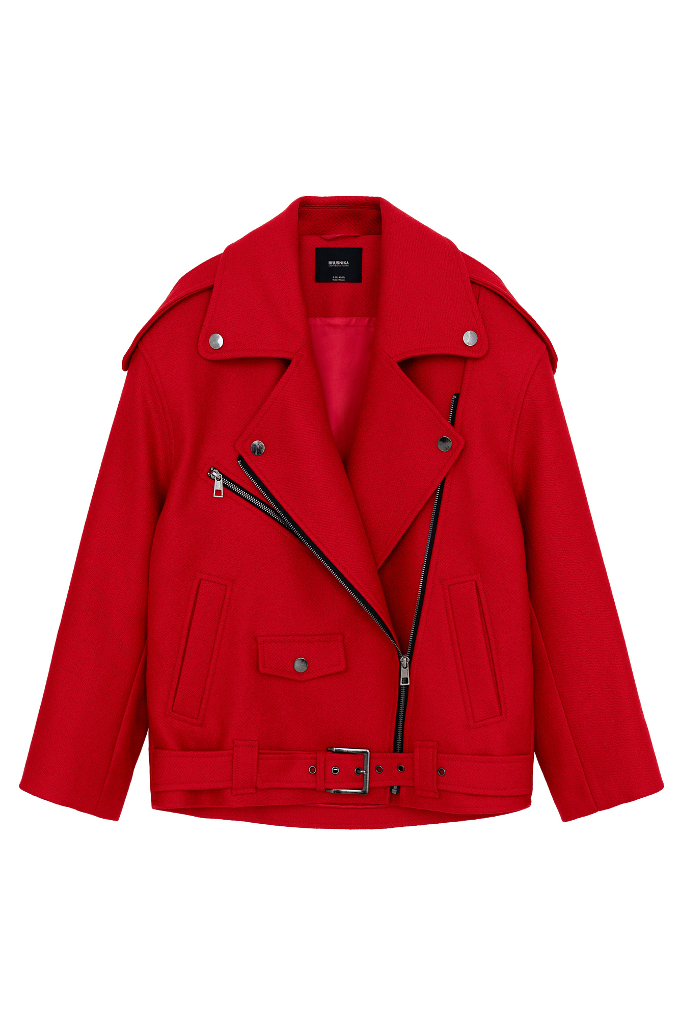 Жакет-косуха из смесовой шерсти. Модель свободного силуэта со спущенной линией плеч и косой застежкой. Изделие декорировано эполетами на плечах, широким поясом с пряжкой на талии, боковыми и нагрудным карманом. Изделие на подкладке.