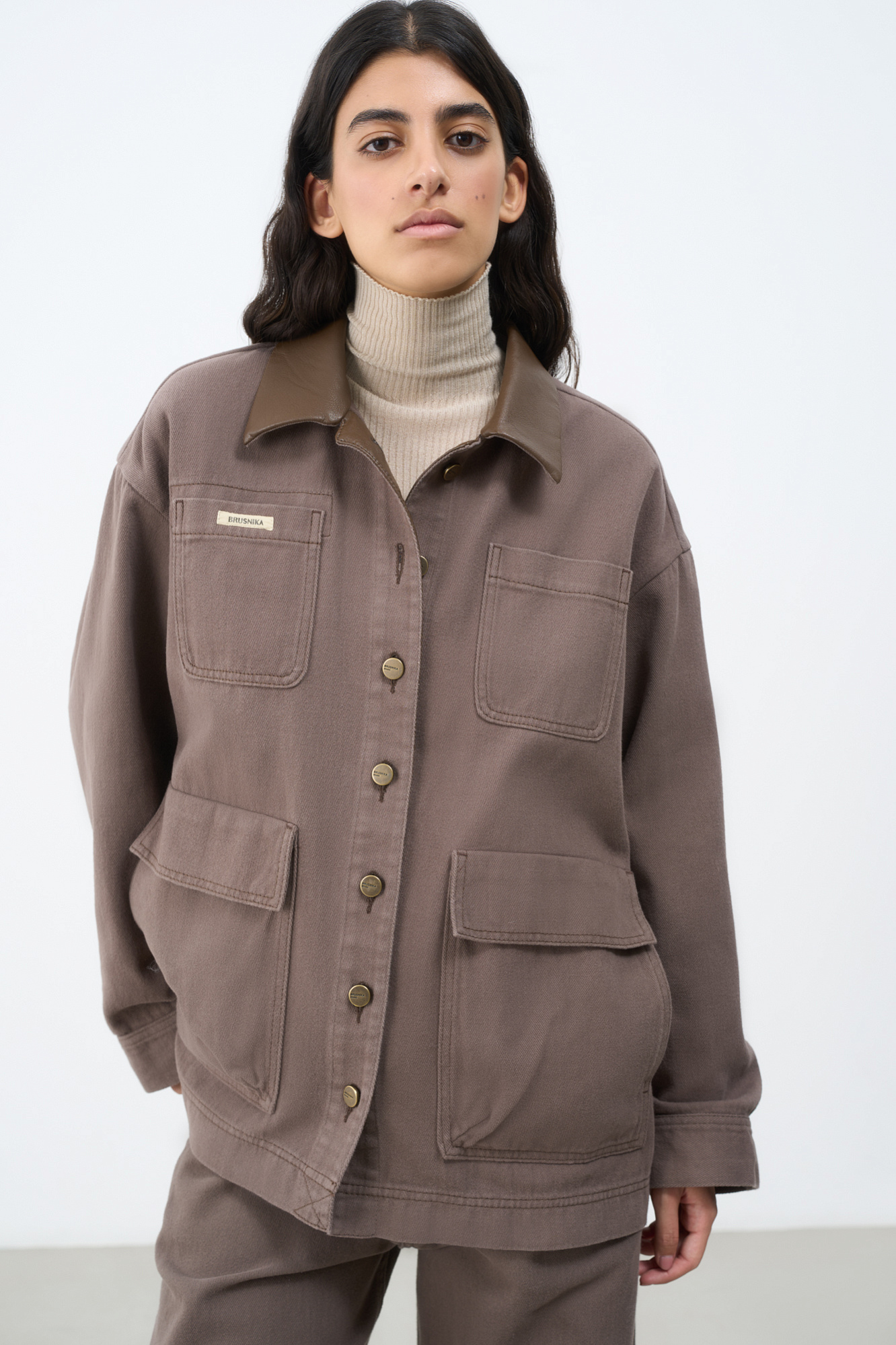 Джинсовая куртка из 100% хлопка. Модель свободного силуэта с накладными карманами. Воротник декорирован вставкой из экокожи. Застежка на металлические пуговицы. Дополнить образ можно джинсами в таком же стиле.