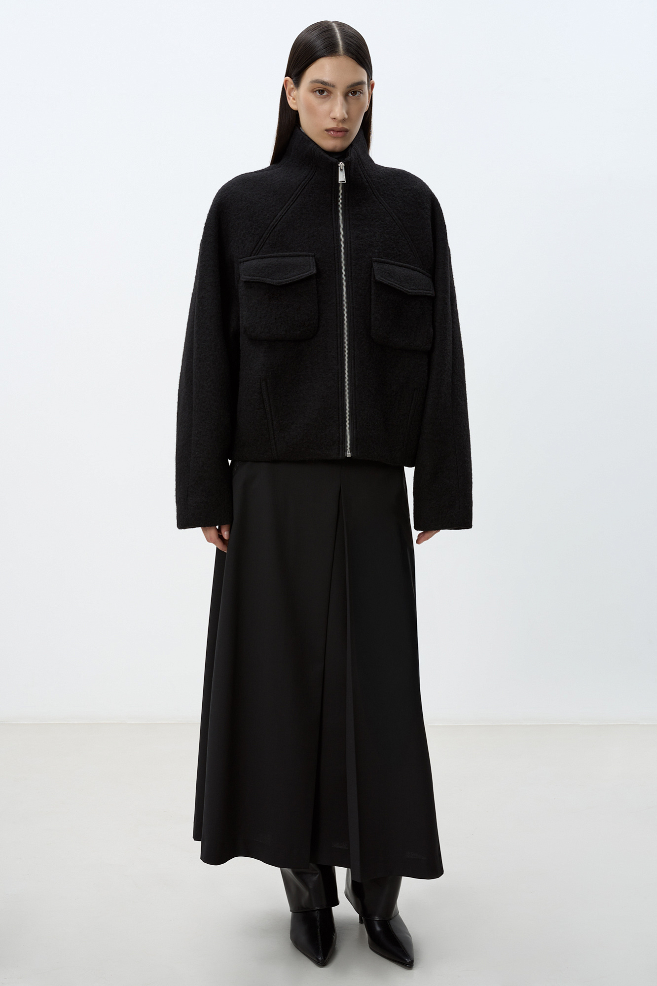 Шерстяная куртка на подкладке. Модель свободного силуэта со спущенной линией плеча, накладными карманами на груди и воротником-стойкой. Застежка на молнию.