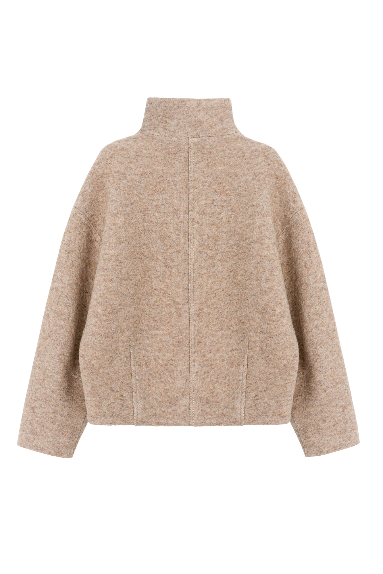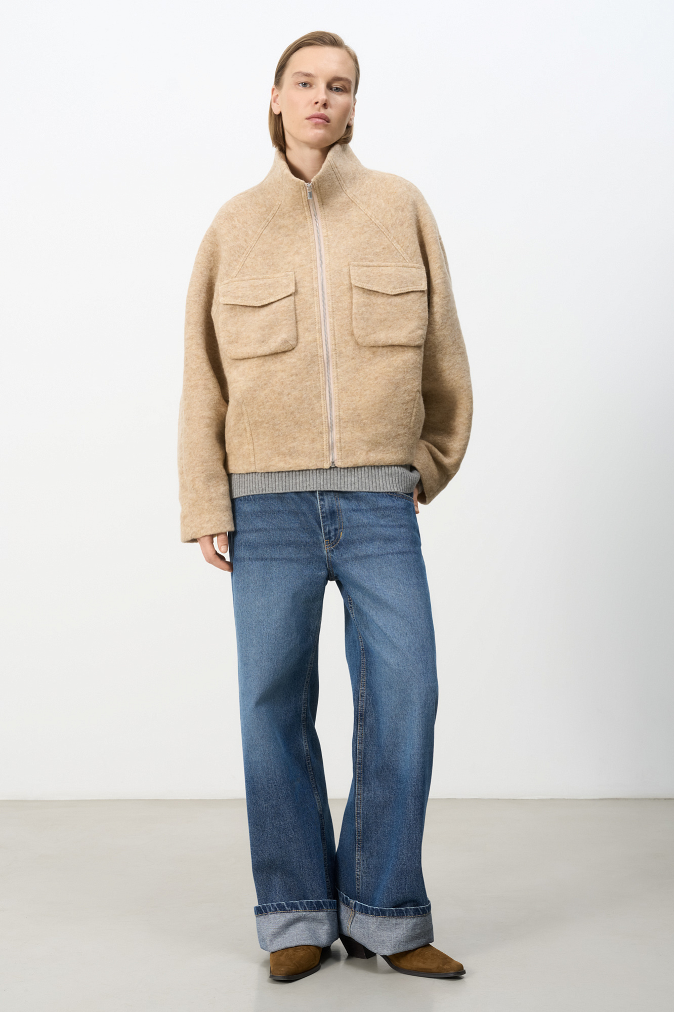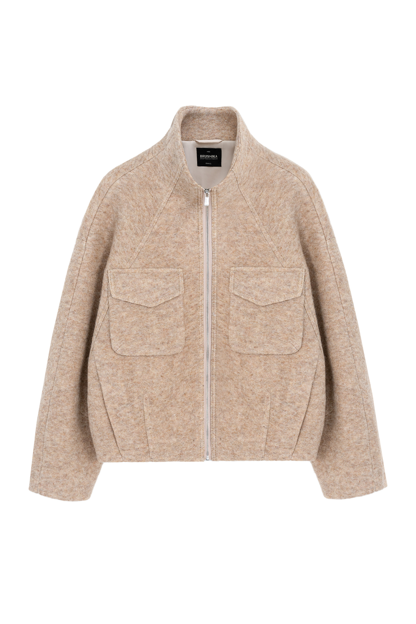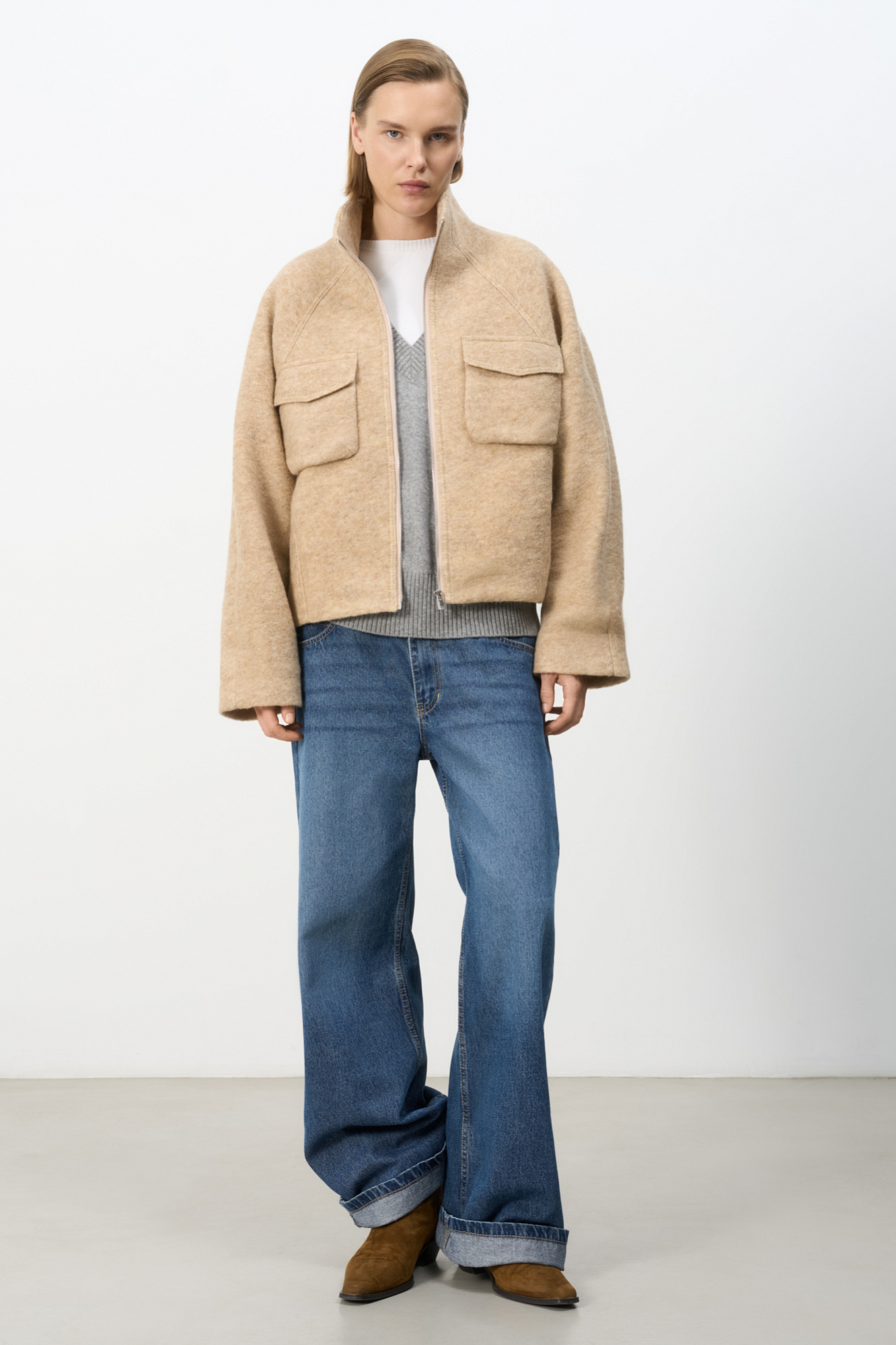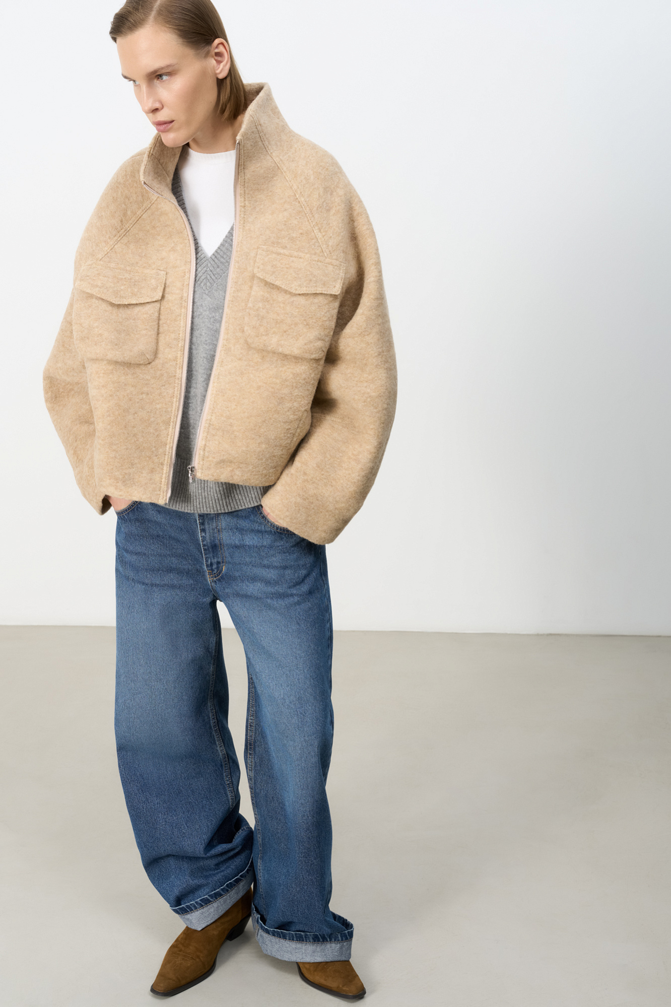 Шерстяная куртка на подкладке. Модель свободного силуэта со спущенной линией плеча, накладными карманами на груди и воротником-стойкой. Застежка на молнию.