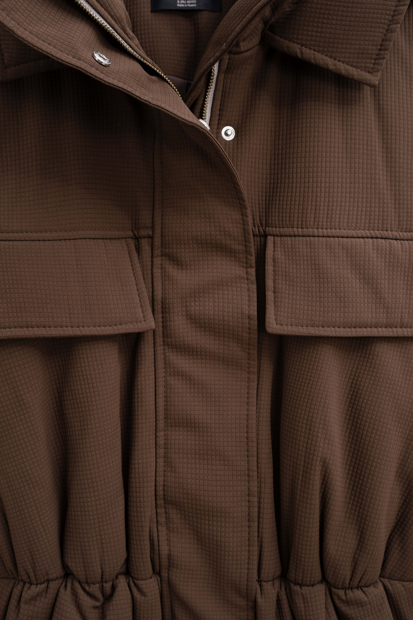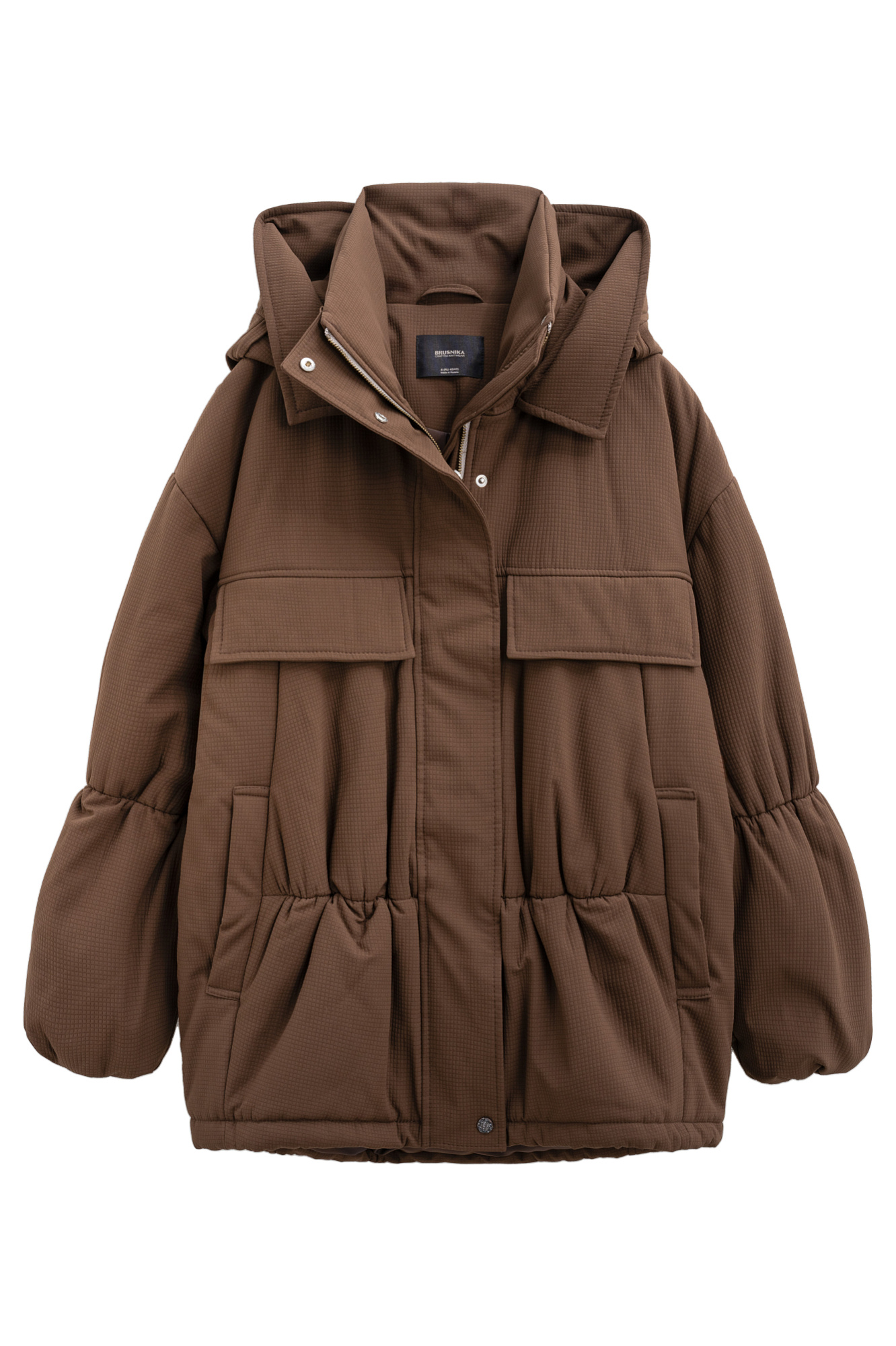 Длинная куртка на синтепоне из текстурной ткани. Модель свободного силуэта со спущенной линией плеча, накладными и боковыми карманами, воротником-стойкой и капюшоном. Изделие на подкладке. Застежка на молнию под планкой с кнопками.