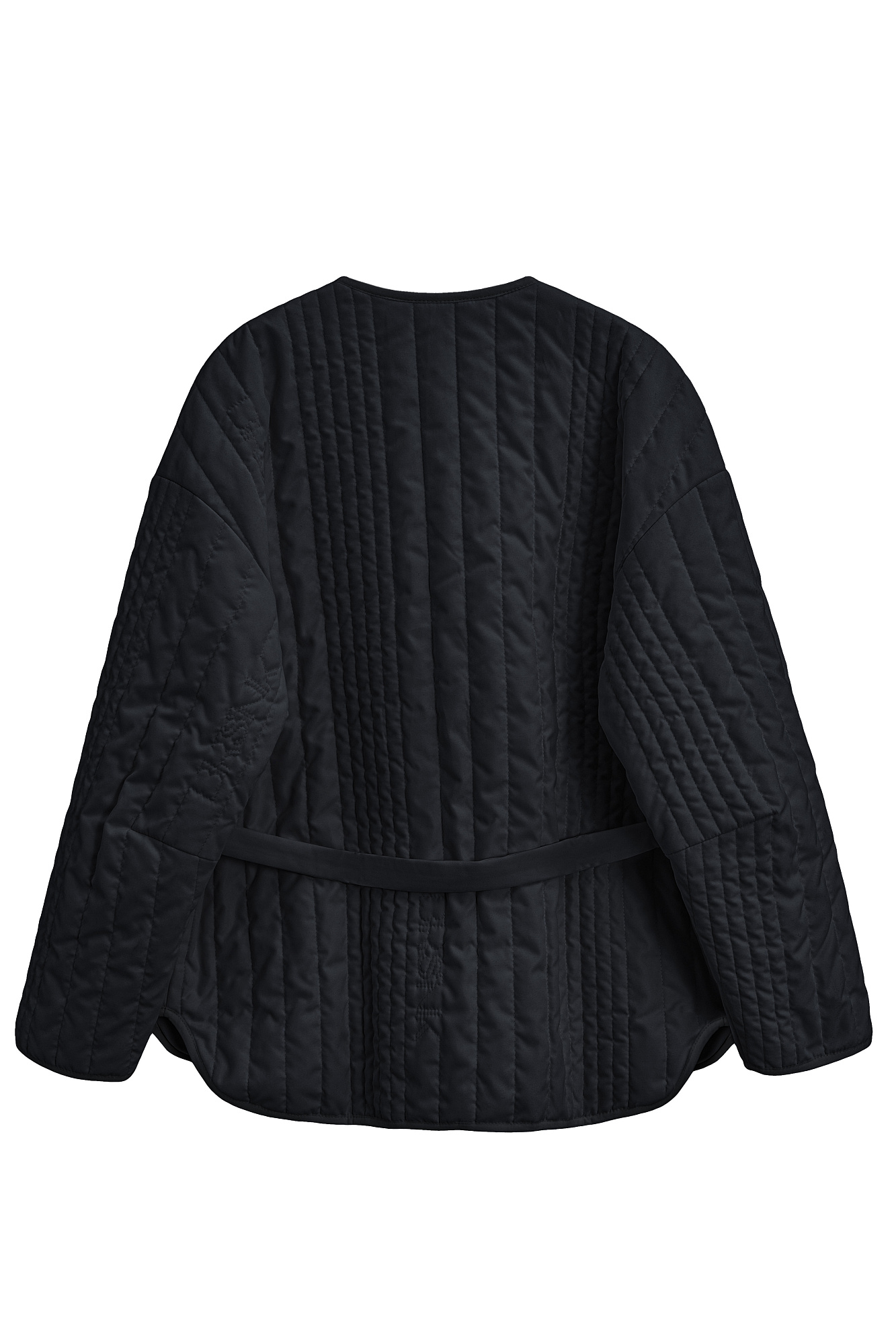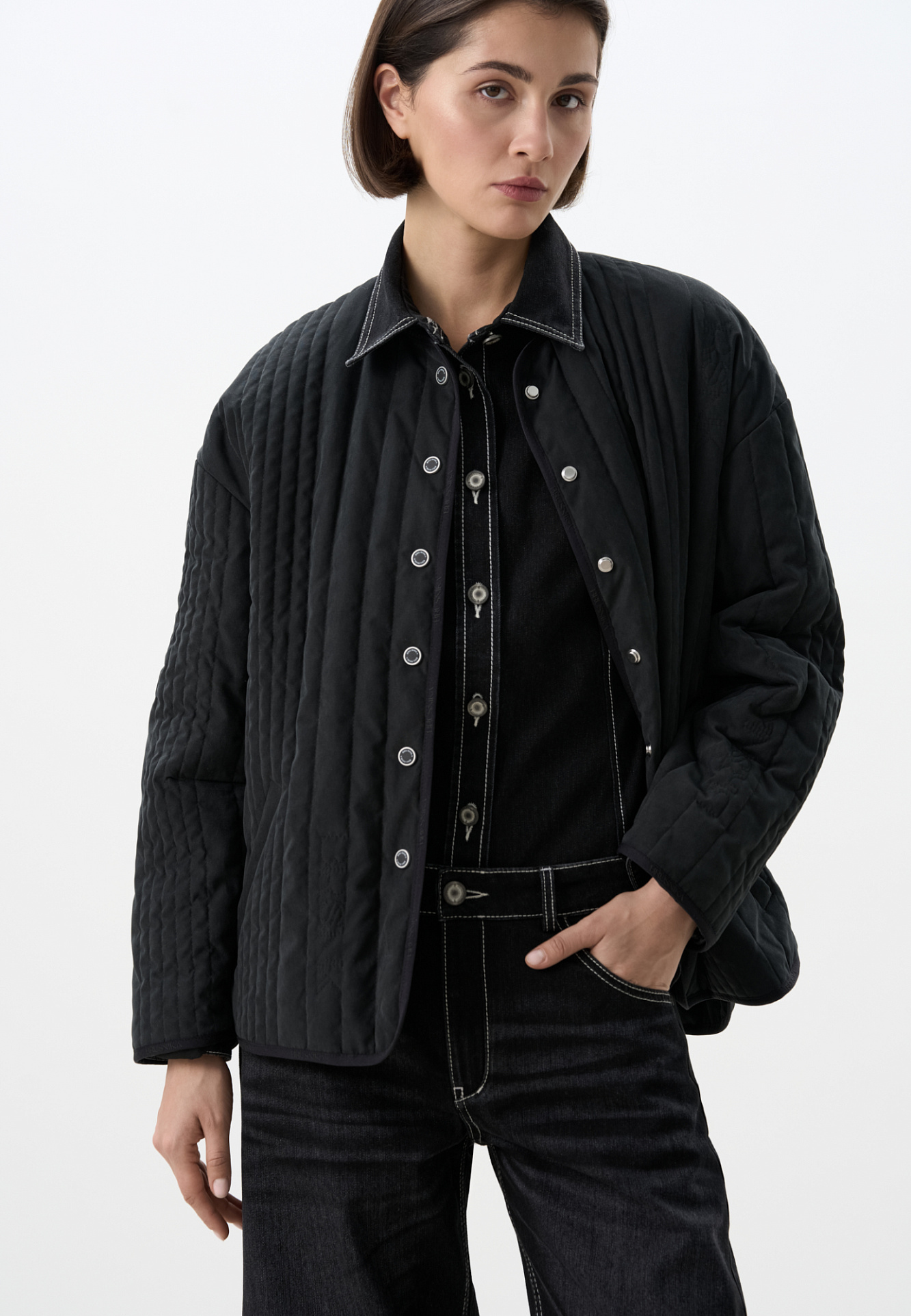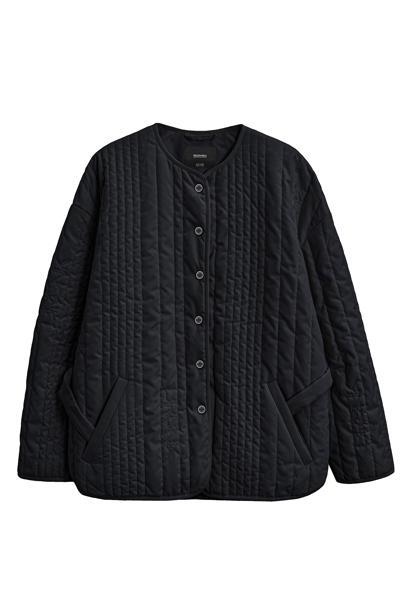 Стеганая куртка на синтепоне из нейлона. Модель с круглым вырезом горловины, спущенной линией плеч и карманами. Застежка на кнопки.
