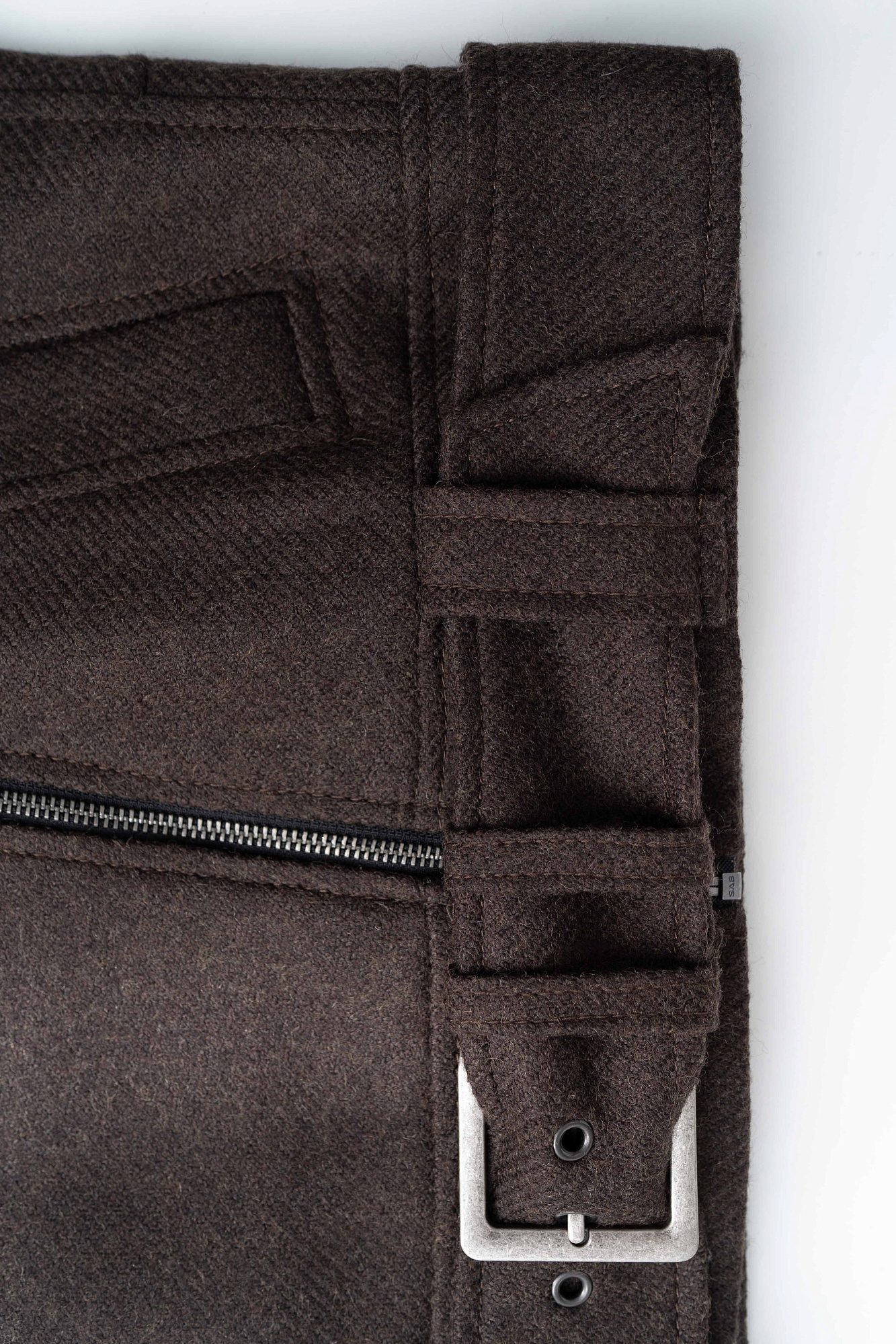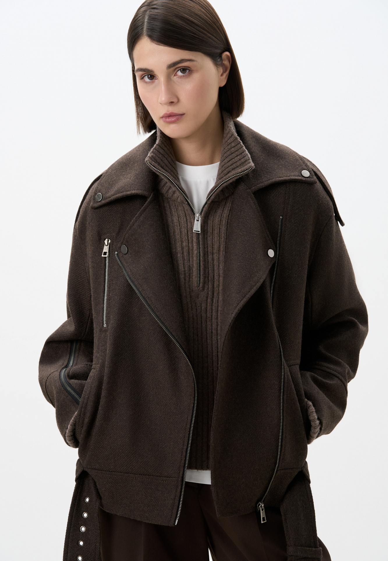 Жакет-косуха из шерсти. Модель свободного силуэта со спущенной линией плеч и косой застежкой. Изделие декорировано эполетами на плечах, широким поясом с пряжкой на талии, боковыми и нагрудным карманом. Изделие на подкладке.