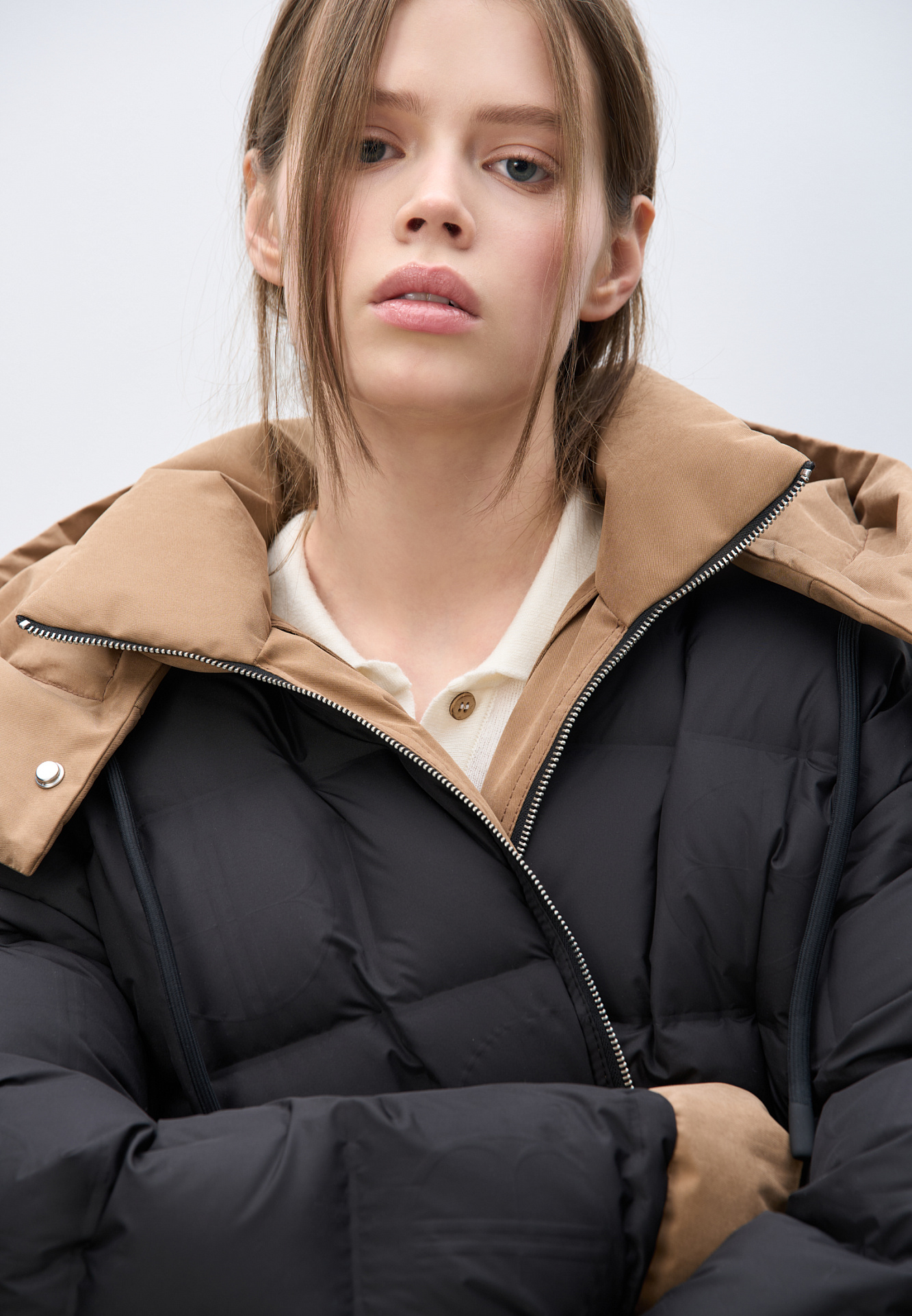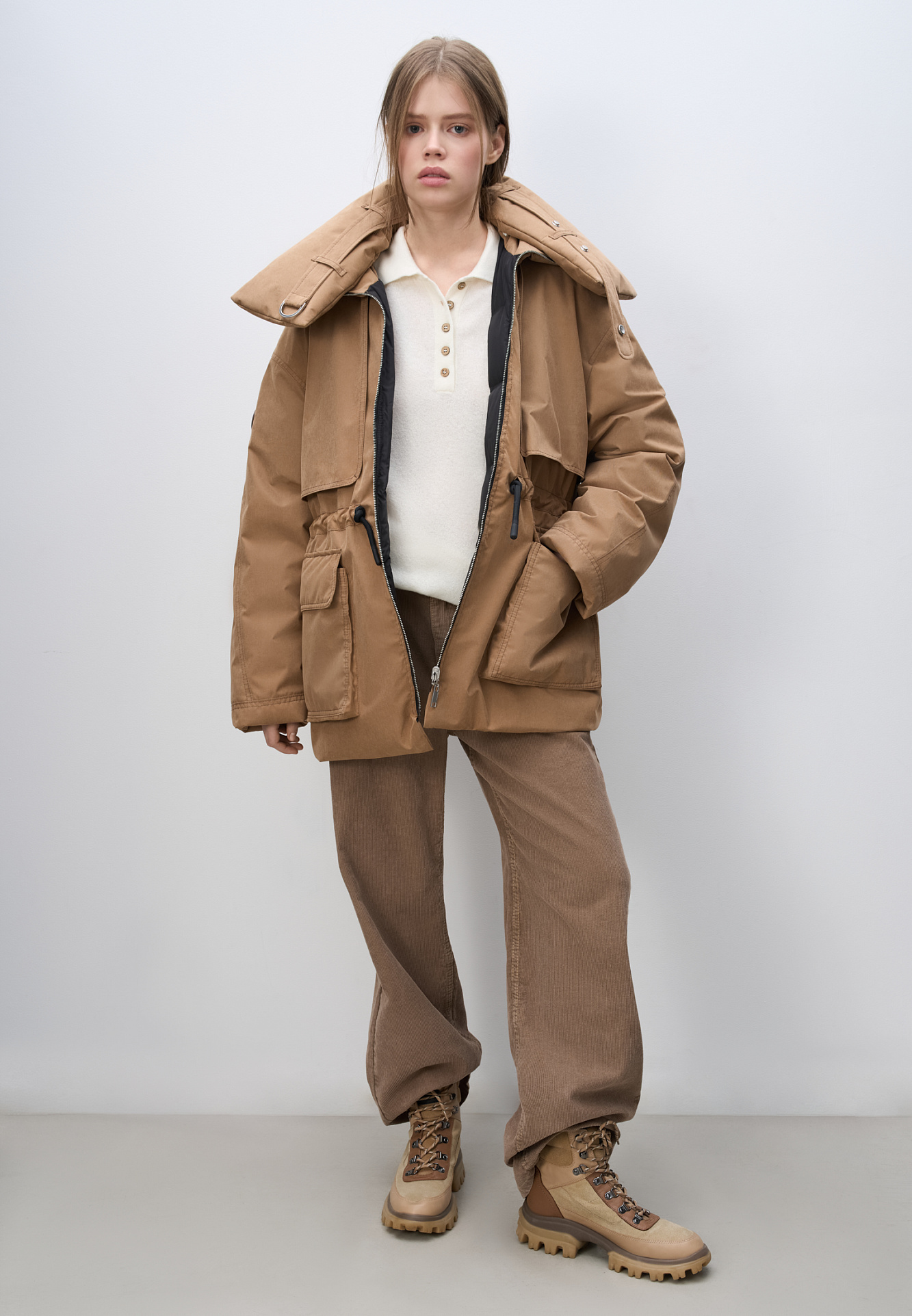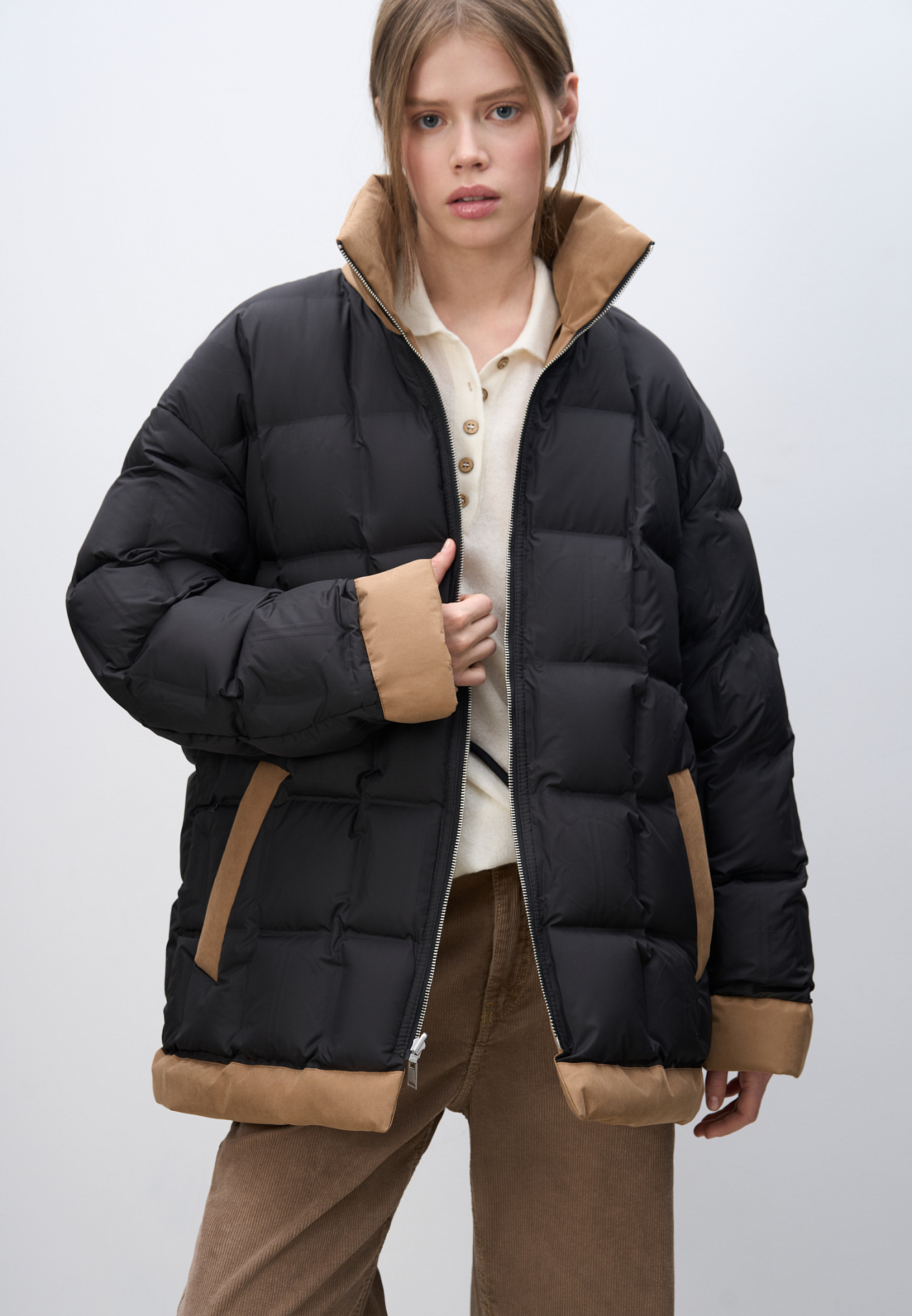 Двусторонний пуховик. Модель свободного силуэта с регулируемой кулиской на талии, большими накладными карманами с клапанами и воротником-стойкой. В комплекте к куртке идет дополнительный объемный воротник и капюшон. Застежка на молнию.
