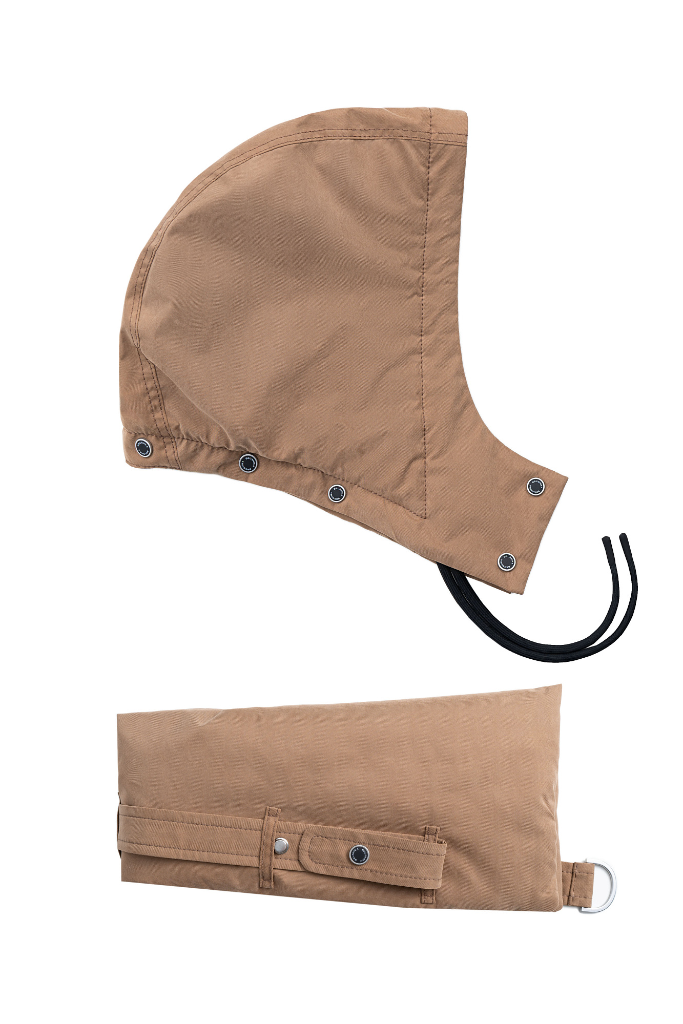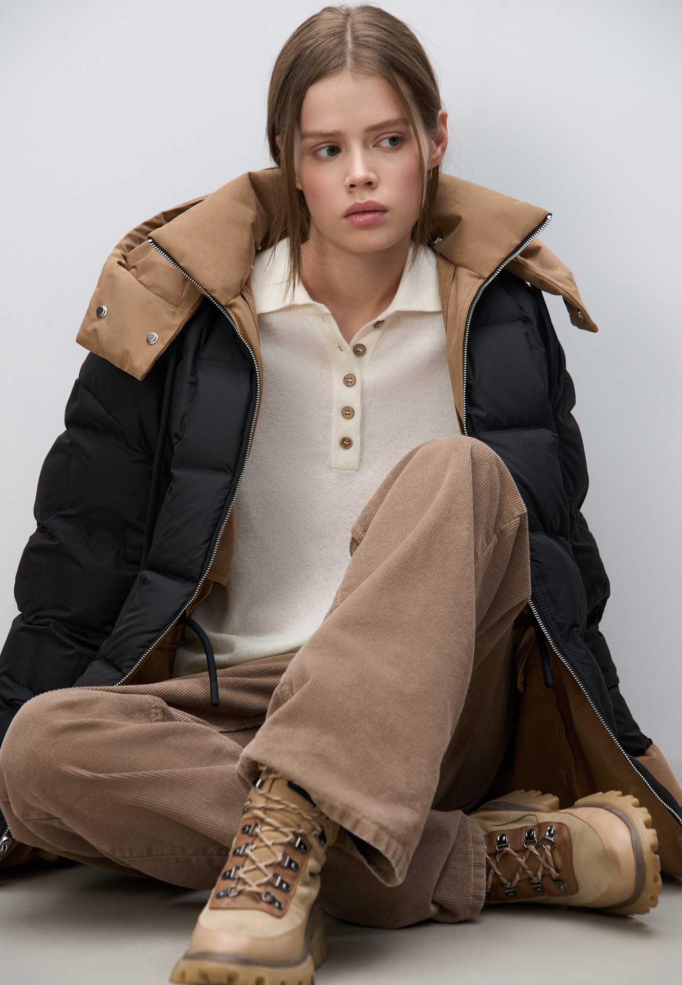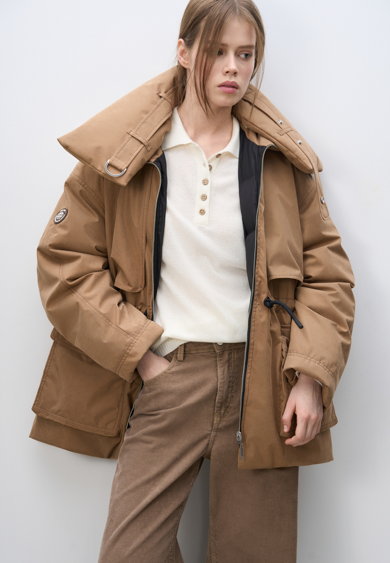 Двусторонний пуховик. Модель свободного силуэта с регулируемой кулиской на талии, большими накладными карманами с клапанами и воротником-стойкой. В комплекте к куртке идет дополнительный объемный воротник и капюшон. Застежка на молнию.