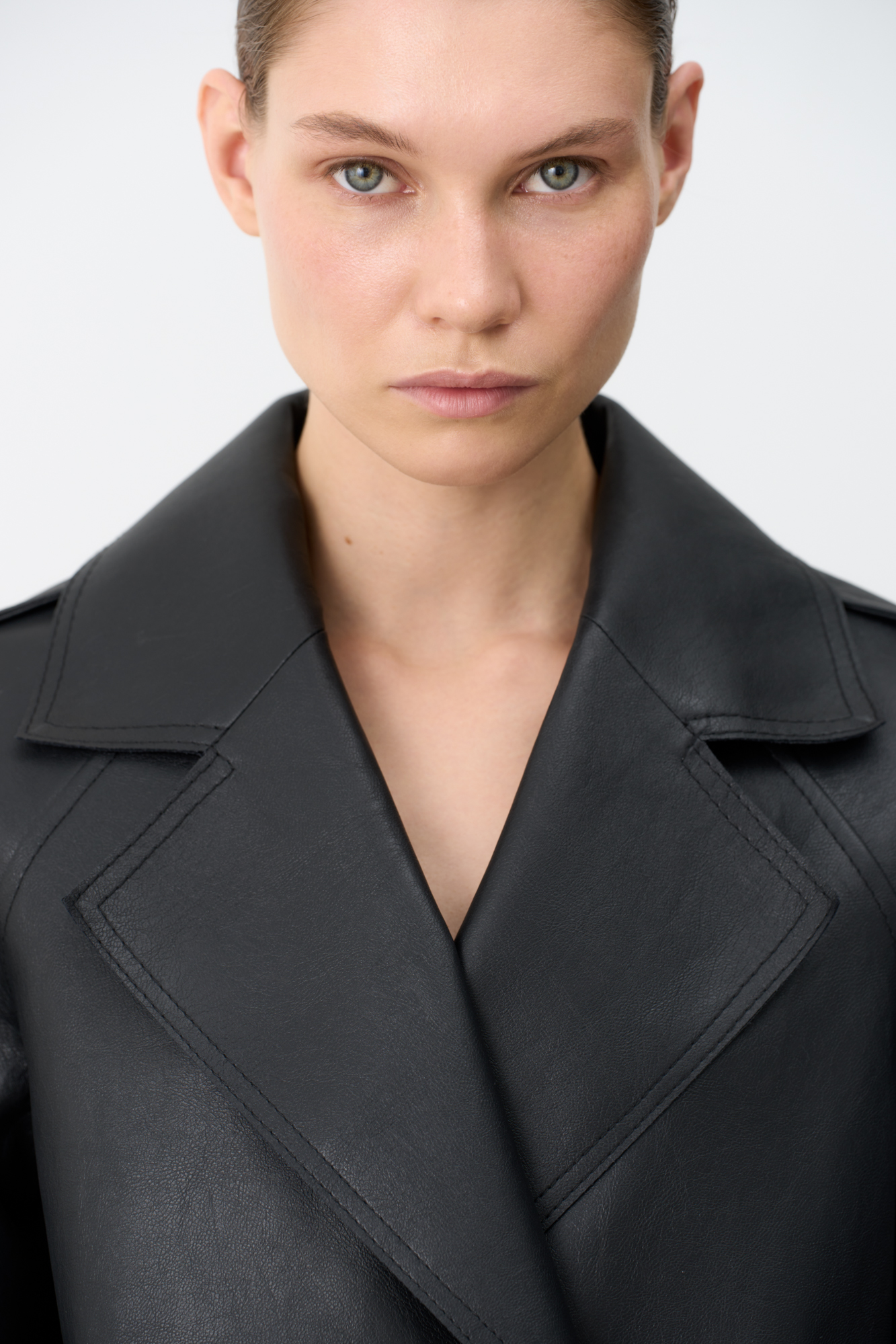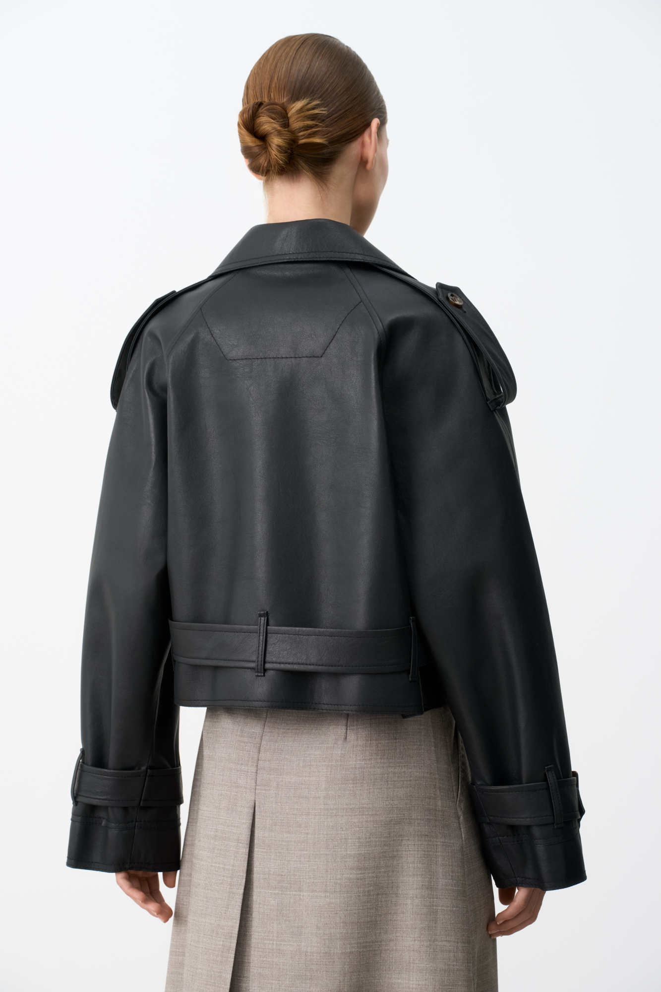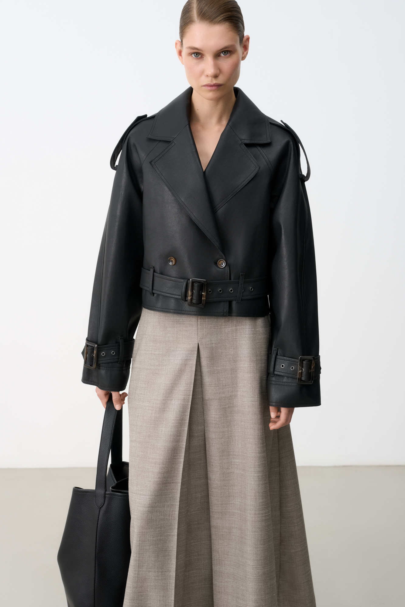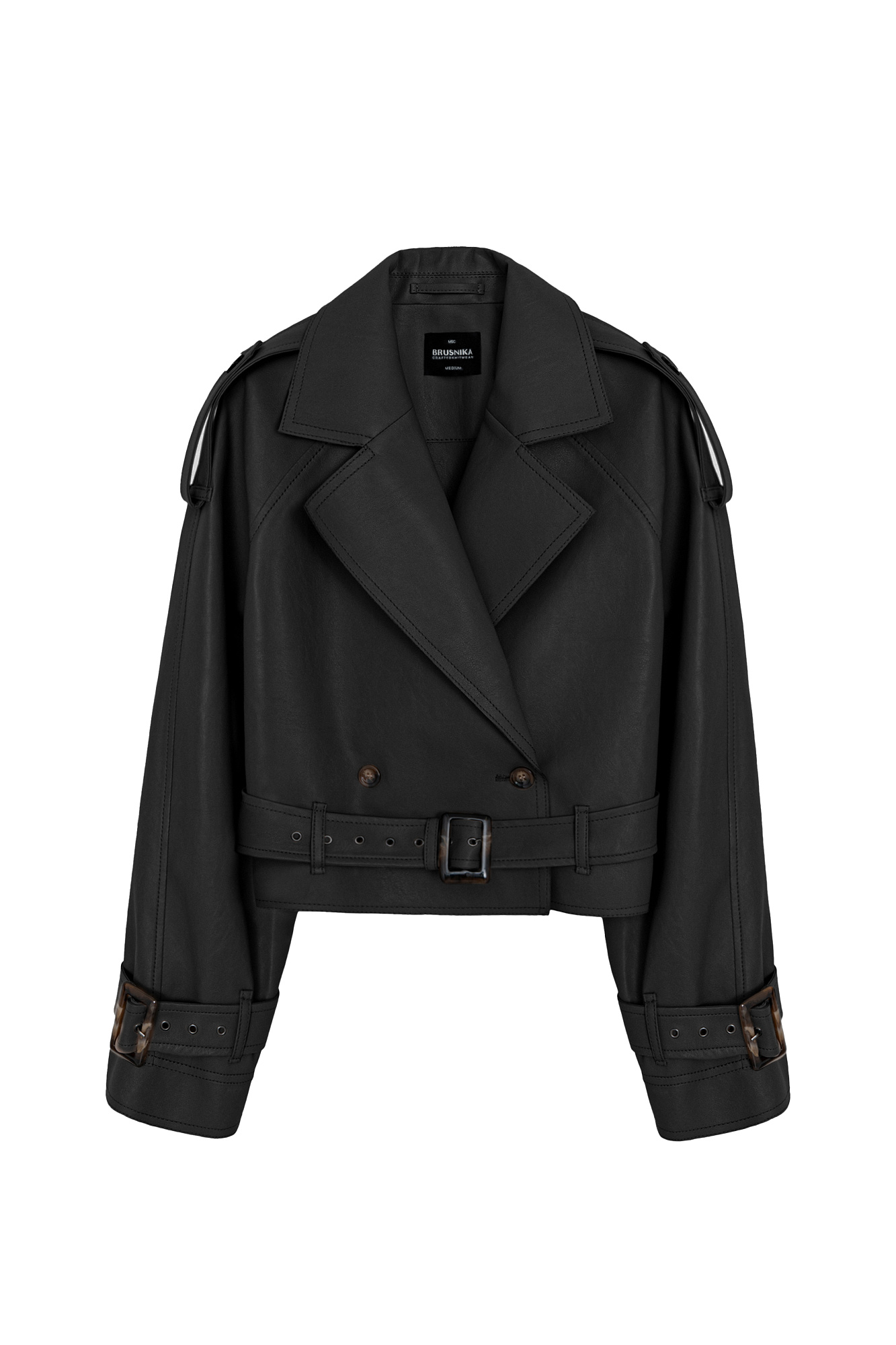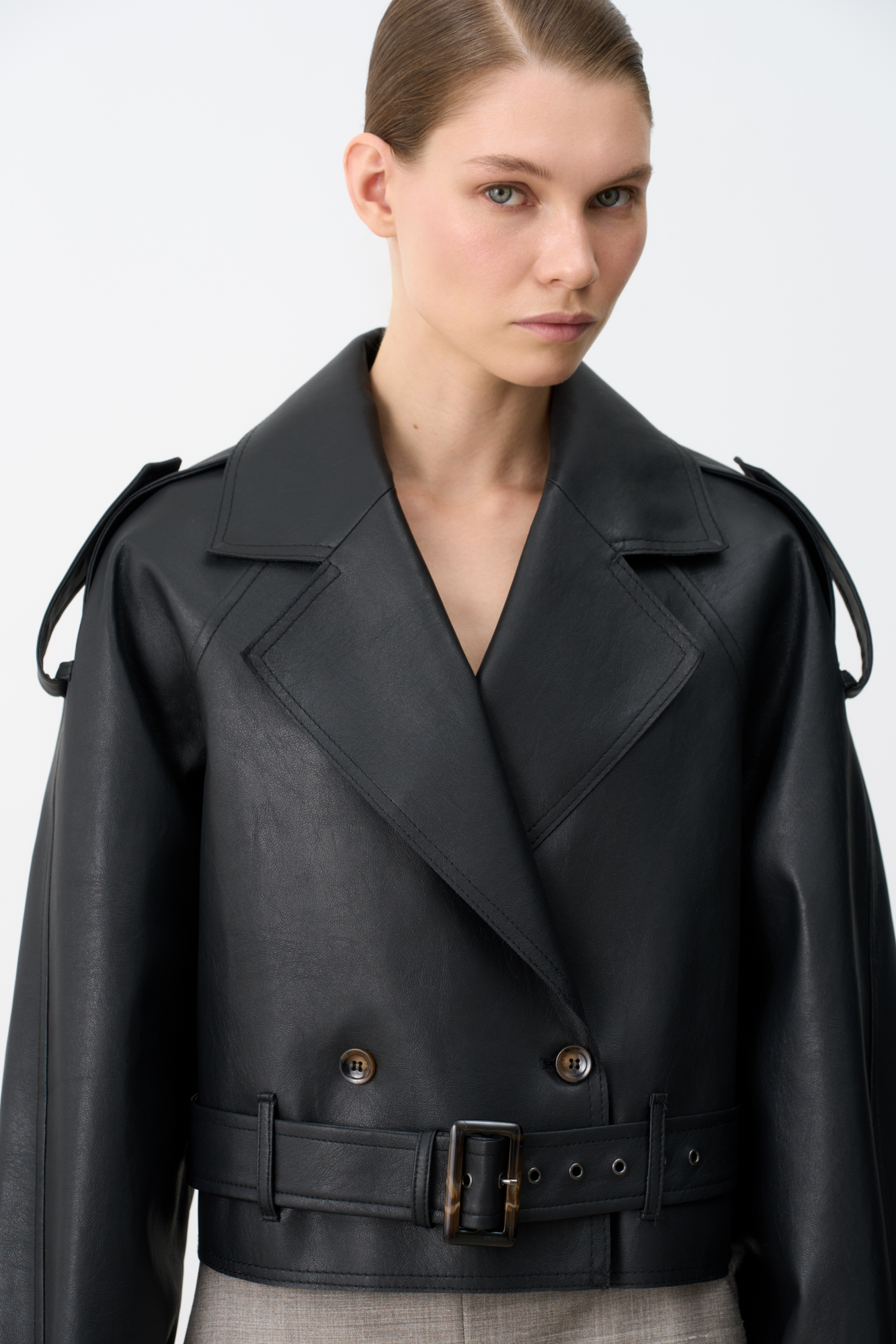 Двубортный жакет-косуха из двусторонней экокожи. Модель свободного силуэта со спущенным плечом и широкими лацканами. Изделие декорировано патами на плечах и ремнями с крупными пряжками на поясе и рукавах.