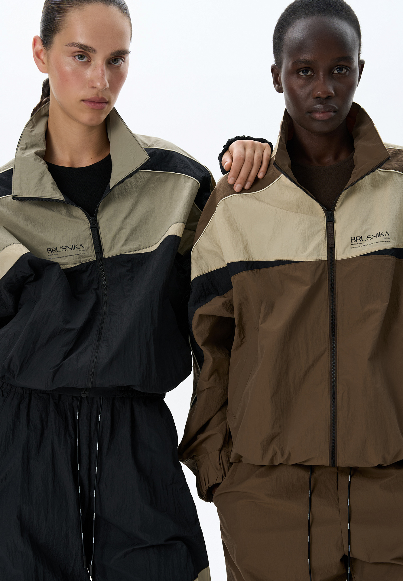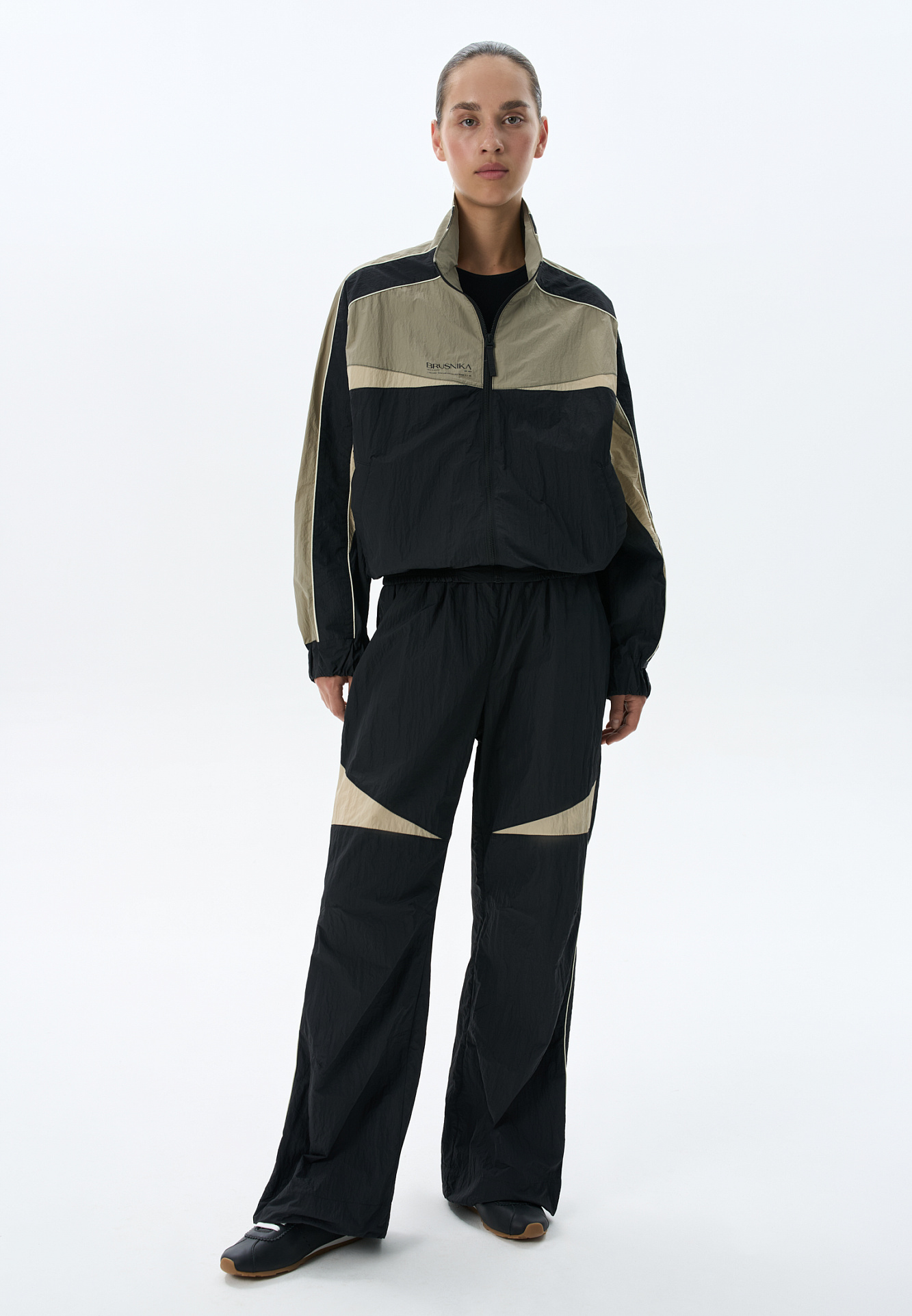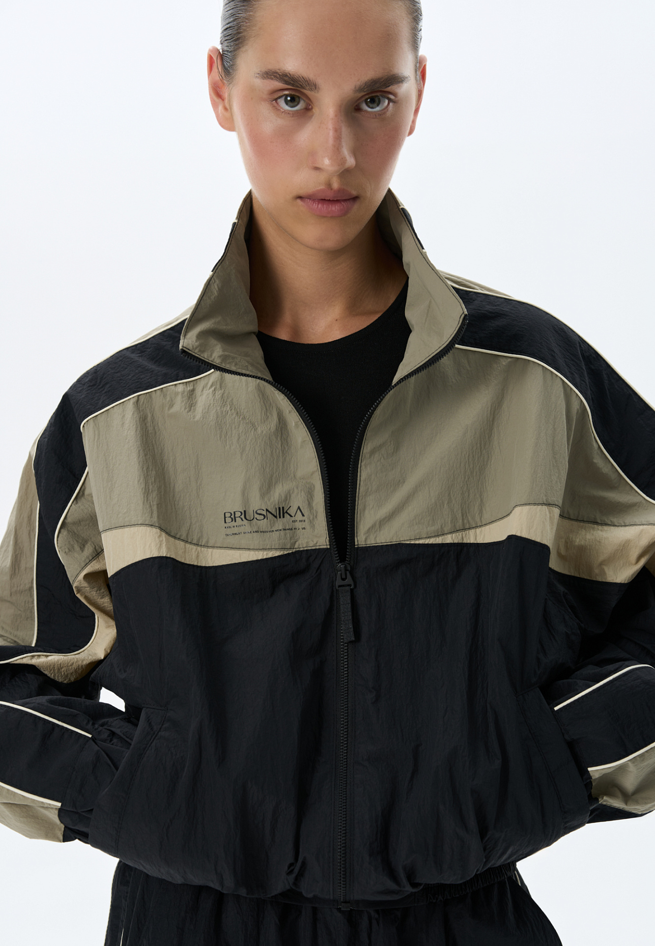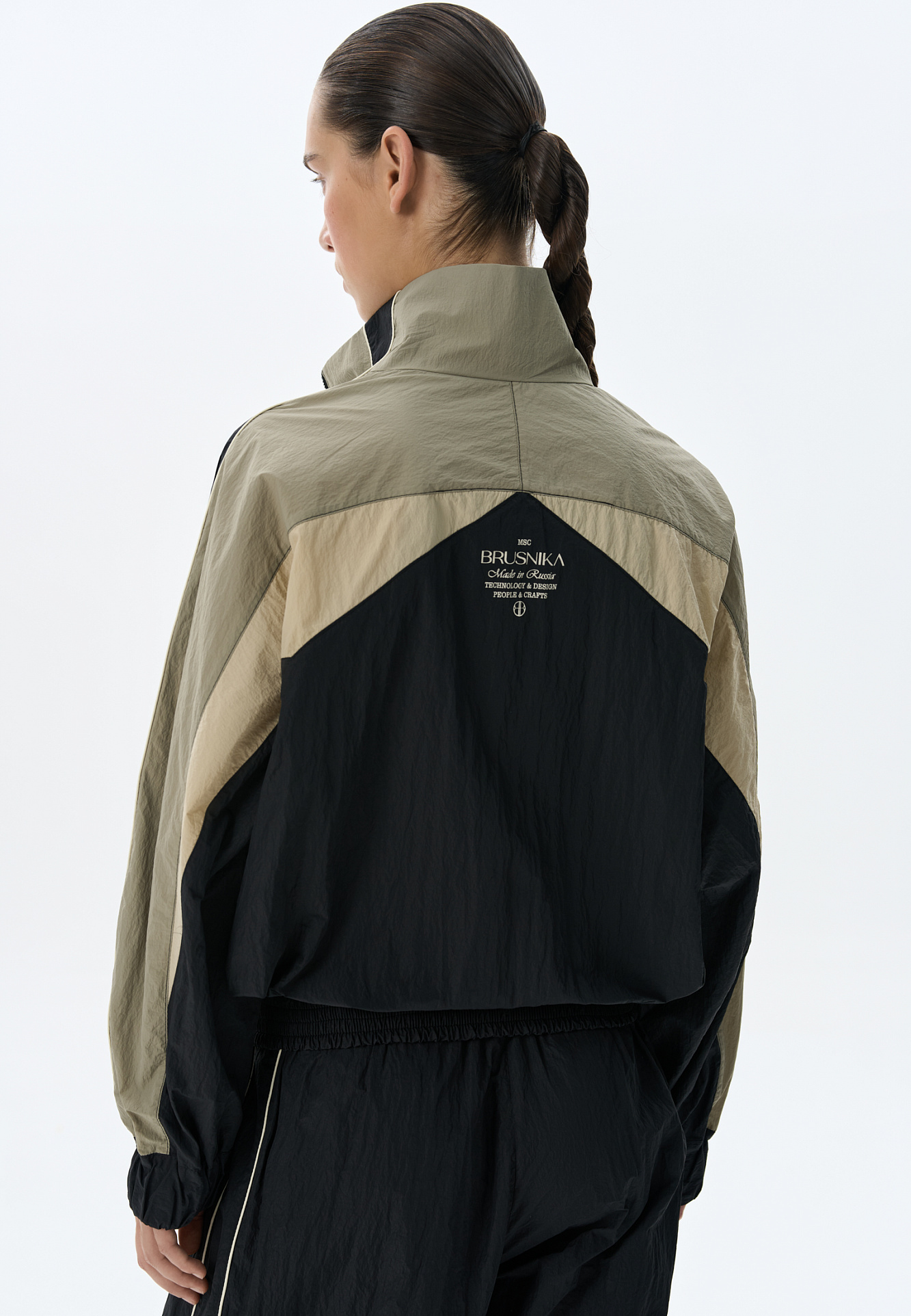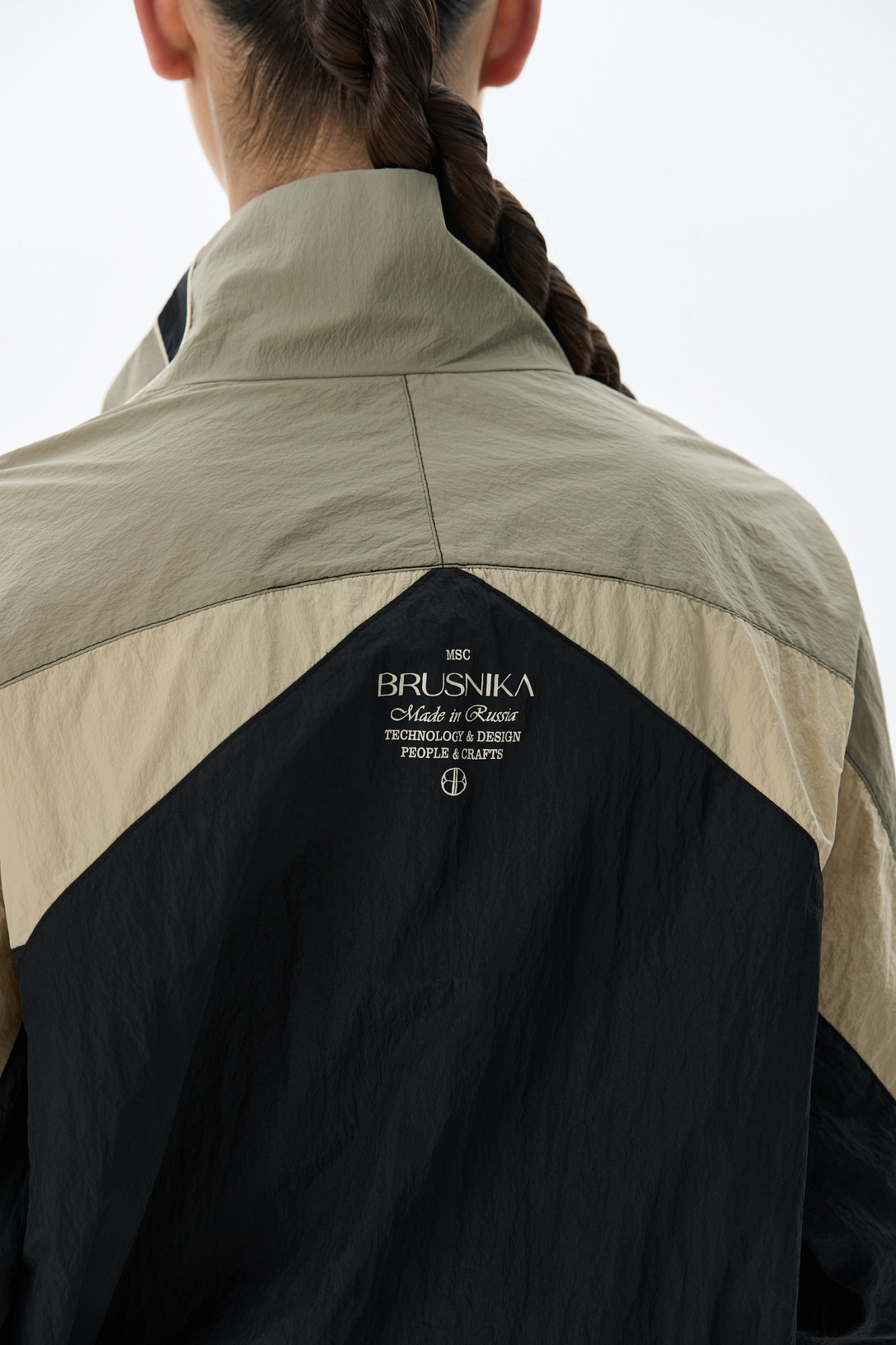 Олимпийка-колорблок из нейлона. Модель свободного кроя, с воротником-стойкой и боковыми карманами. Манжеты рукавов и низ изделия выполнен на резинке. Застежка на молнию. Логотип бренда на спине и груди. Дополнить образ можно брюками в таком же стиле.
