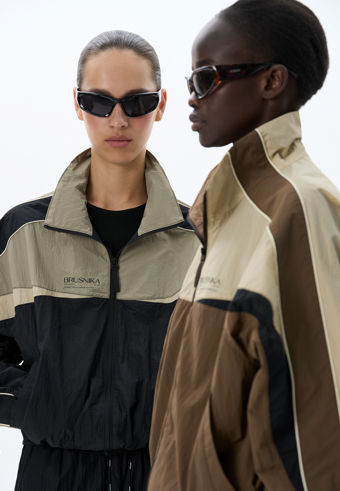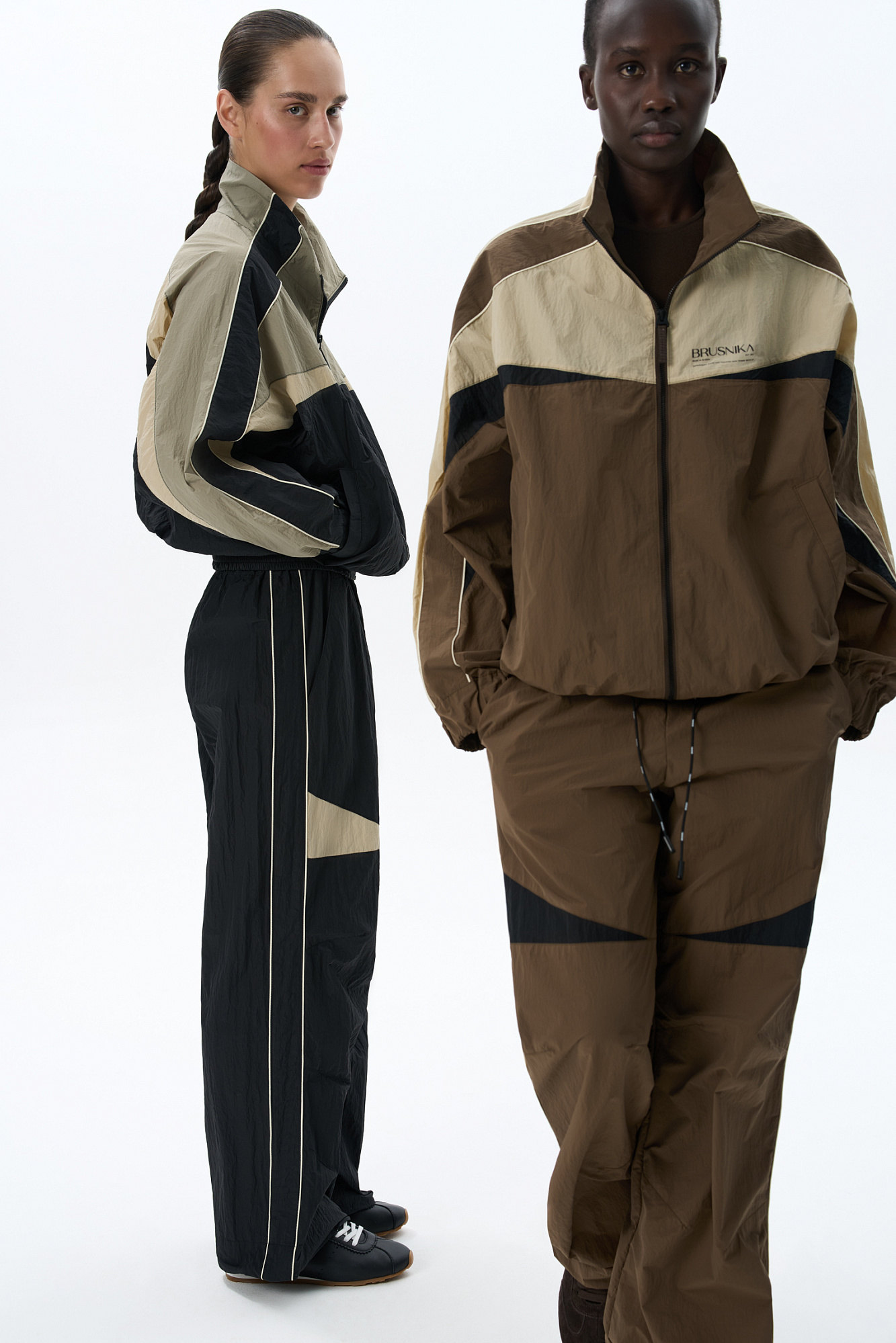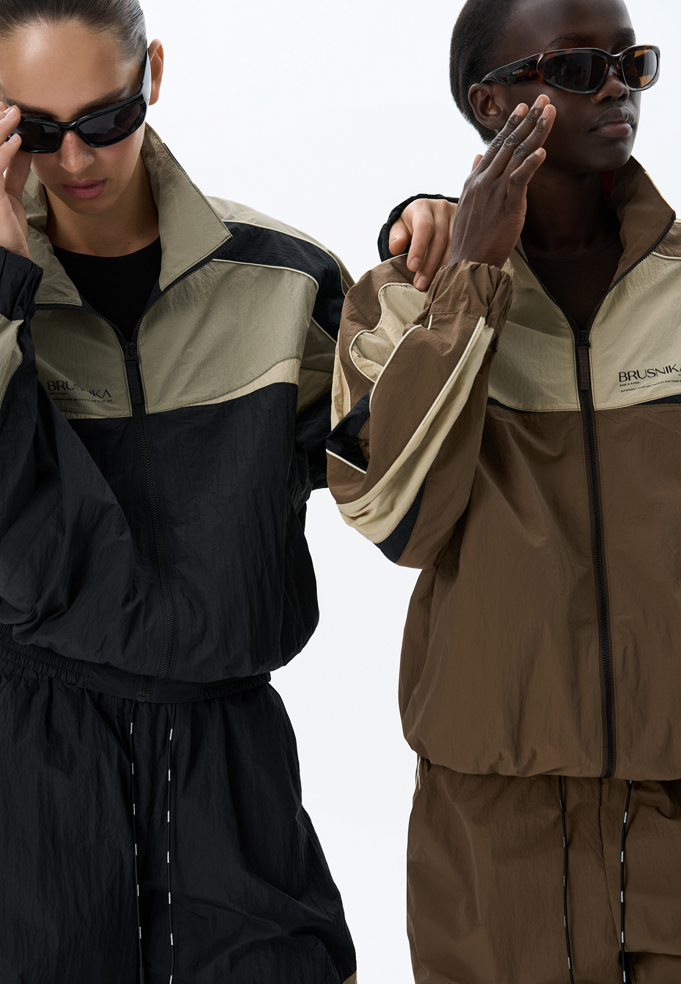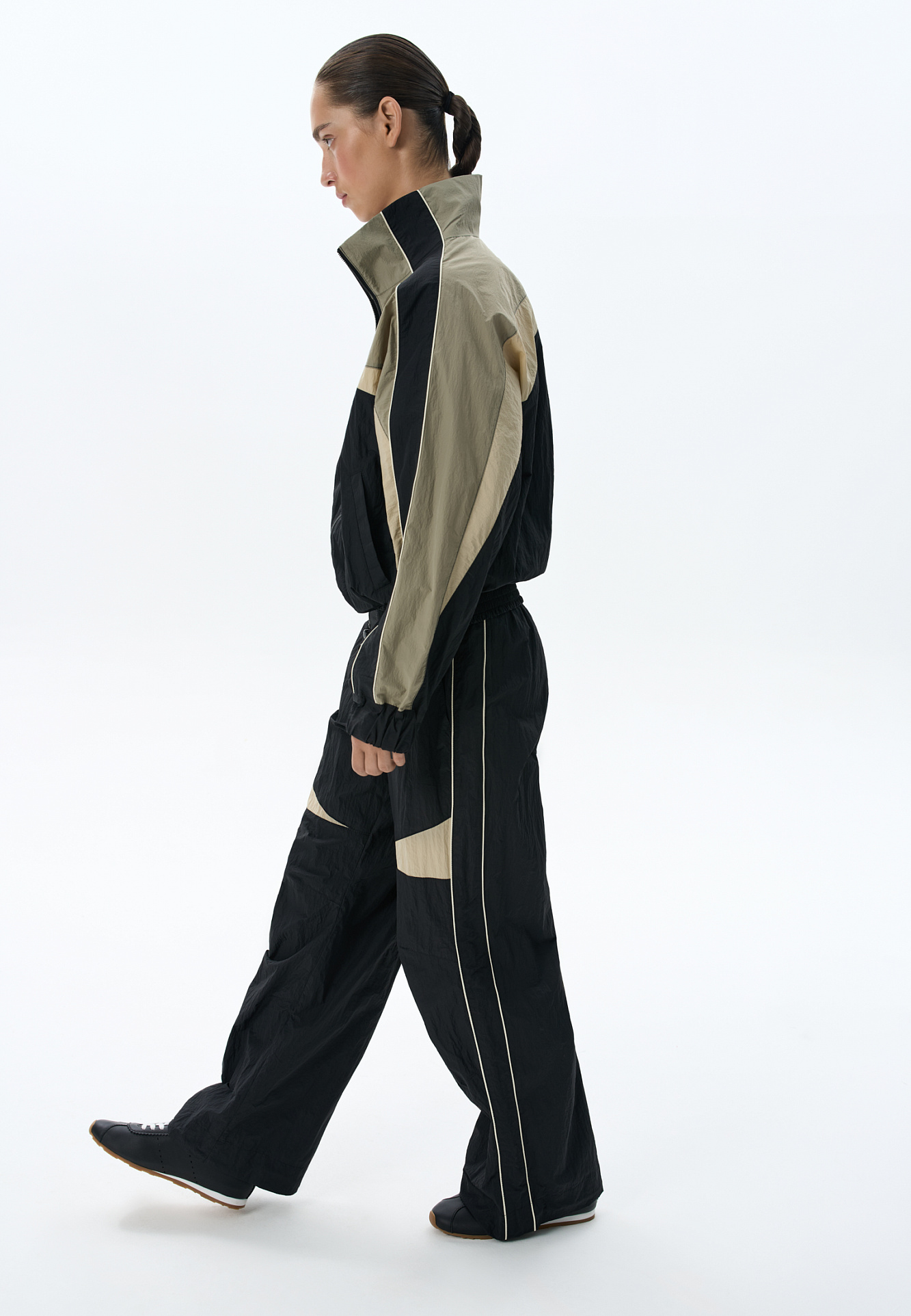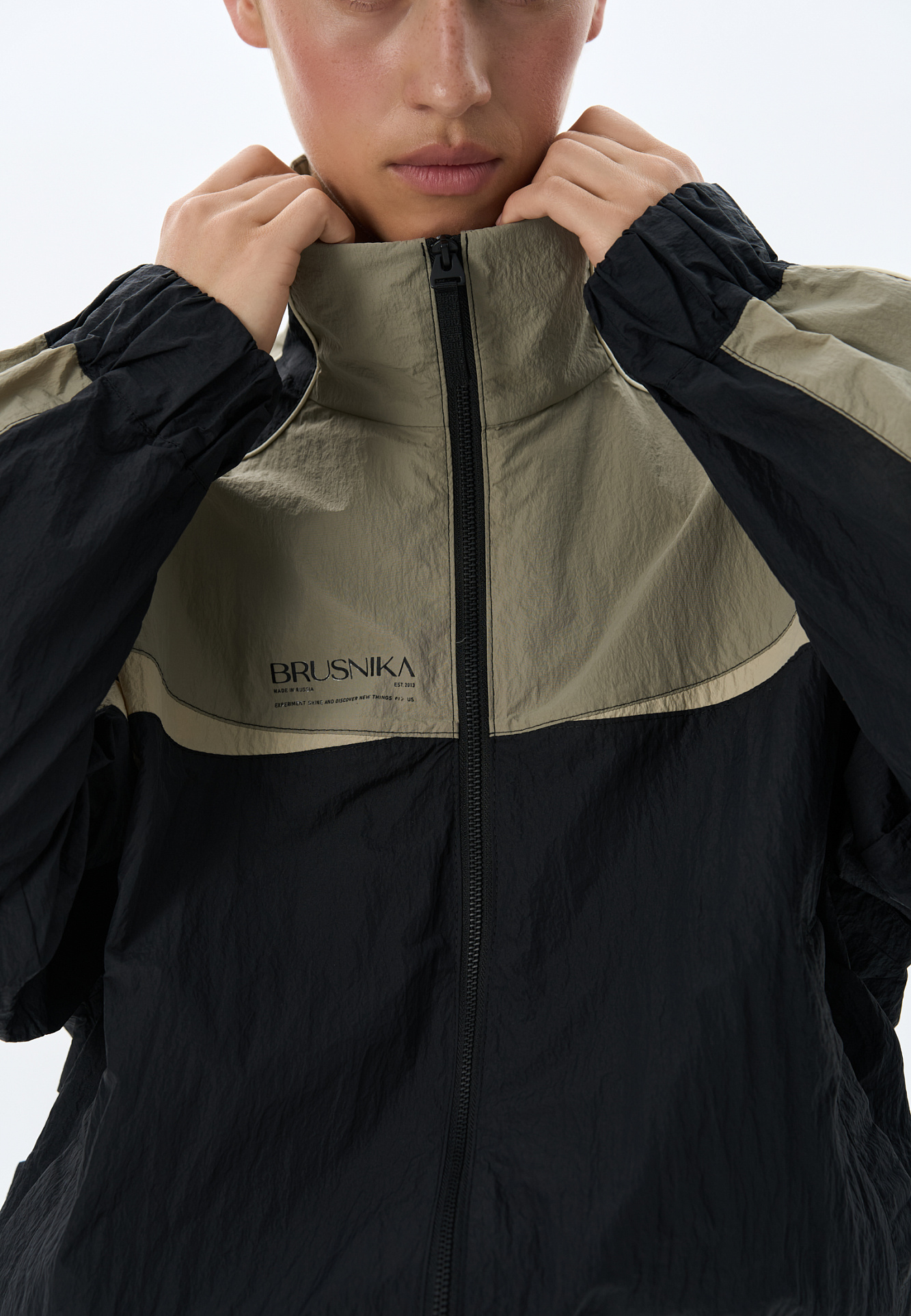 Олимпийка-колорблок из нейлона. Модель свободного кроя, с воротником-стойкой и боковыми карманами. Манжеты рукавов и низ изделия выполнен на резинке. Застежка на молнию. Логотип бренда на спине и груди. Дополнить образ можно брюками в таком же стиле.