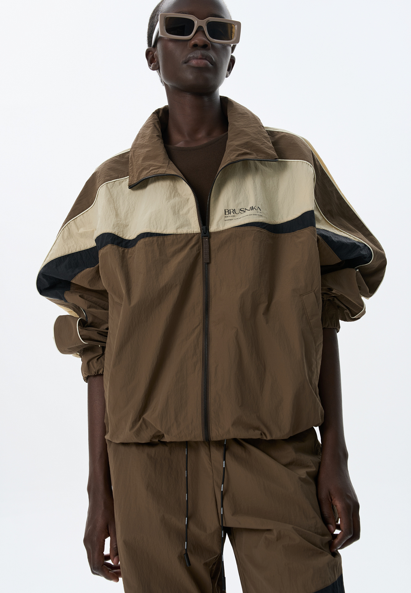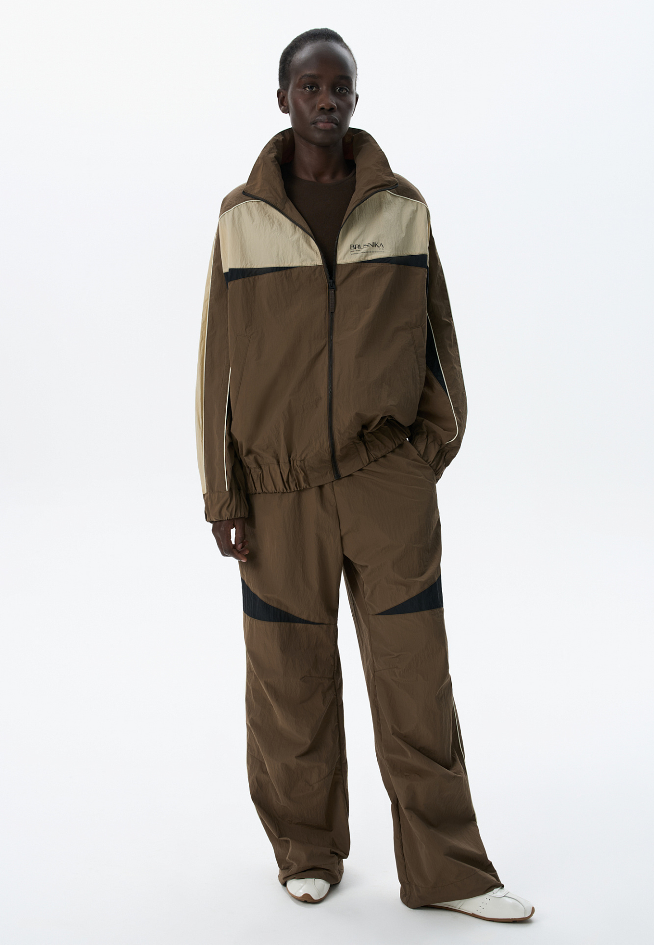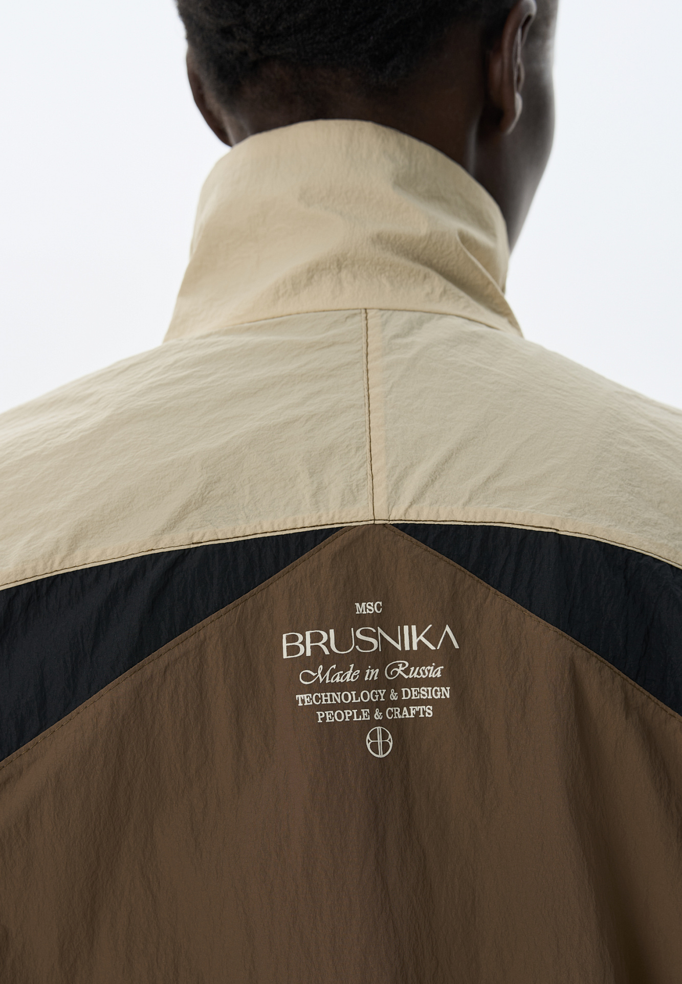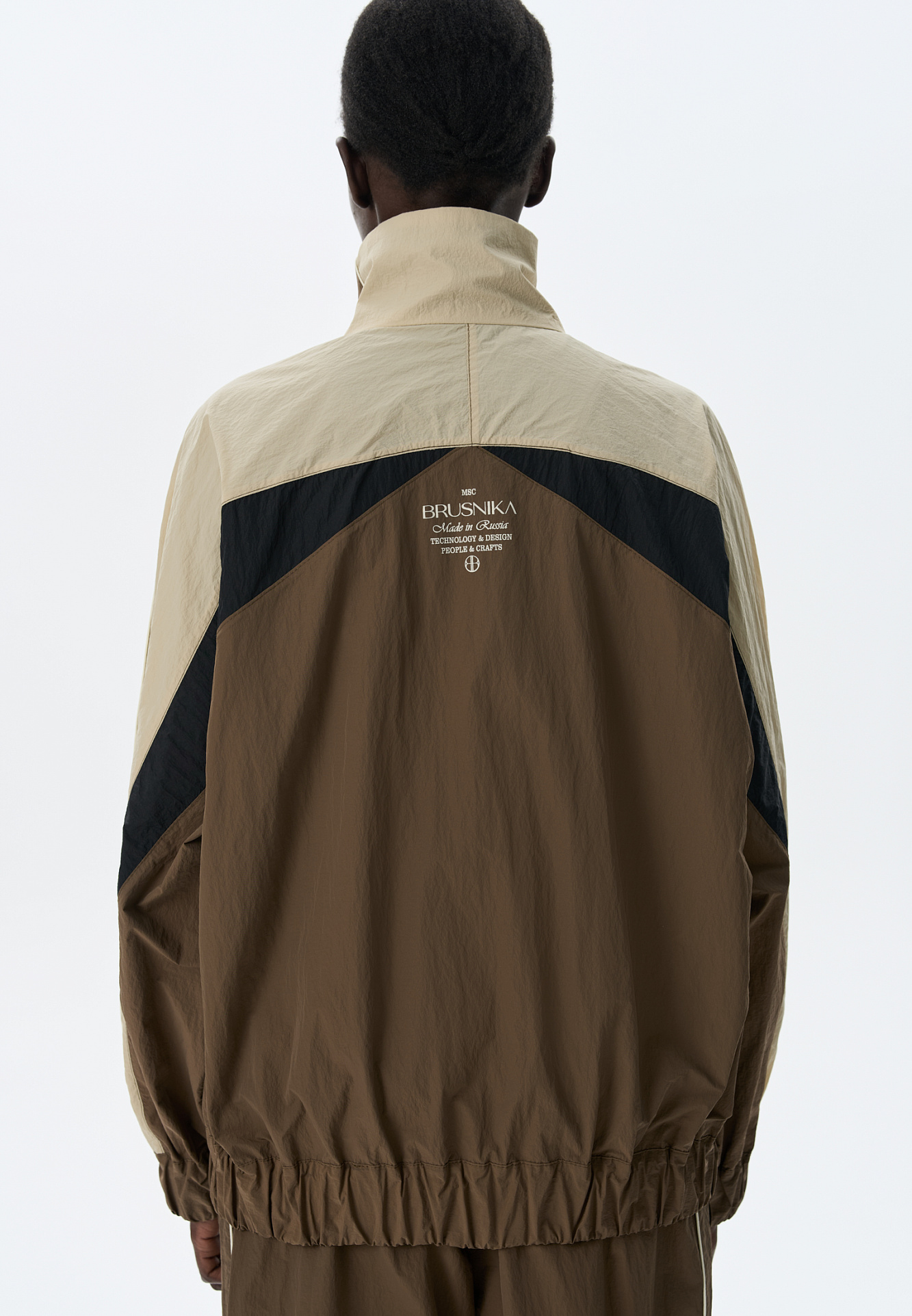 Олимпийка-колорблок из нейлона. Модель свободного кроя, с воротником-стойкой и боковыми карманами. Манжеты рукавов и низ изделия выполнен на резинке. Застежка на молнию. Логотип бренда на спине и груди. Дополнить образ можно брюками в таком же стиле.