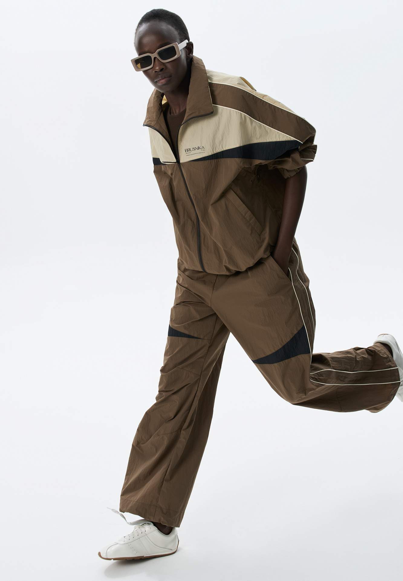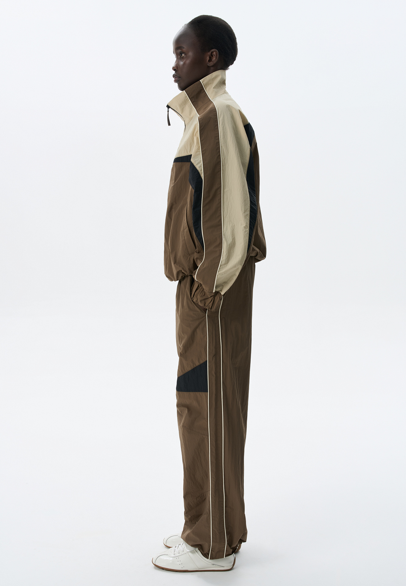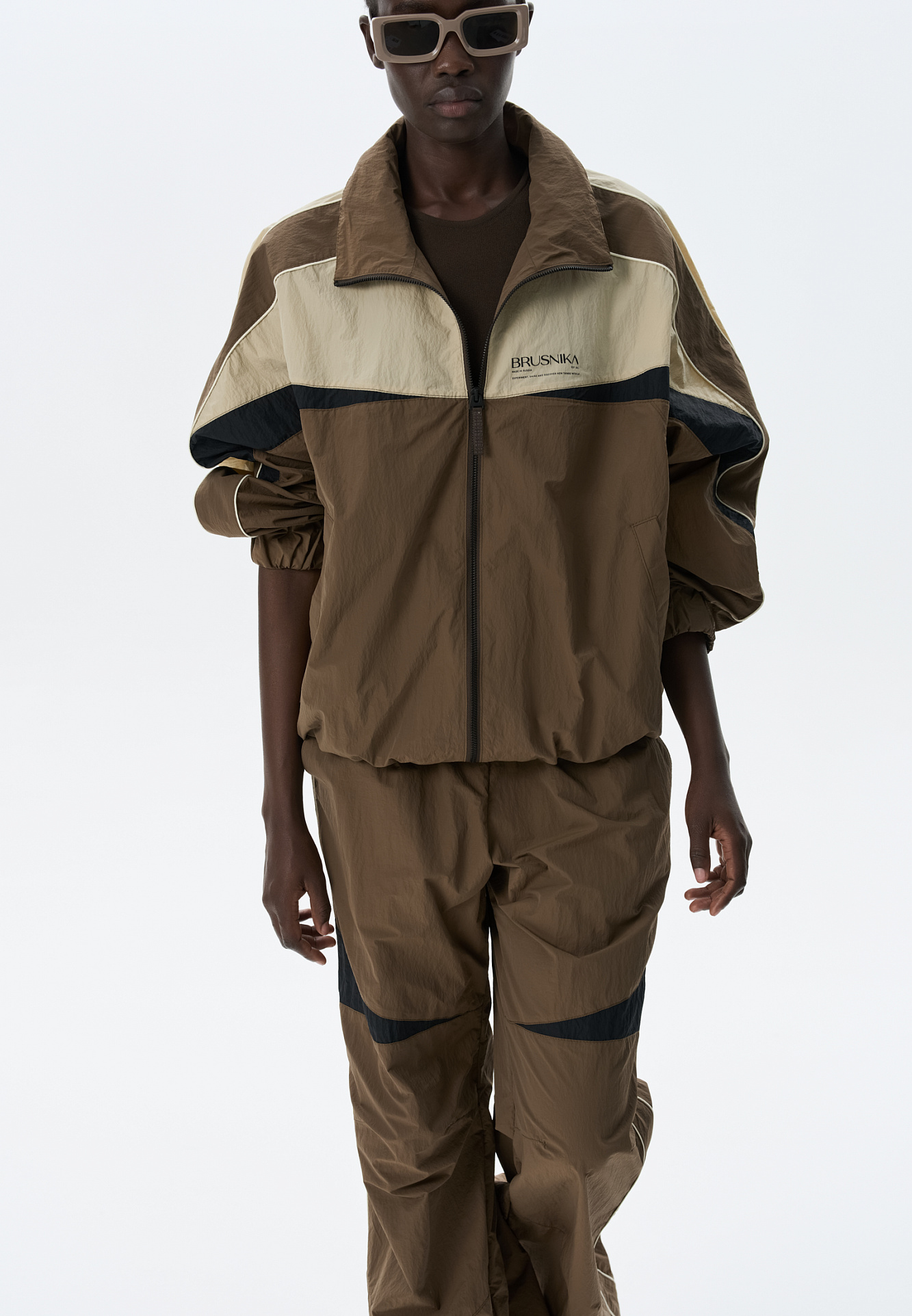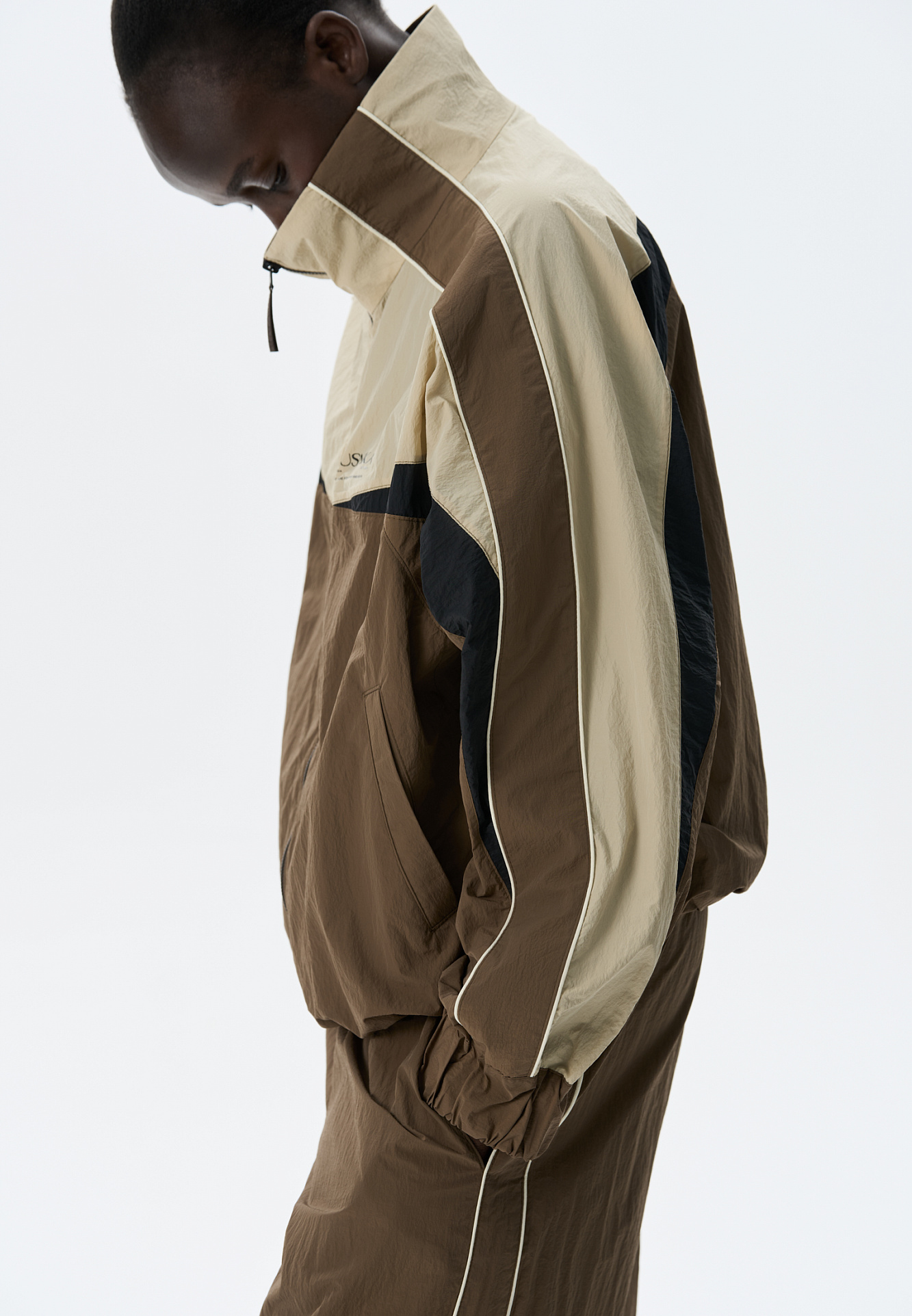 Олимпийка-колорблок из нейлона. Модель свободного кроя, с воротником-стойкой и боковыми карманами. Манжеты рукавов и низ изделия выполнен на резинке. Застежка на молнию. Логотип бренда на спине и груди. Дополнить образ можно брюками в таком же стиле.