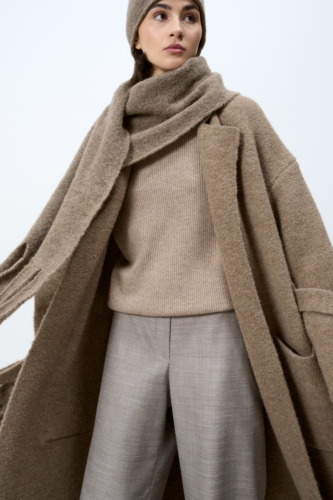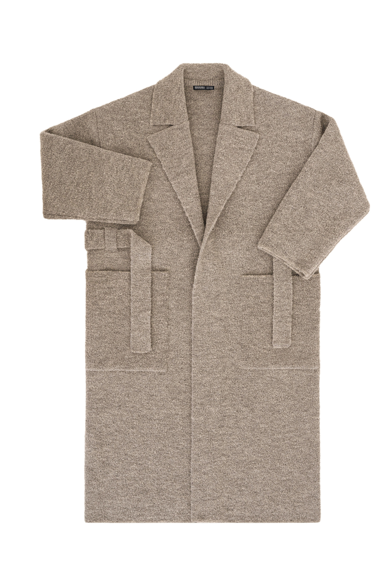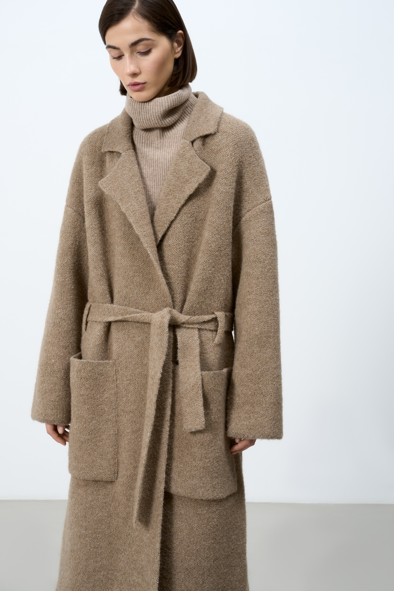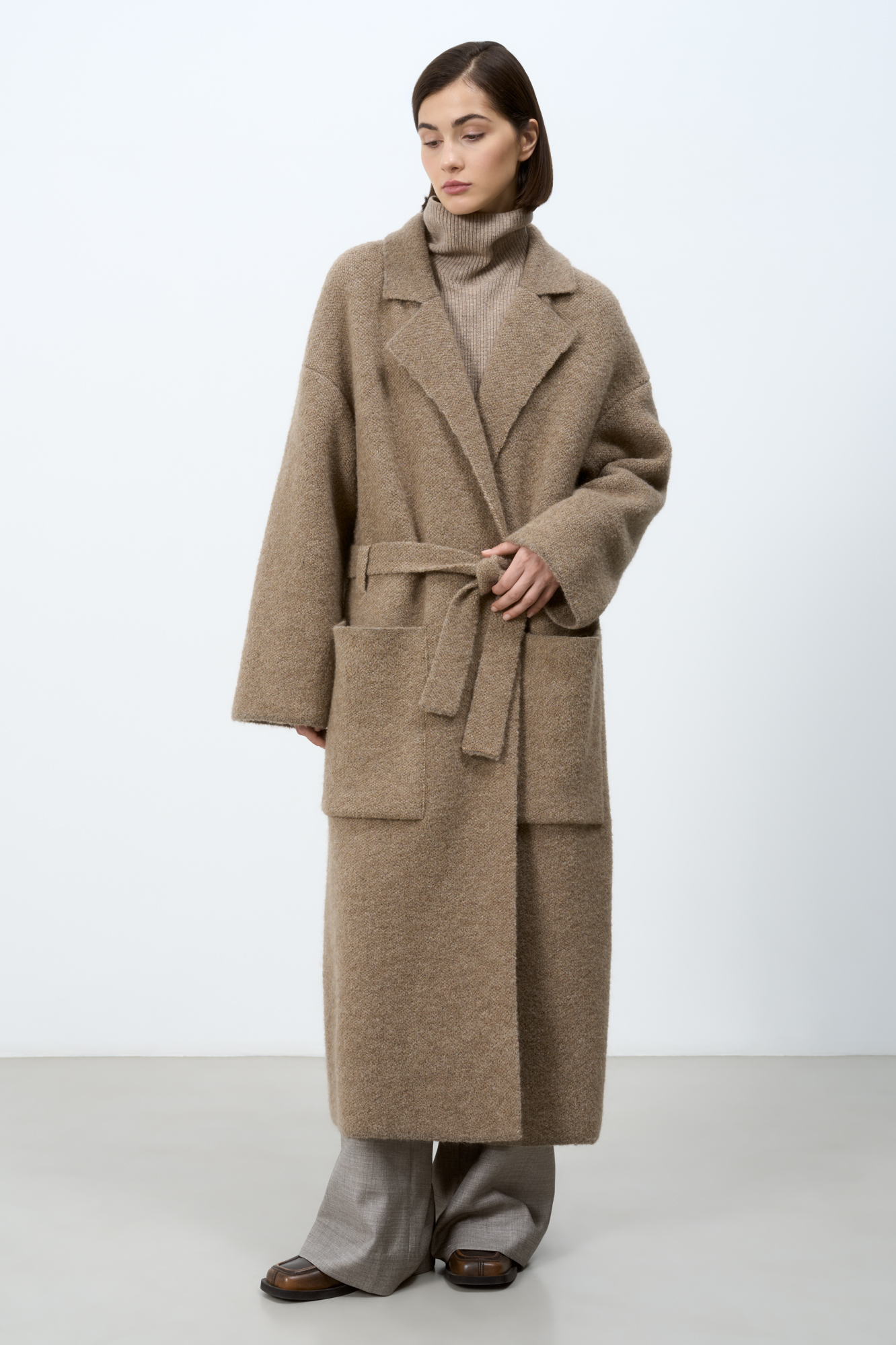 Трикотажное пальто на запах из смесовой шерсти с поясом в тон. Модель свободного силуэта со спущенной линией плеча и накладными карманами. Отложной воротник с прямоугольными лацканами. Изделие без подкладки. Дополнить образ можно шарфом и шапкой в тон.