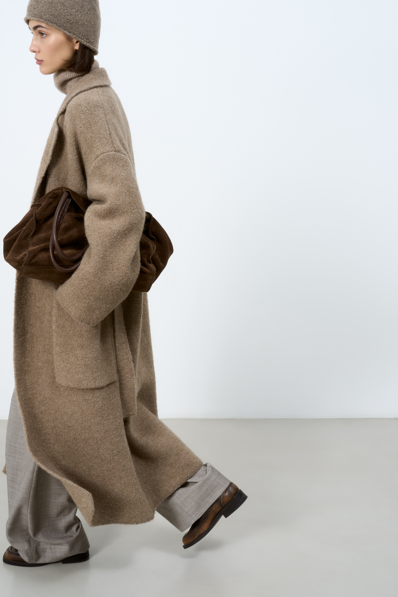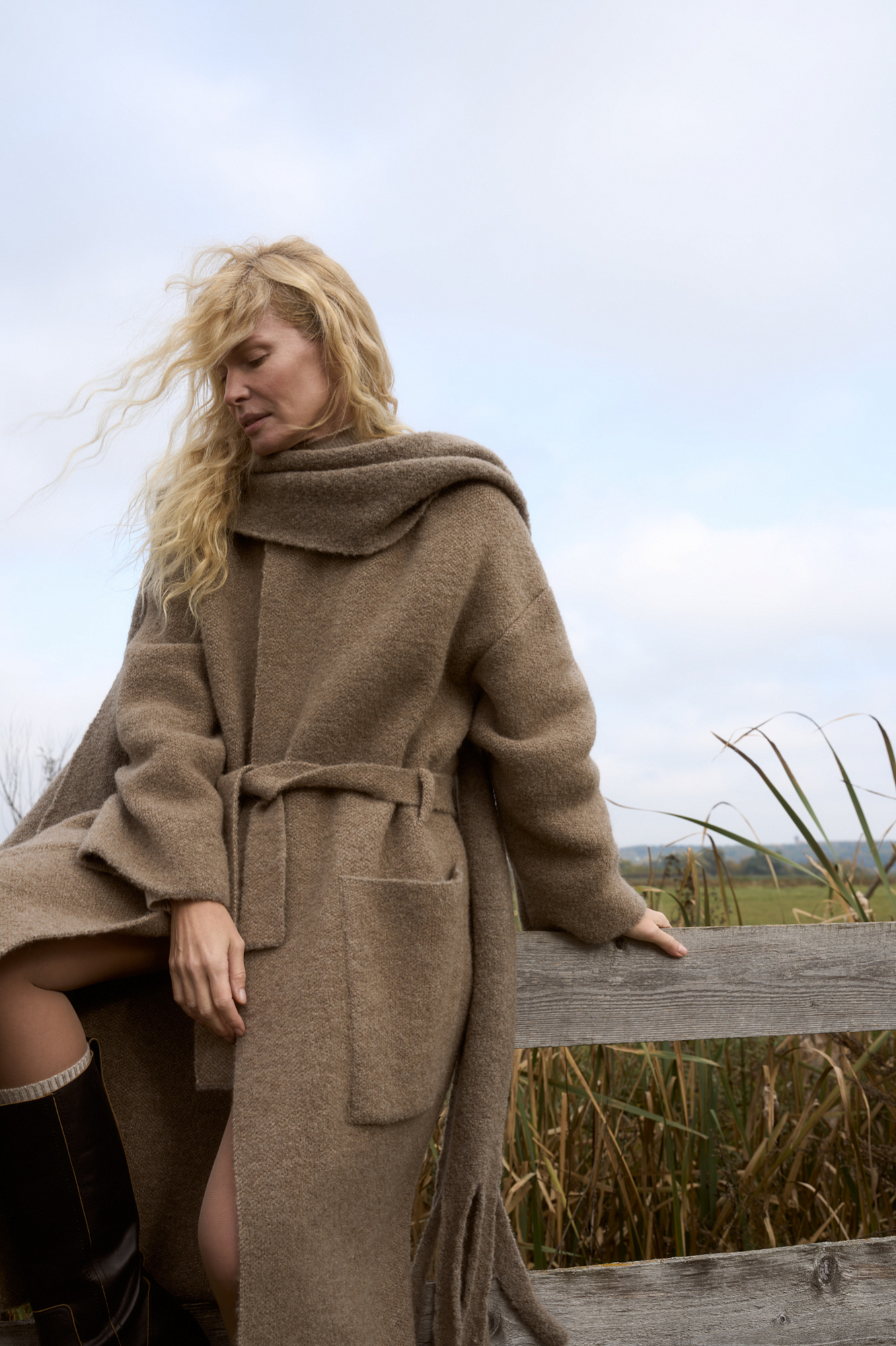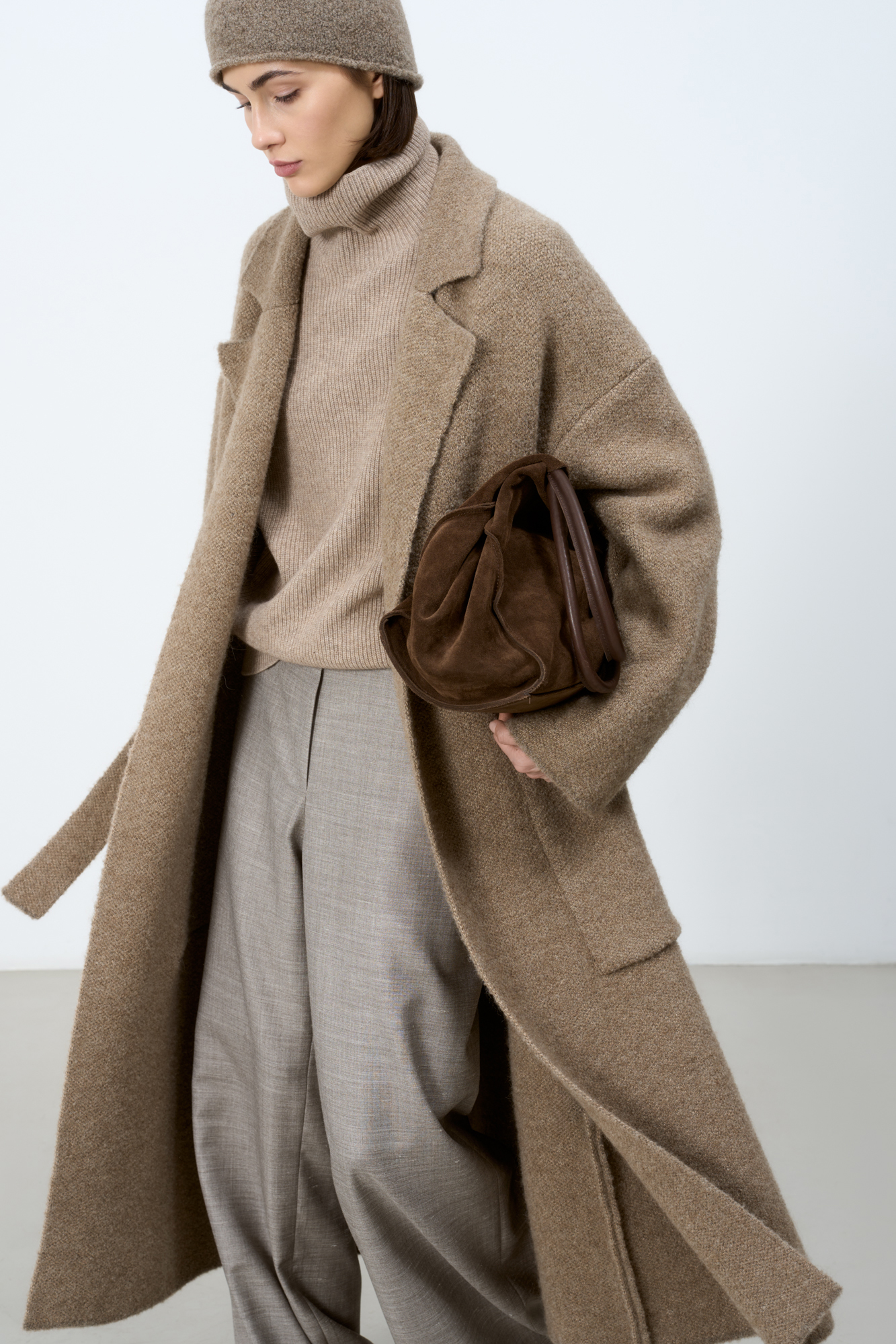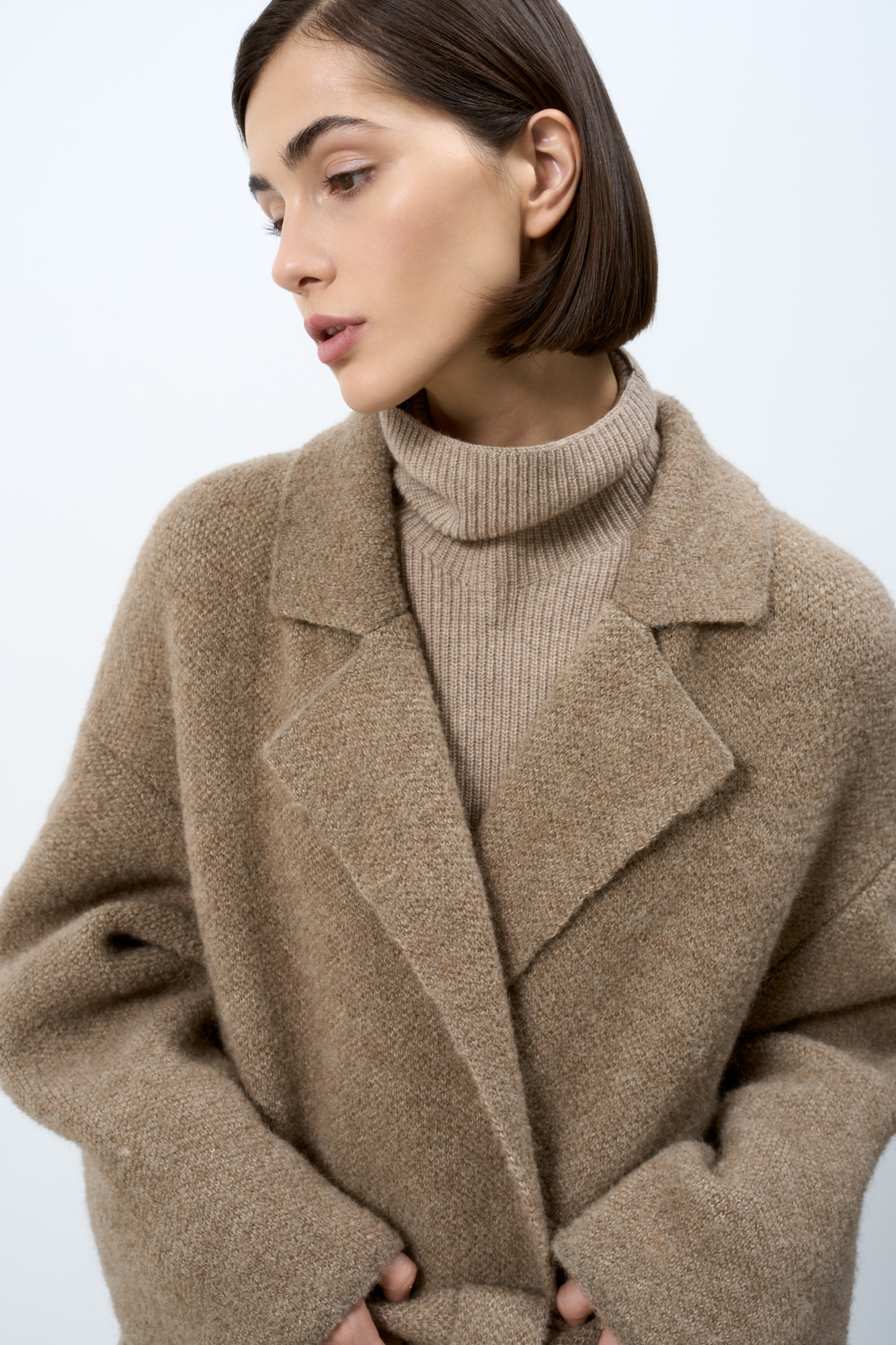 Трикотажное пальто на запах из смесовой шерсти с поясом в тон. Модель свободного силуэта со спущенной линией плеча и накладными карманами. Отложной воротник с прямоугольными лацканами. Изделие без подкладки. Дополнить образ можно шарфом и шапкой в тон.