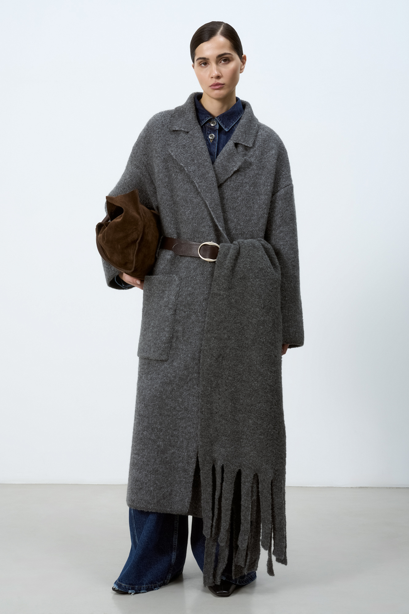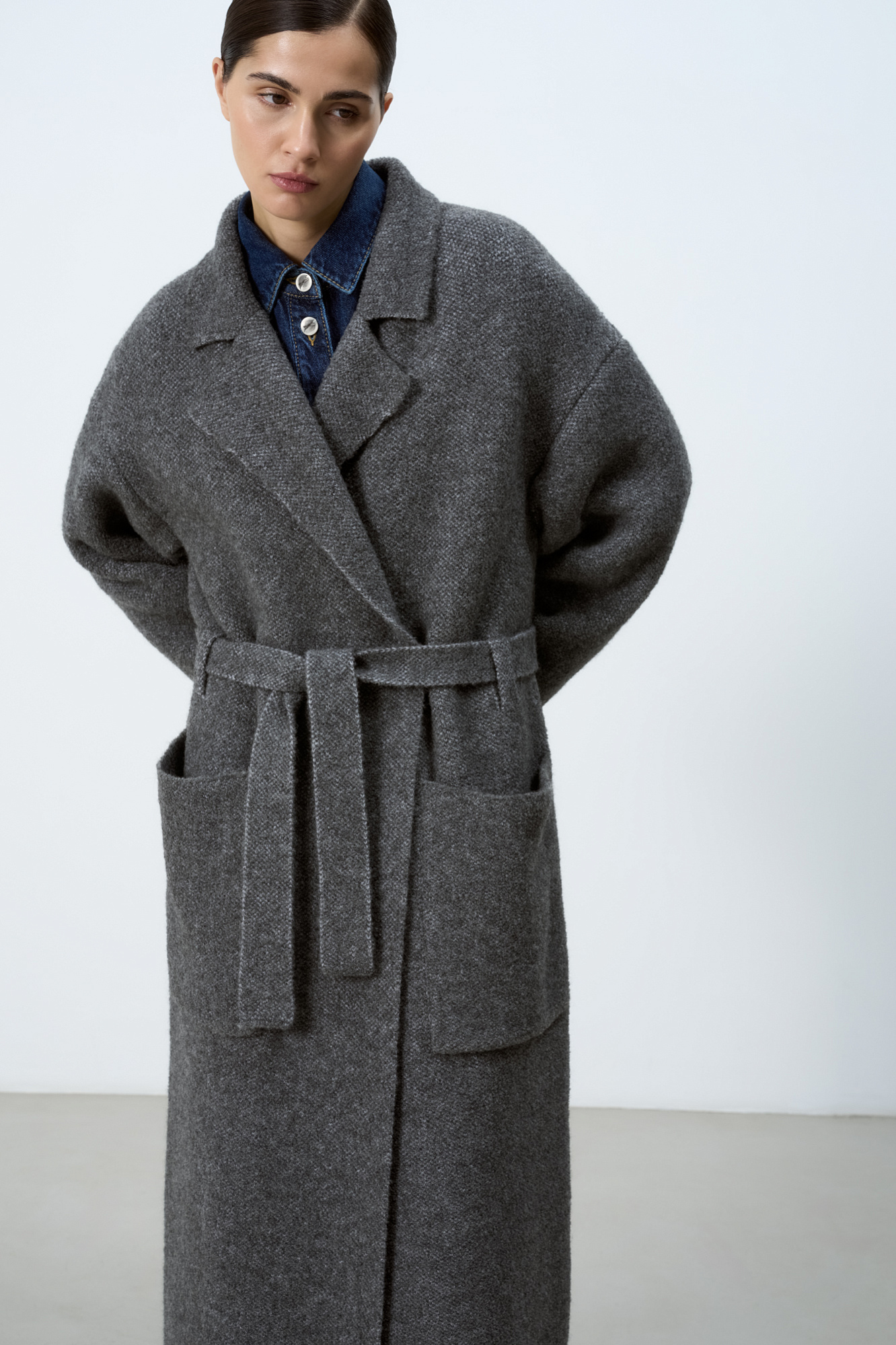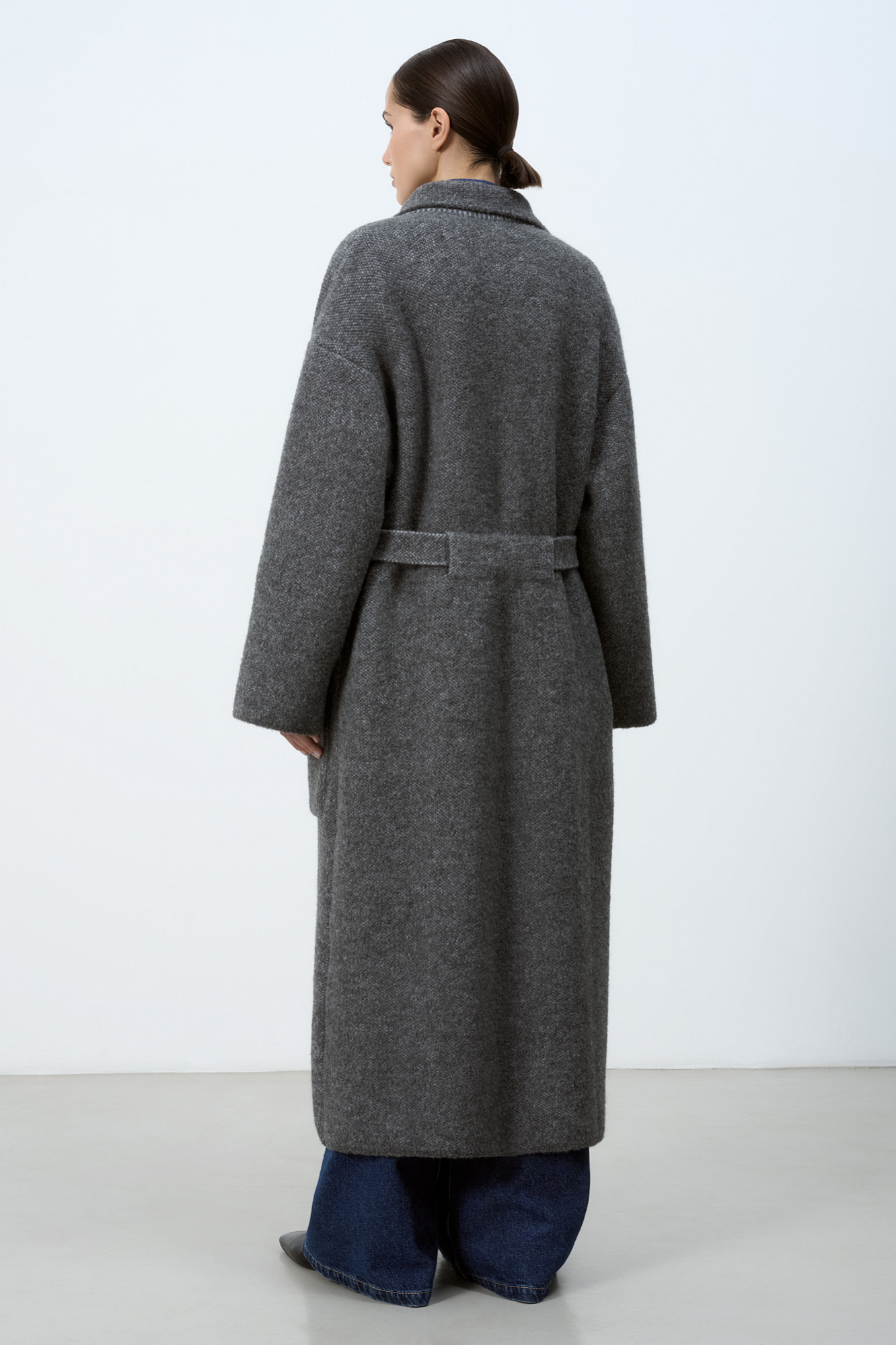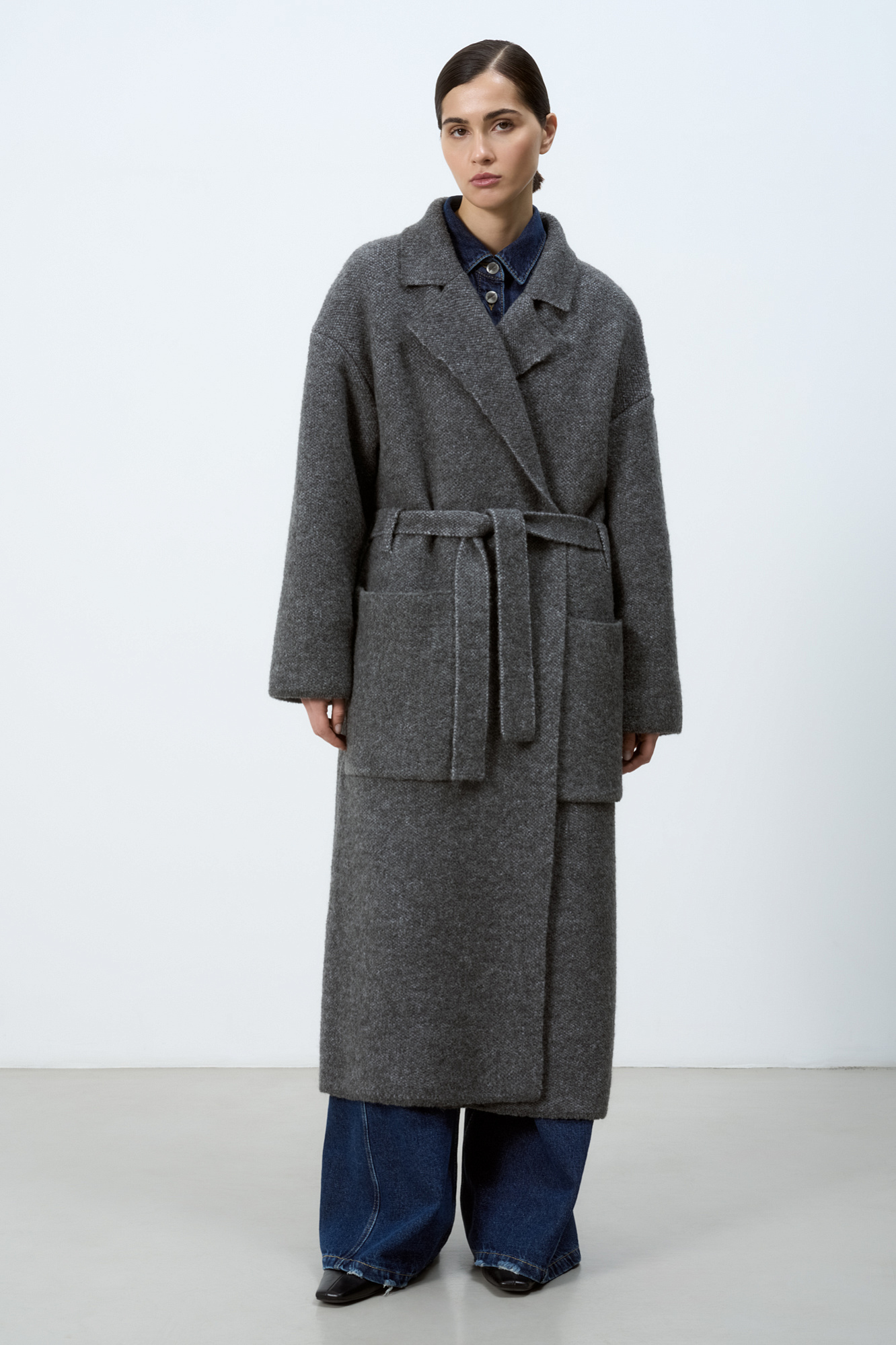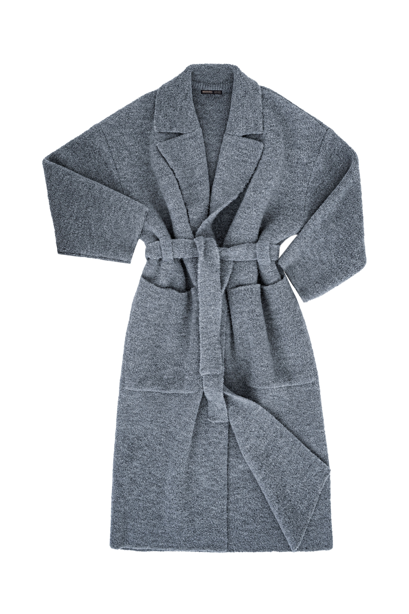 Трикотажное пальто на запах из смесовой шерсти с поясом в тон. Модель свободного силуэта со спущенной линией плеча и накладными карманами. Отложной воротник с прямоугольными лацканами. Изделие без подкладки. Дополнить образ можно шарфом и шапкой в тон.
